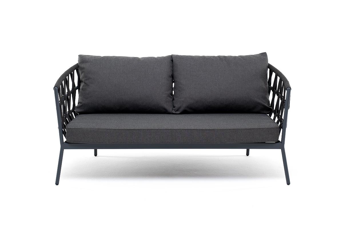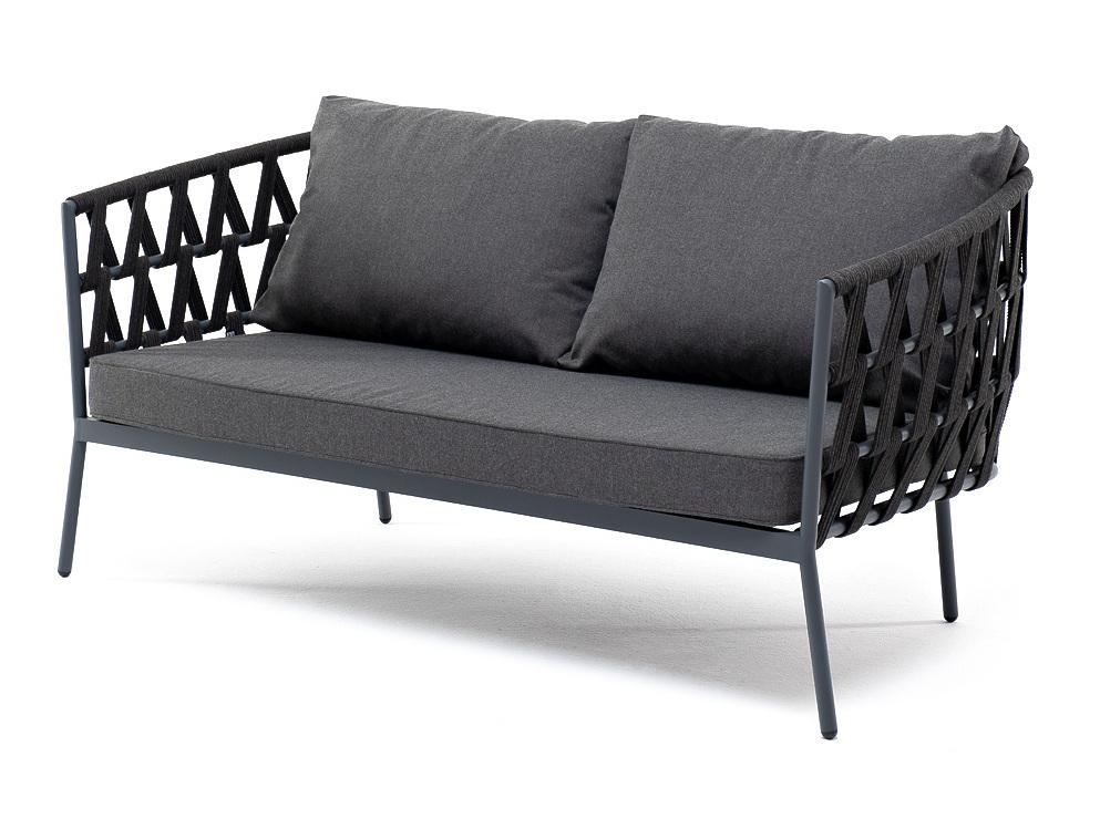 Двухместный диван «Диего» с подушками в комплекте. Диван имеет алюминиевый каркас, окрашенный порошковой краской в темно-серый (RAL7024) цвет. Боковины каркаса и спинка вручную оплетены роупом - эластичными синтетическими лентами, изготовленными из высокопрочных полиэфирных волокон. Цвет оплетки - темно-серый. Подушки состоят из наполнителя и съёмных чехлов, которые обработаны влагоотталкивающей пропиткой темно-серого цвета. Материал - 100% полиэстер, плотностью 300гр/м2. Размер плетеного ди