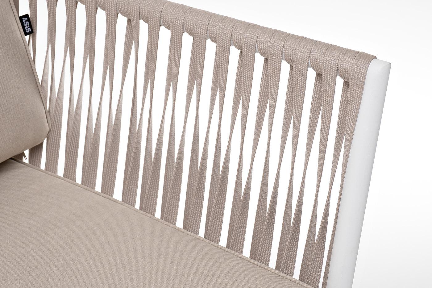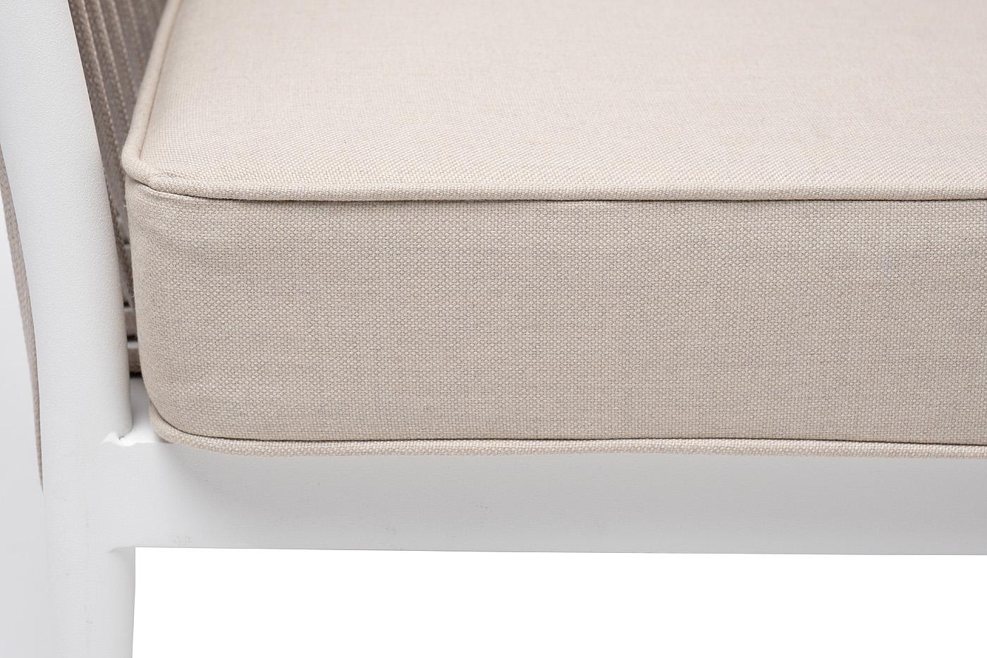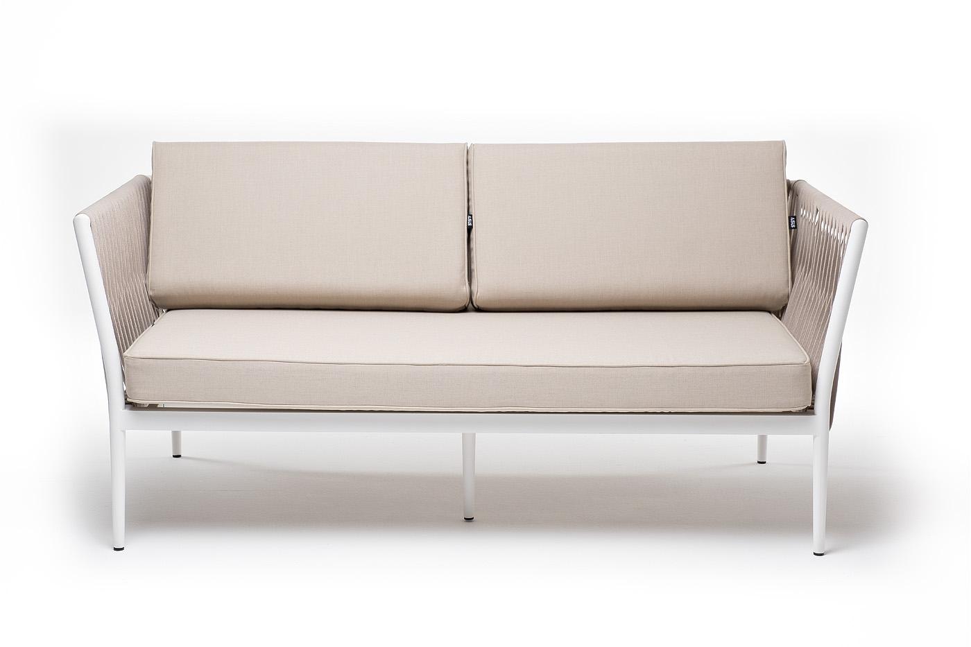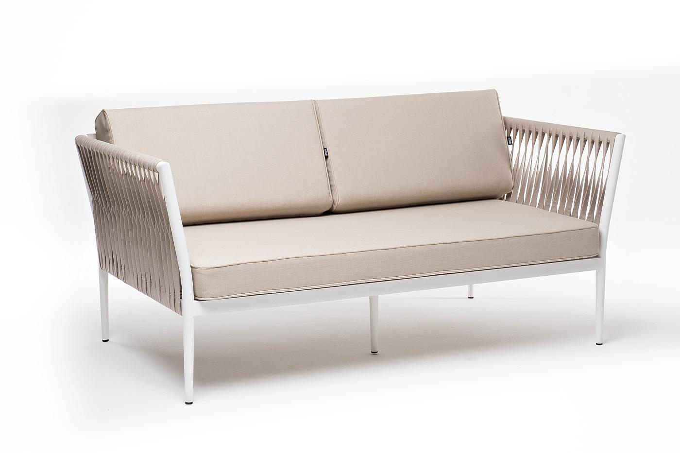 Диван 4SIS "Касабланка" диван 2-местный плетеный из роупа, каркас алюминий белый муар, роуп бежевый 20мм, ткань бежевая 15052 арт. KAS-S-2-001 W Mua beige(beige15052)