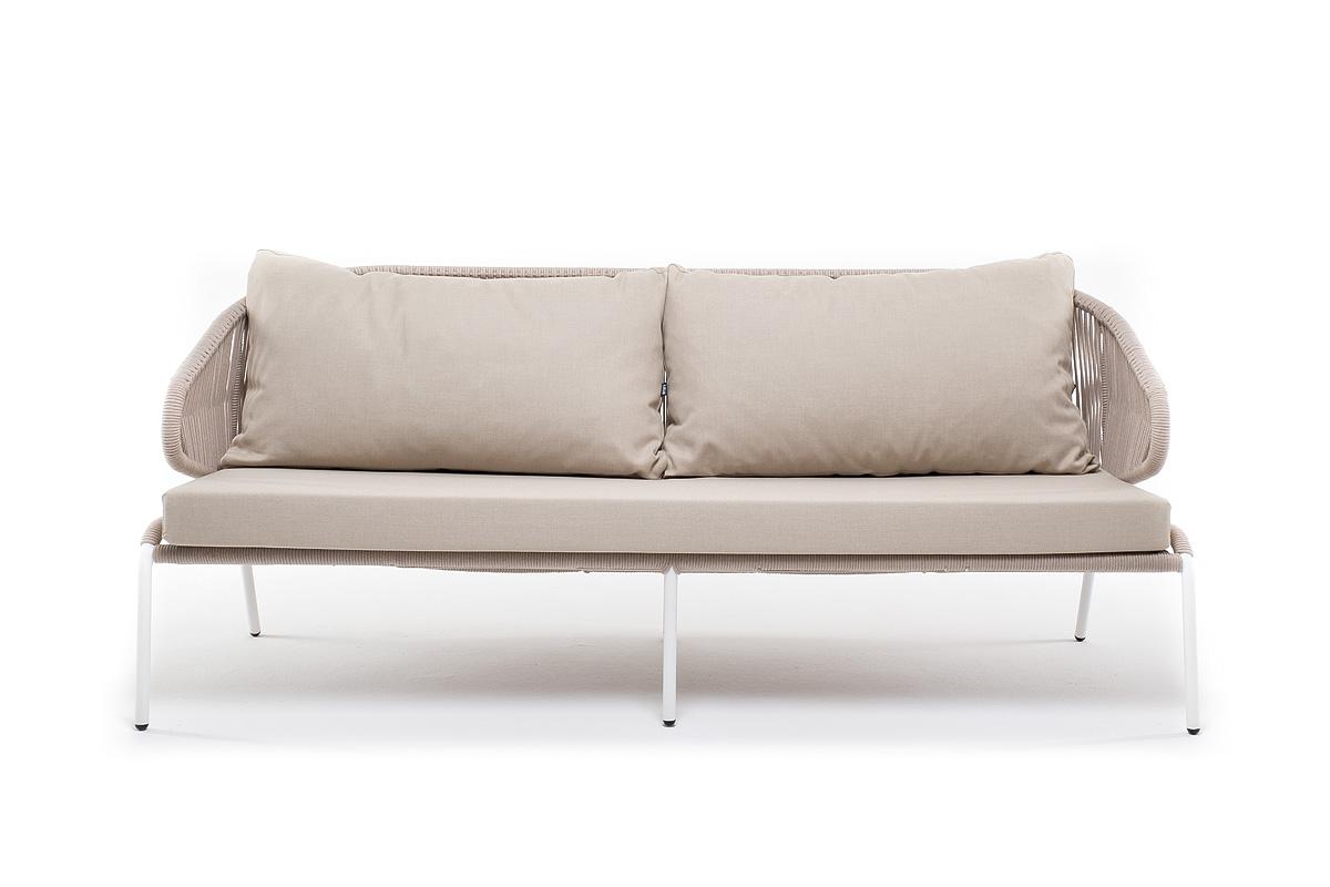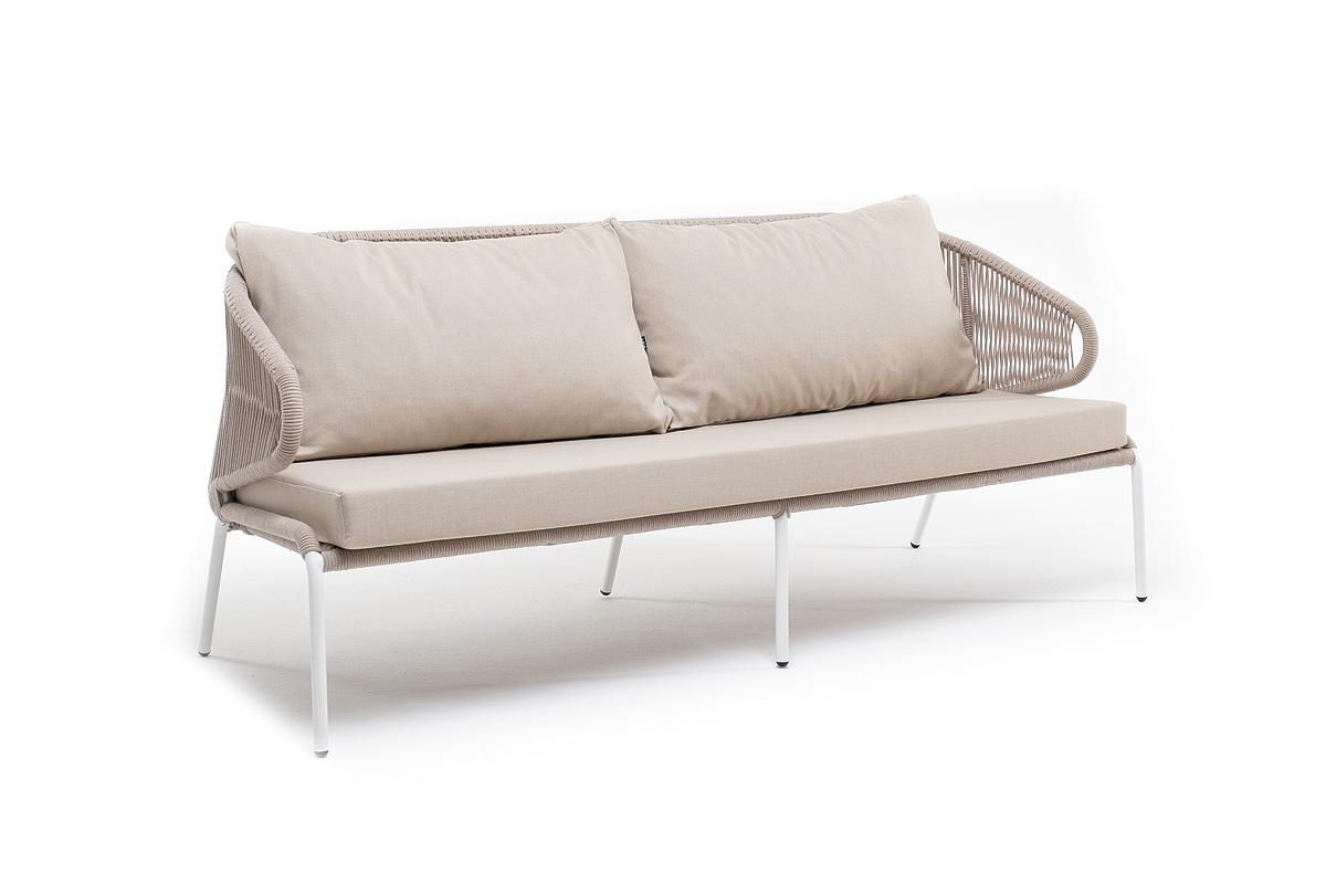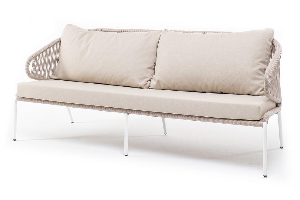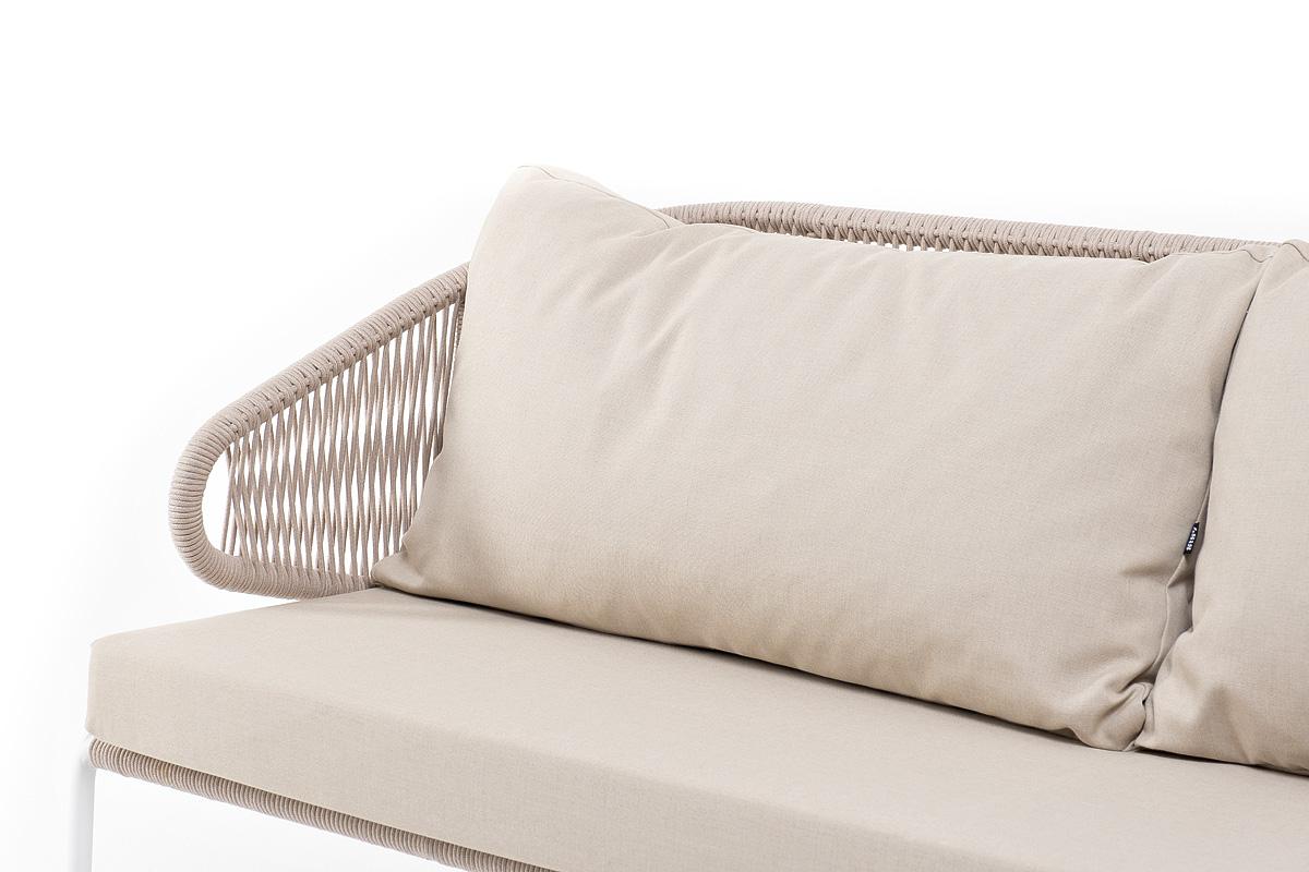 Диван 4SIS "Милан" диван 3-местный плетеный из роупа, каркас алюминий белый муар, роуп бежевый круглый, ткань бежевая 052 арт. MIL-S-3-001 W Mua beige(beige052)