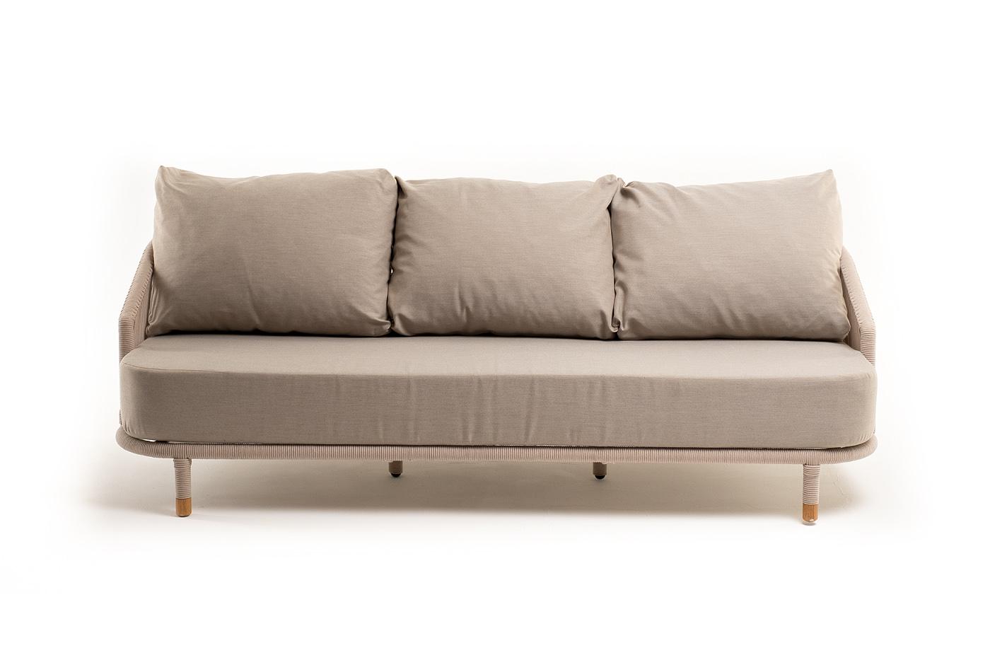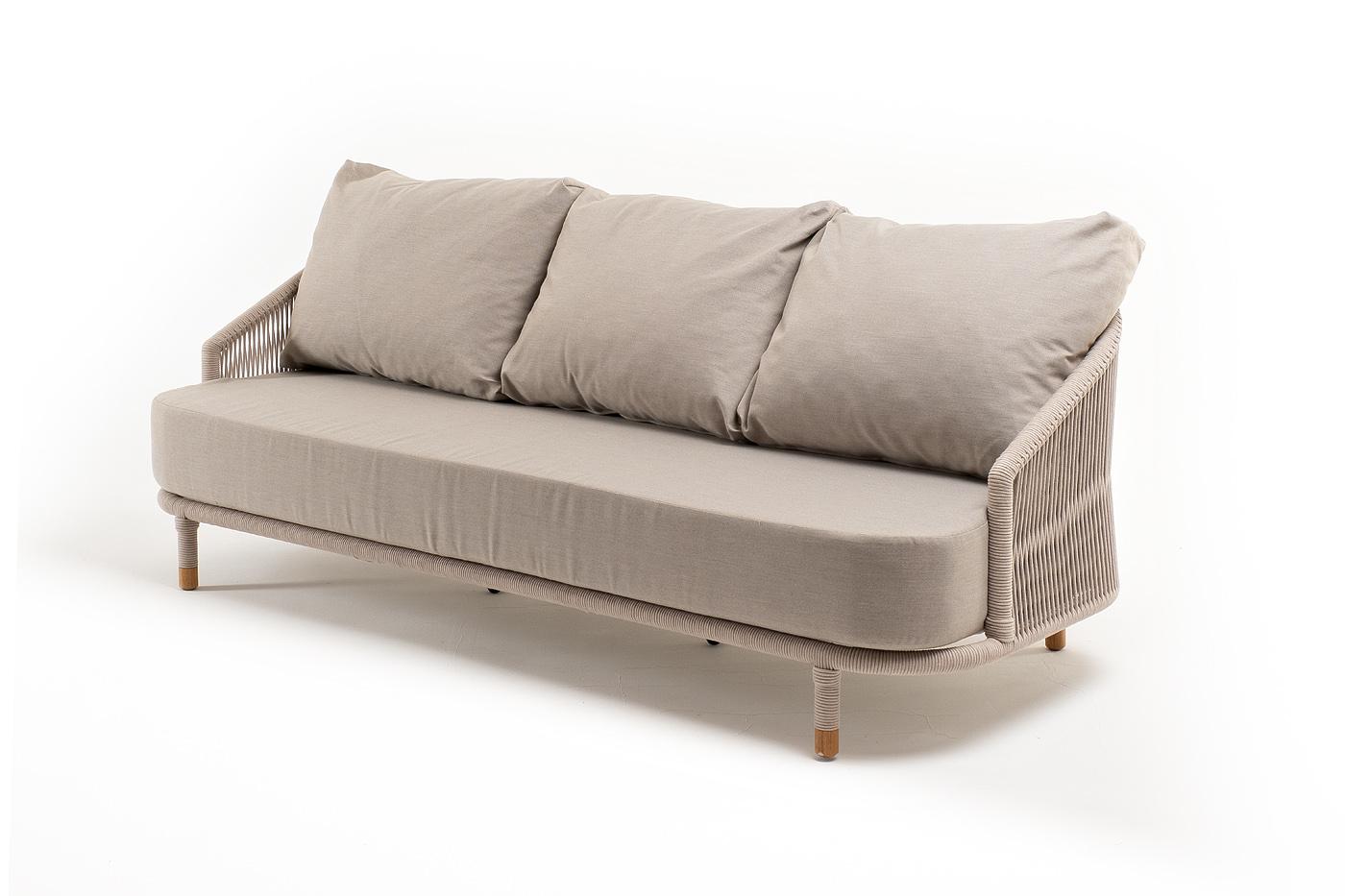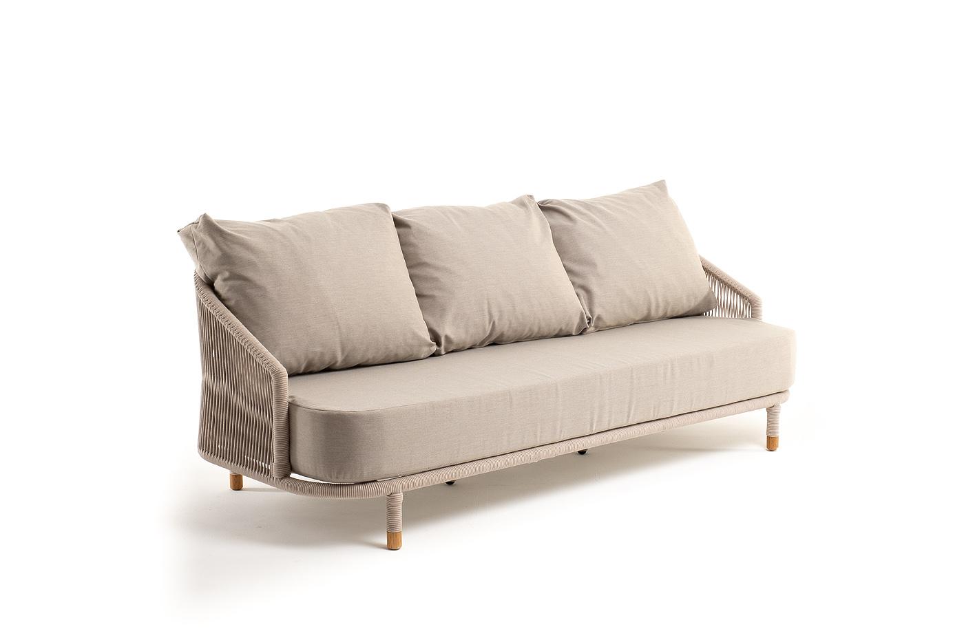Трехместный диван «Верона» с подушками в комплекте. Диван имеет алюминиевый каркас, окрашенный порошковой краской в белый цвет. Боковины каркаса и спинка вручную оплетены роупом - эластичными синтетическими лентами, изготовленными из высокопрочных полиэфирных волокон. Цвет оплетки в тон каркасу - бежевый. На ножках дивана идут дубовые наконечники (заглушки). Подушки состоят из наполнителя и съёмных чехлов. Материал - 100% полиэстер, плотностью 300гр/м2. Размер плетеного дивана: 2140×890×80