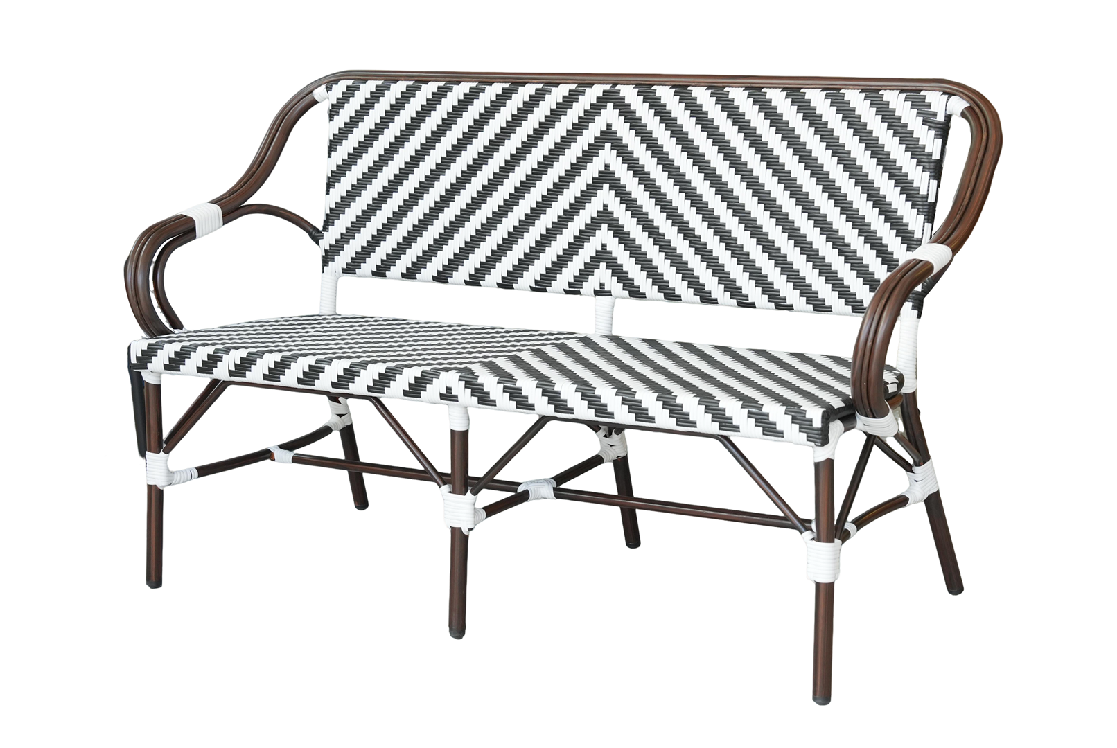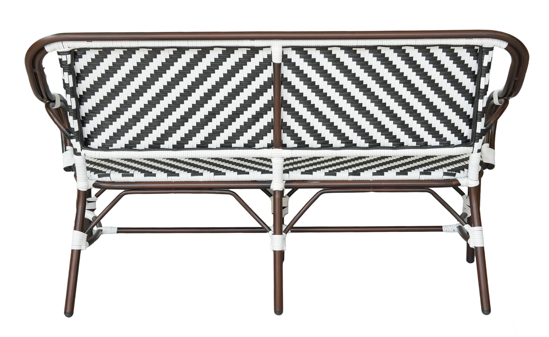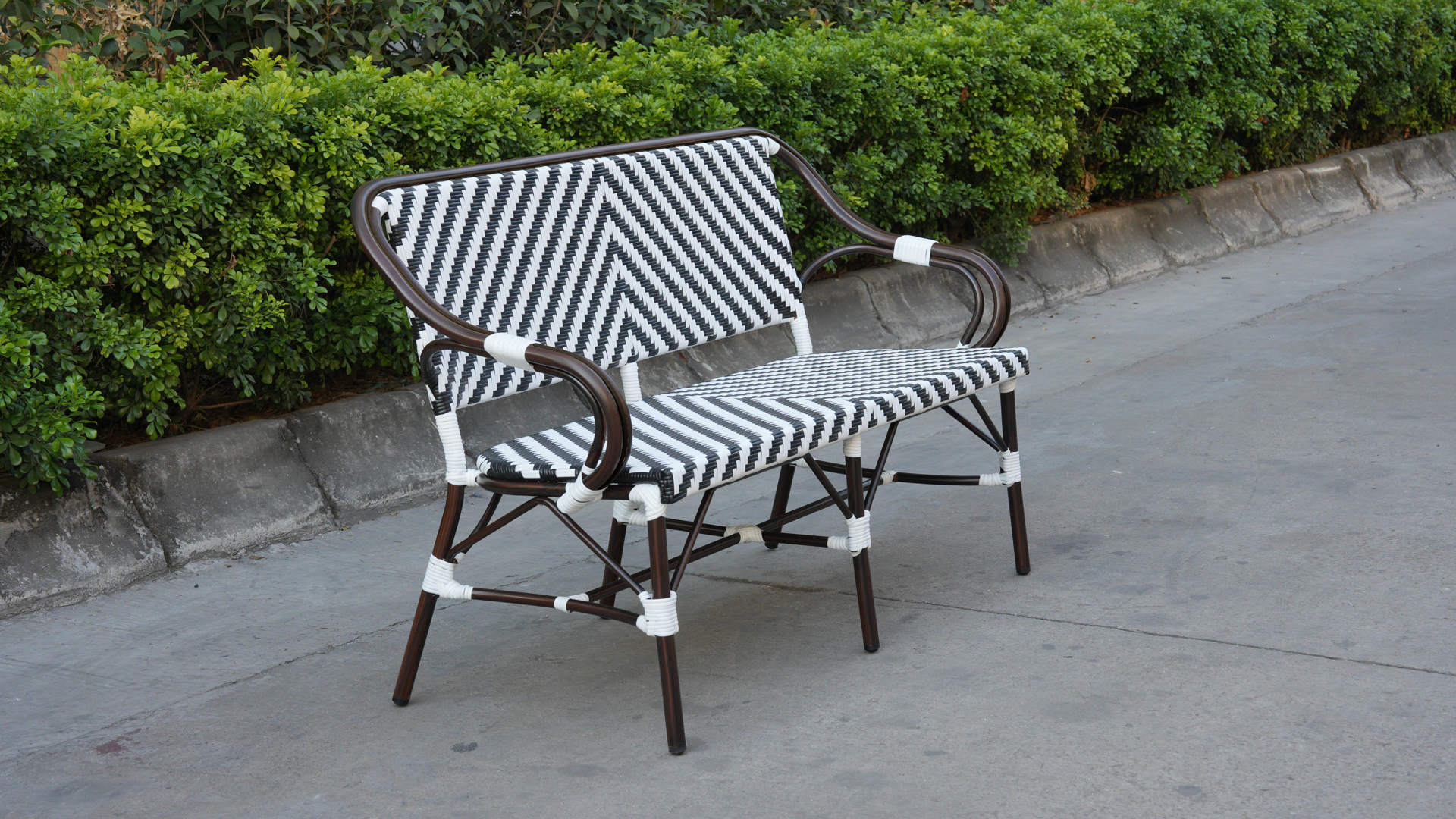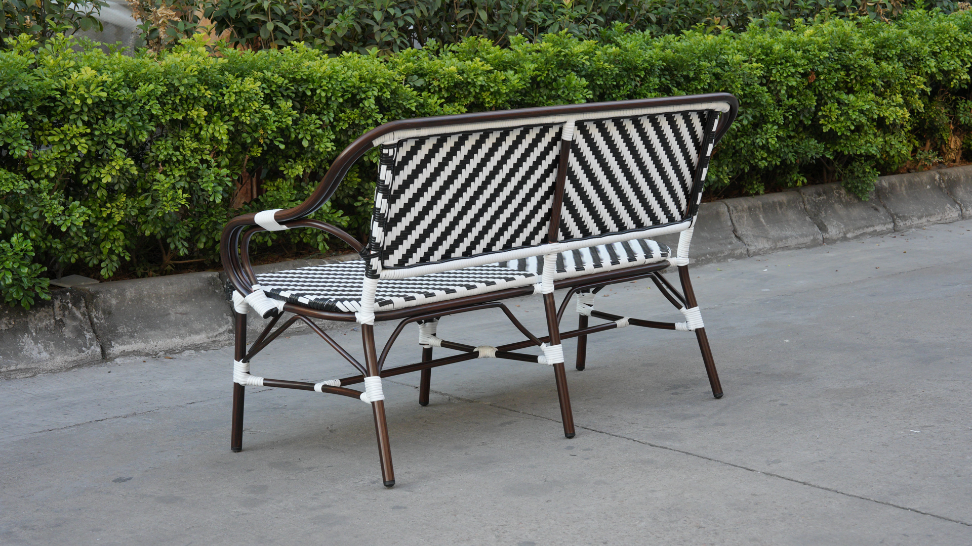 Диван двухместный «Капри» является ярким украшением вашего сада, веранды или террасы. Его можно использовать в помещении и на улице. Каркас выполнен из алюминия, окрашенного износостойкой краской бронзовый оттенка. Конструкция имеет изогнутую трубчатую опору диаметром 28×1,5 мм. Плетение выполнено вручную из плоского искусственного ротанга 12×1,3 мм. Цвет оплетки - черно-белый. Широкая спинка стула позволяет комфортно расположиться, а сидение расслабиться. Диван легко очищается от загрязнени