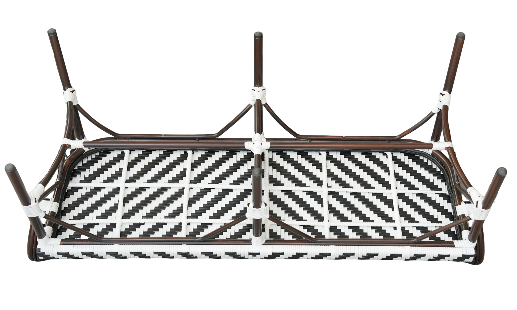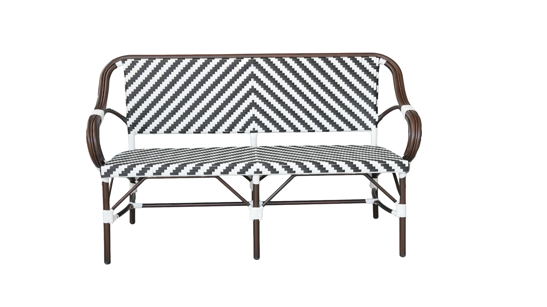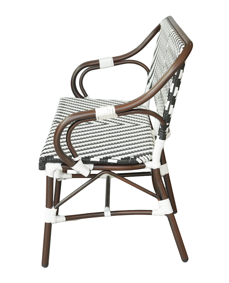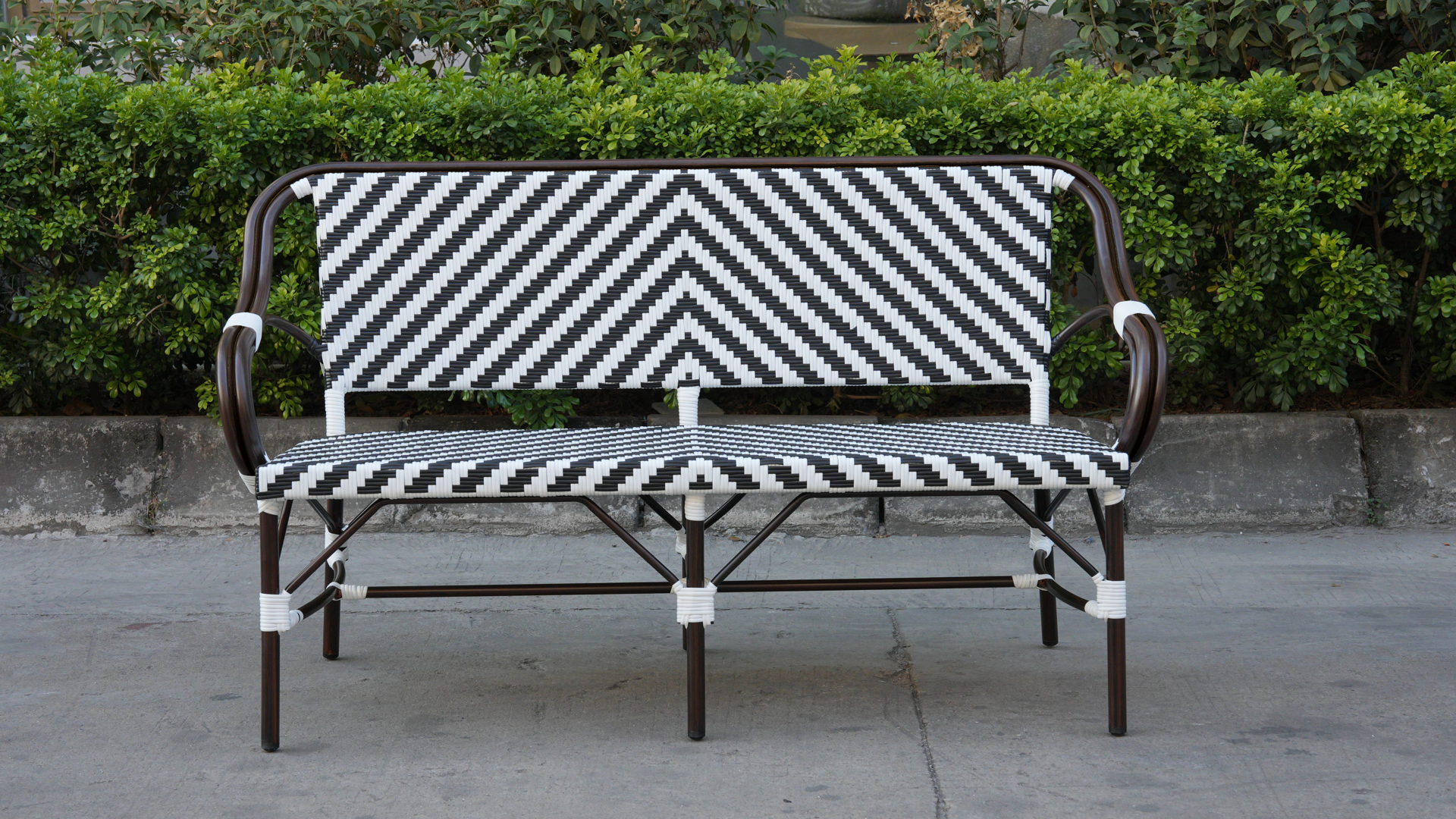 Диван двухместный «Капри» является ярким украшением вашего сада, веранды или террасы. Его можно использовать в помещении и на улице. Каркас выполнен из алюминия, окрашенного износостойкой краской бронзовый оттенка. Конструкция имеет изогнутую трубчатую опору диаметром 28×1,5 мм. Плетение выполнено вручную из плоского искусственного ротанга 12×1,3 мм. Цвет оплетки - черно-белый. Широкая спинка стула позволяет комфортно расположиться, а сидение расслабиться. Диван легко очищается от загрязнени