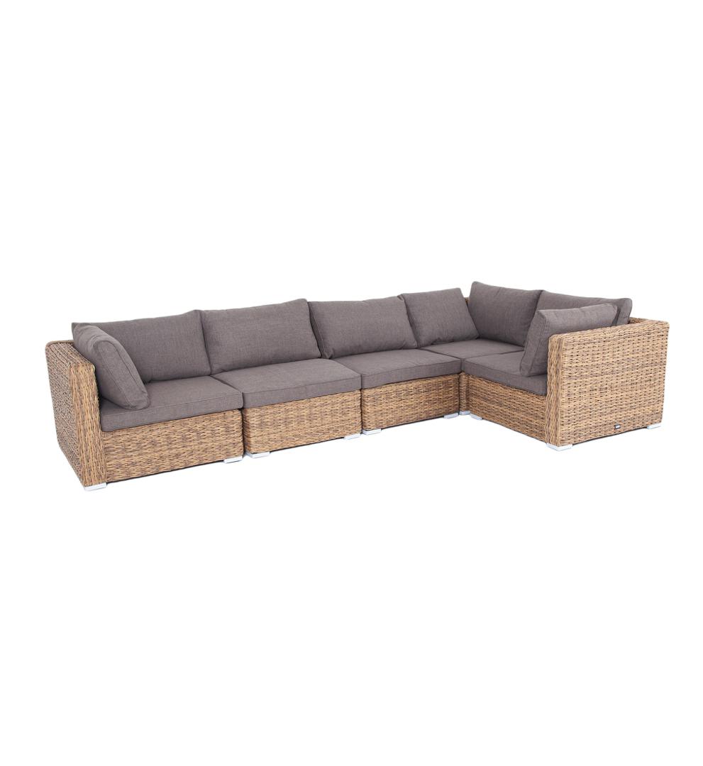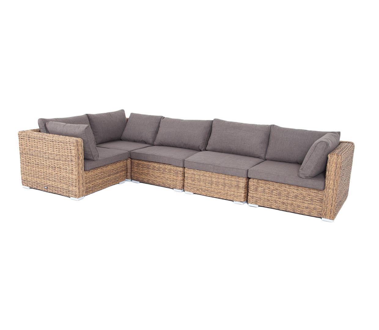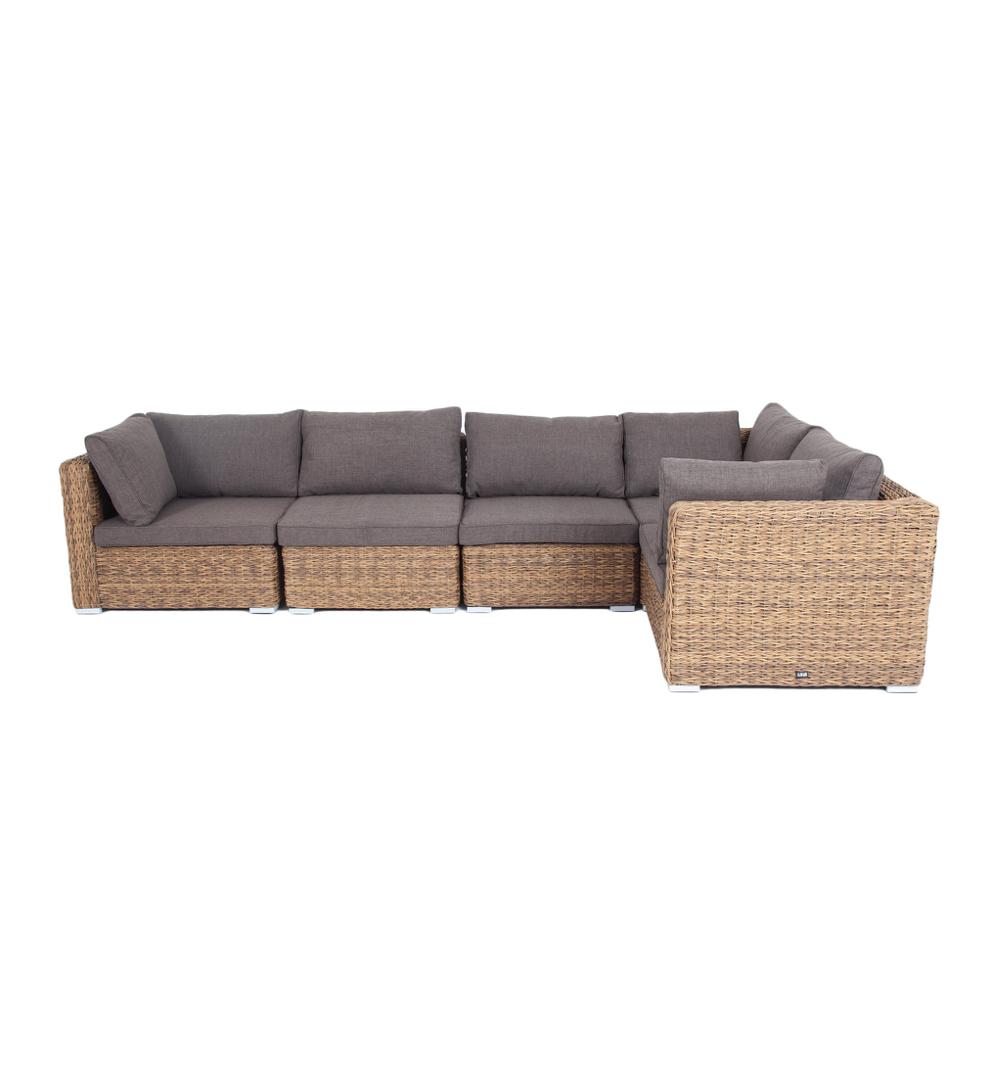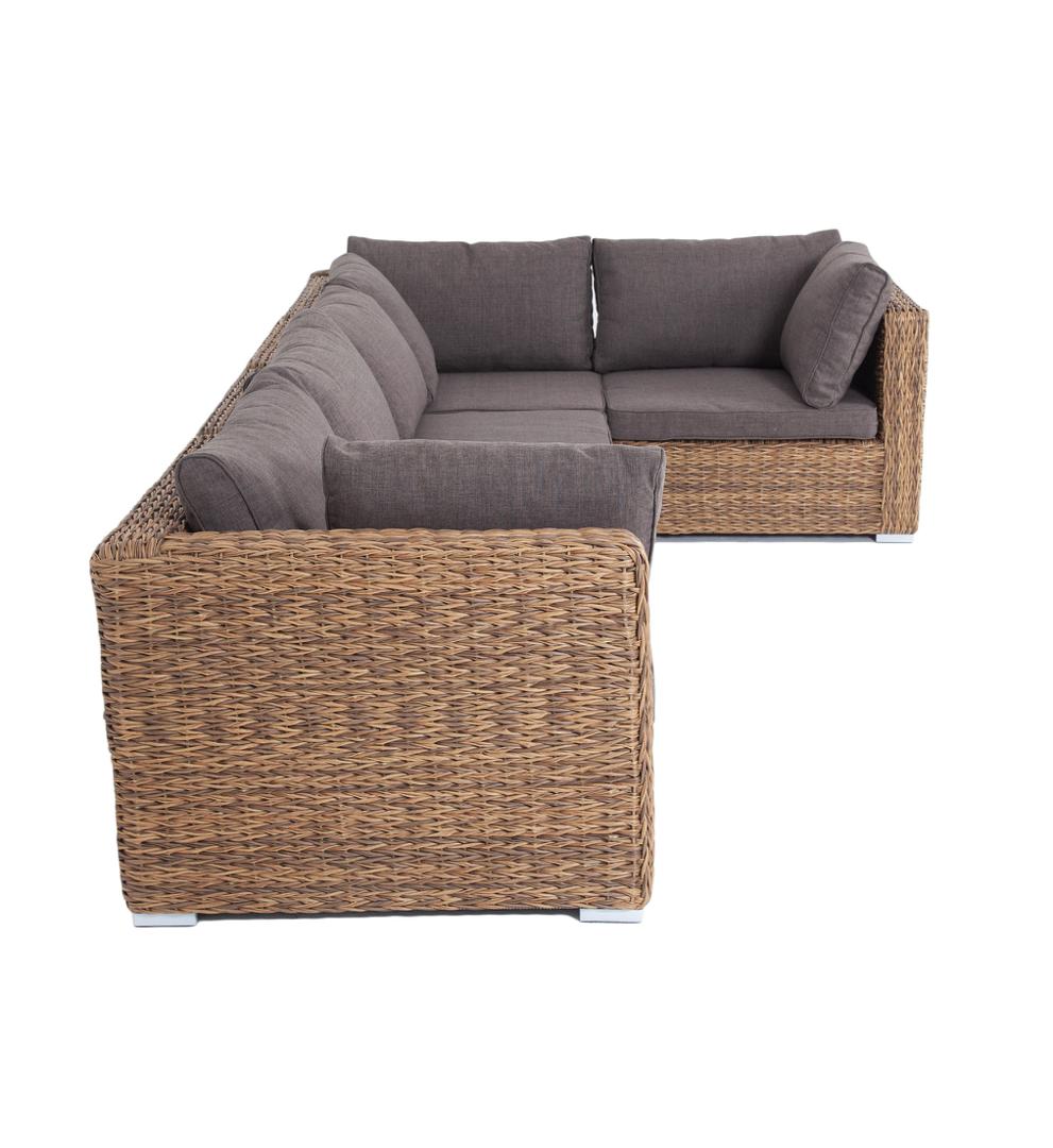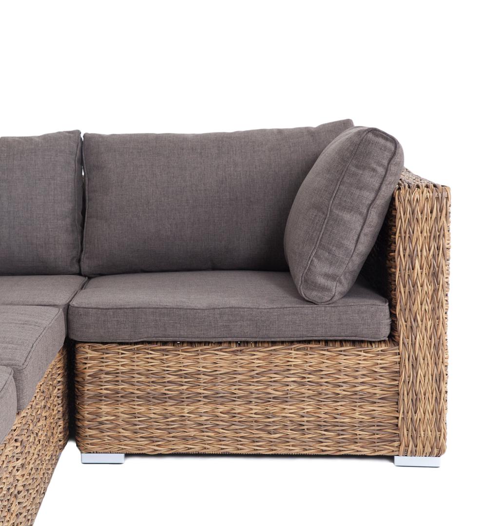 Трансформирующийся диван «Лунго» подходит для одновременного размещения до 8 персон. Его каркас выполнен из прочного алюминия. Мебедь состоит из трех угловых модулей размером – 860×860×650 мм и двух прямых модулей размером – 740×860×650 мм. Комплект выполнен из искусственного ротанга вида «гиацинт» ручного плетения. Представлен в соломенном цвете. Модульный диван дополняют подушки со съёмными чехлами в сером оттенке. При их пошиве используется полиэстер, плотностью 300гр/м2. Ткань обрабатыв "Лунго" модуль диванный угловой с подушками, цвет соломенный (гиацинт) 3шт. 860Х860Х650, "Лунго" модуль диванный прямой с подушками, цвет соломенный (гиацинт) 2шт. 740Х860Х650,