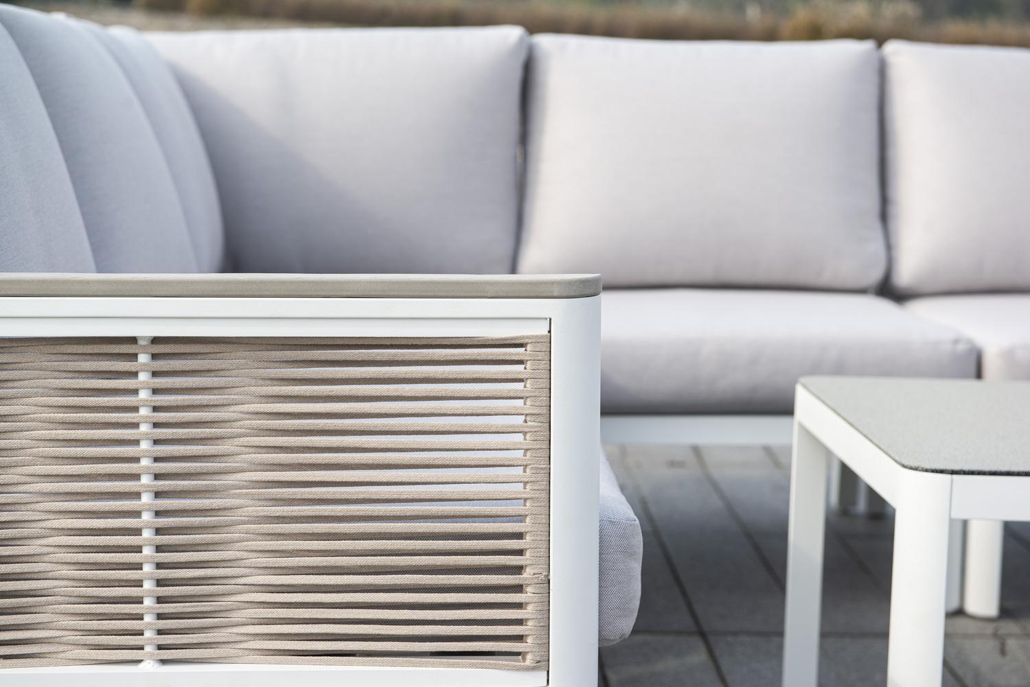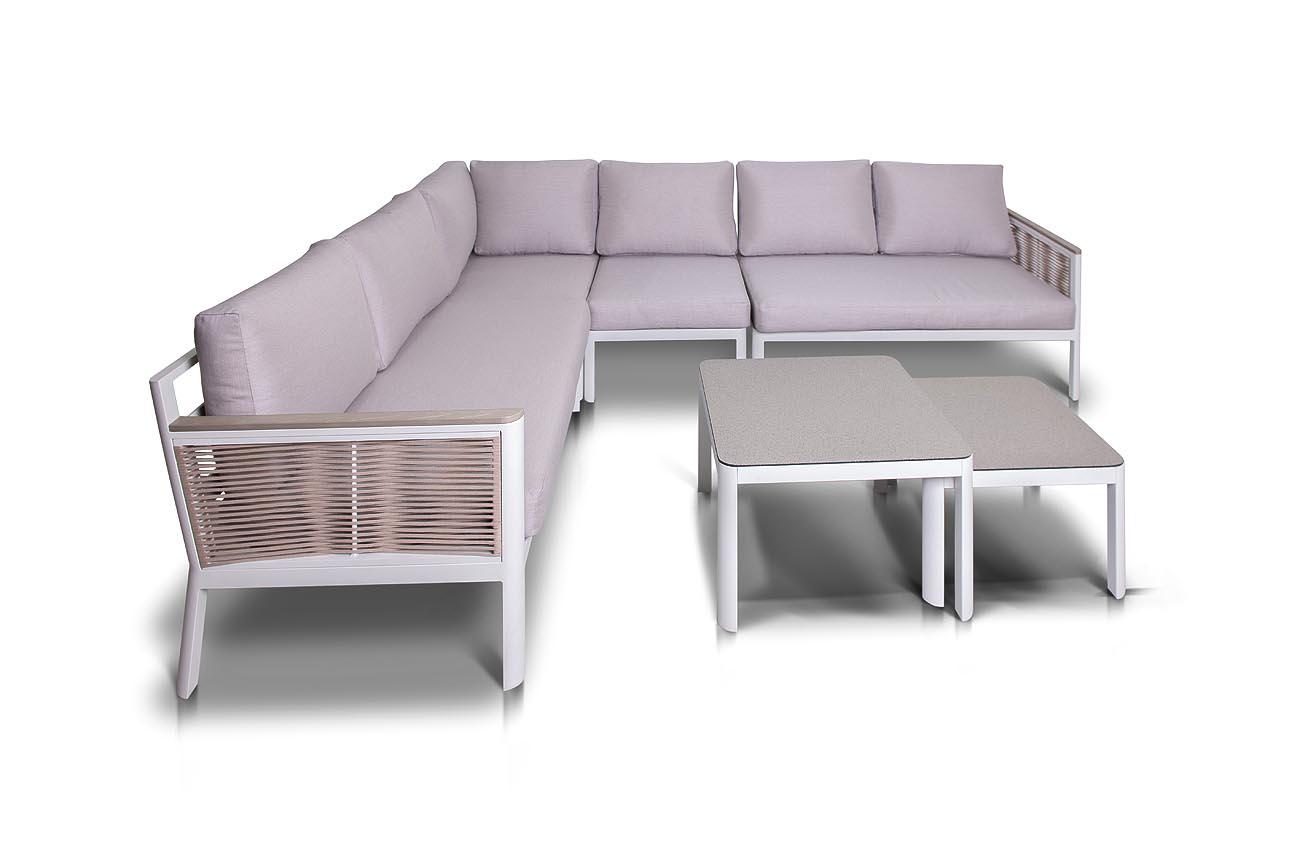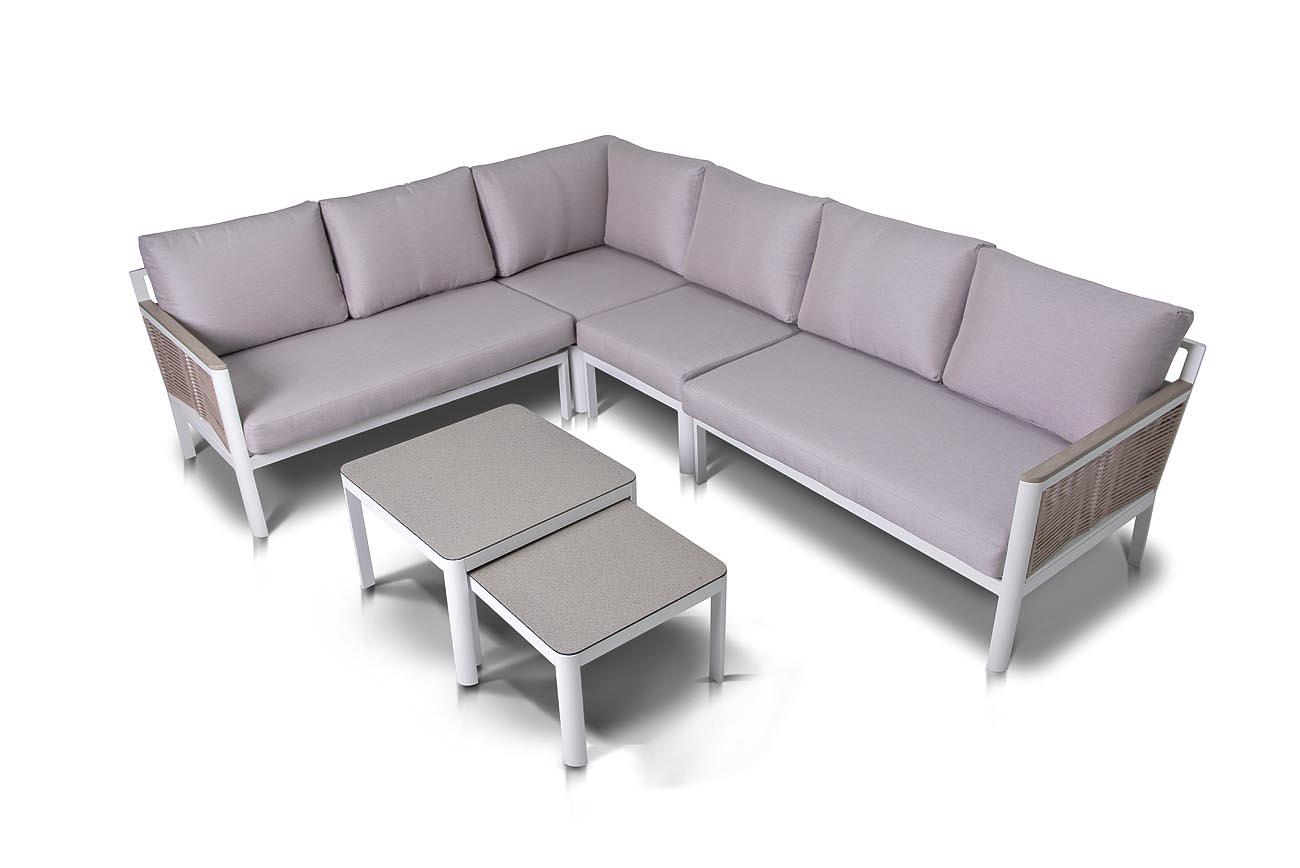 Угловой модульный диван «Париж» каркас из алюминия. Состоит из четырех модулей: - диванный двухместный модуль левый – 1240×780×700 мм. - диванный двухместный модуль правый – 1240×780×700 мм. - диванный модуль центральный - 780×600×700 мм. - диванный модуль угловой – 780×780×700 мм. Диван можно трансформировать под нужный размер и расположение. Состоит из алюминиевого каркаса белого цвета, который дополняет бежевая оплетка из эластичных синтетических лент, состоящих из высокопрочных полиэфирны "Париж" модуль диванный алюминиевый угловой 1шт. 780Х780Х700, "Париж" модуль диванный алюминиевый центральный 1шт. 600Х780Х700, "Париж" модуль диванный левый, двухместный 1шт. 1 240Х780Х700, "Париж" модуль диванный правый, двухместный 1шт. 1 240Х780Х700,
