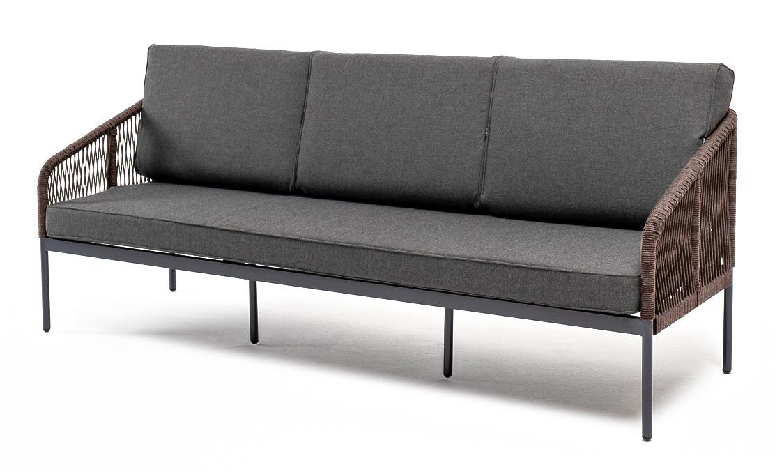Диван 4SIS "Канны" диван 3-местный плетеный из роупа, каркас алюминий темно-серый (RAL7024) муар, роуп коричневый круглый, ткань темно-серая 027 арт. KAN-S-3-001 RAL7024 Mua brown(D-gray027)