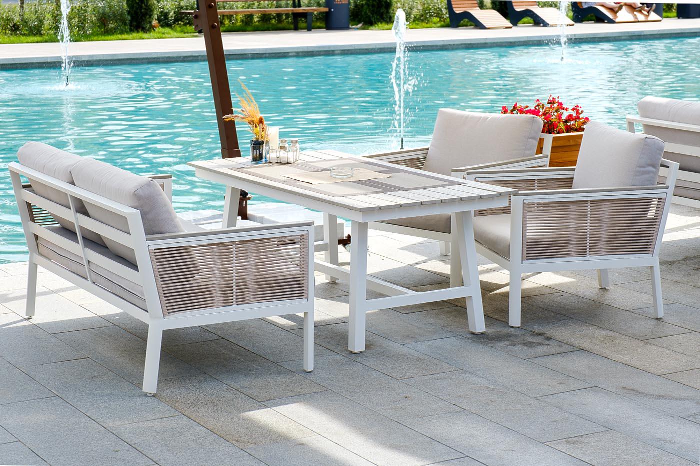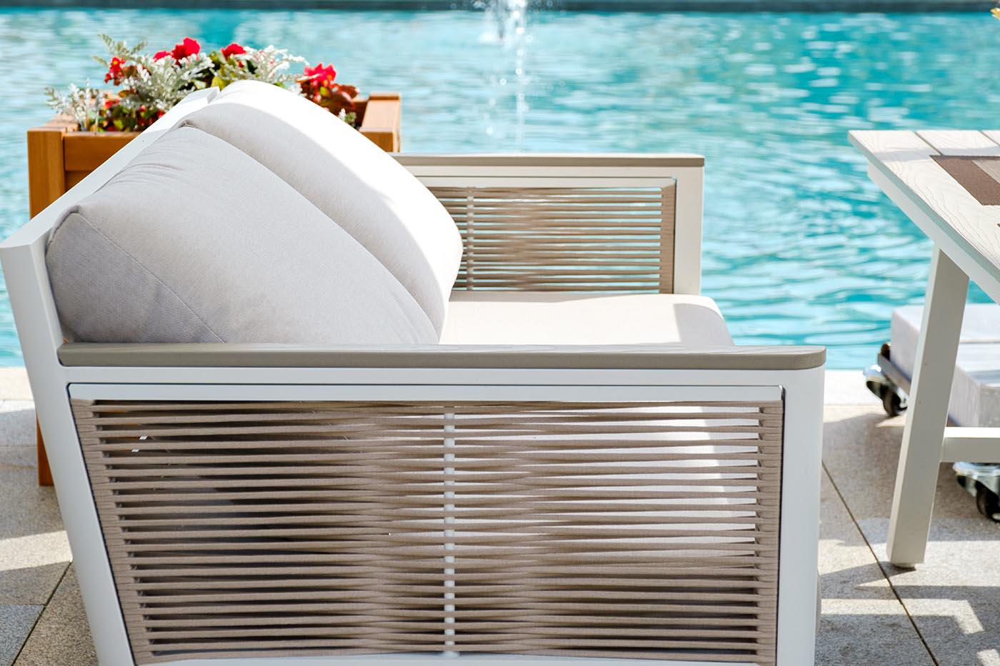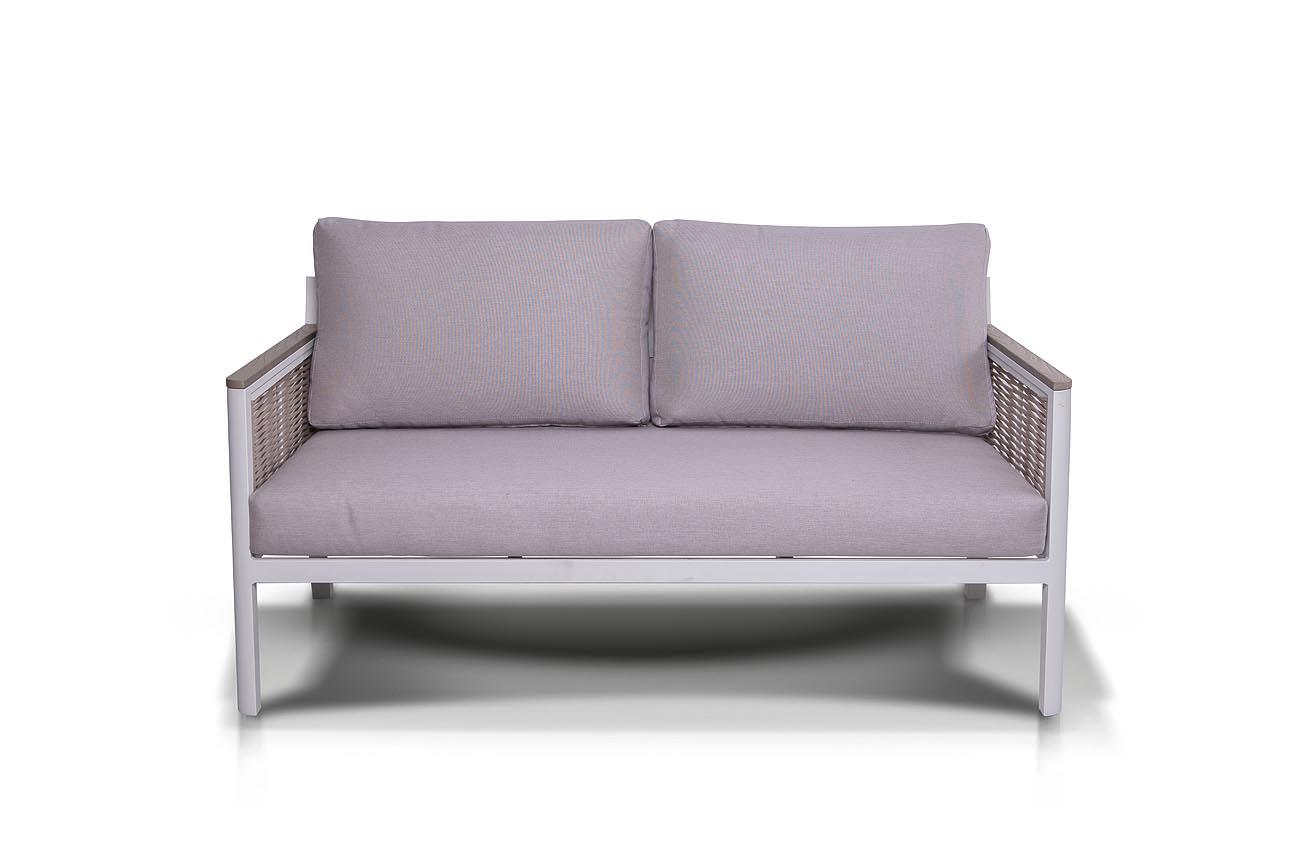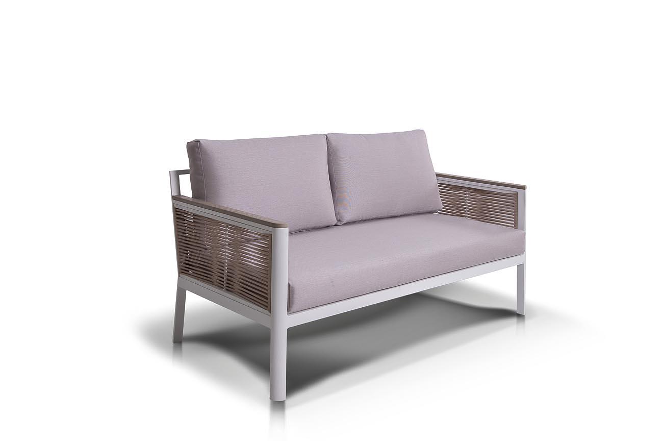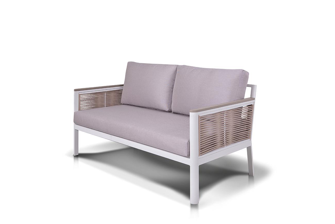 Двухместный диван «Сан Ремо». Каркас выполнен из высококачественного алюминия и окрашен порошковой краской в белый цвет. Боковые стороны подлокотников вручную оплетены эластичными синтетическими лентами серо-коричневого оттенка, состоящие из высокопрочных полиэфирных волокон. В комплекте - подушки со съёмными чехлами из 100%-го полиэстера, плотностью 300гр/м2. Ткань имеет влагоотталкивающую пропитку. Размер дивана: 1460×780×700 мм.