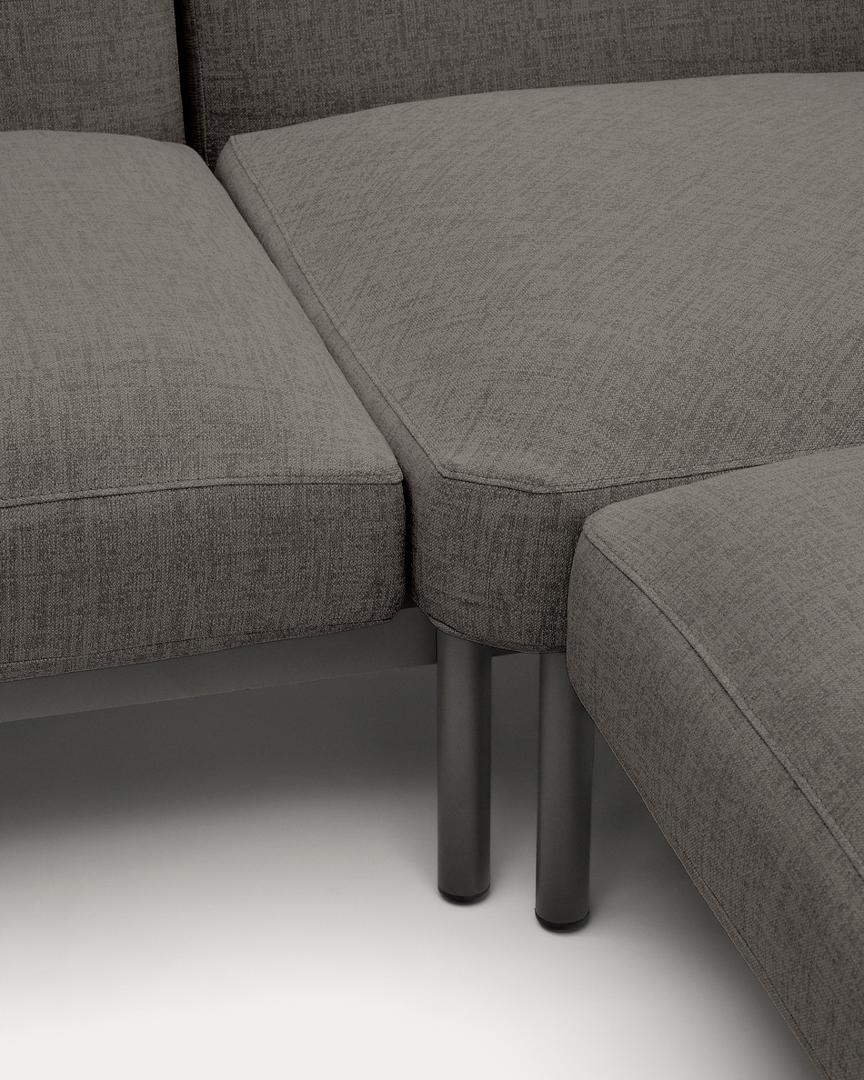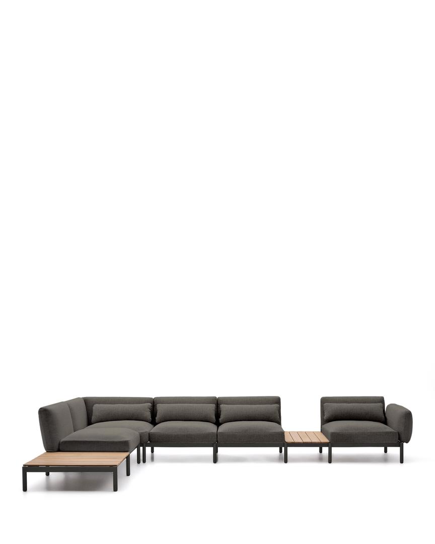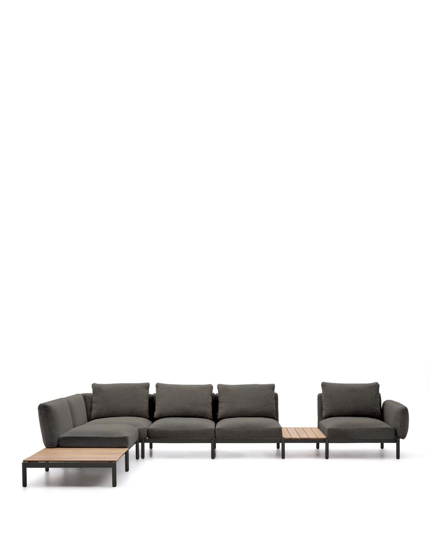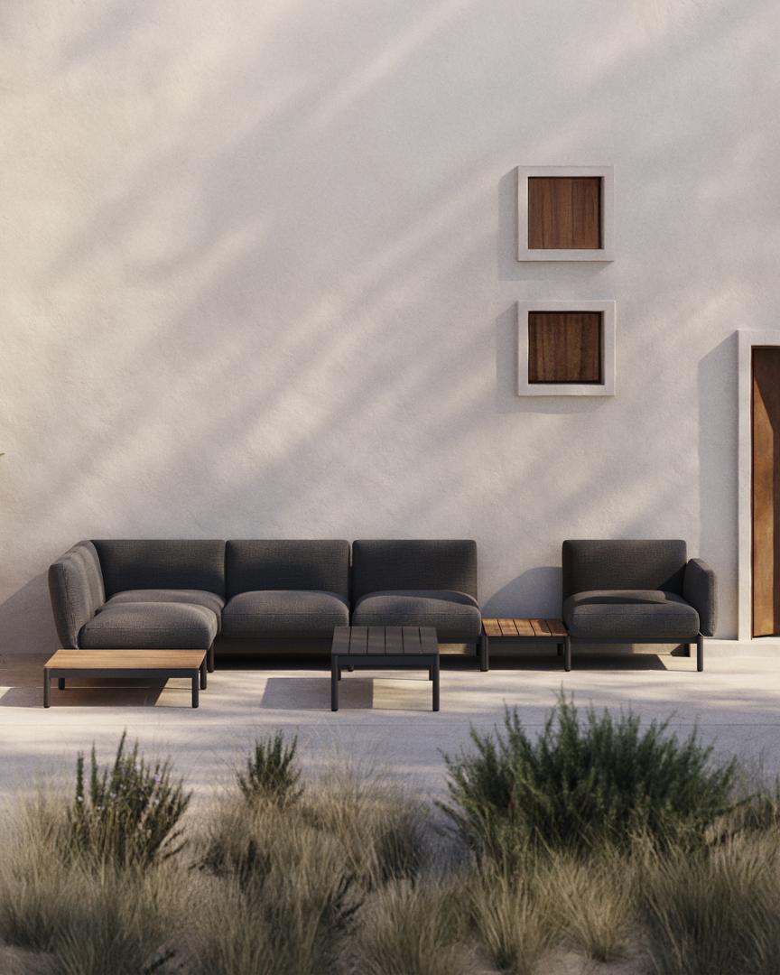 orells — это гораздо больше, чем просто модульный диван, это ключевой элемент для преобразования вашего пространства на открытом воздухе с аутентичным стилем и комфортом. Разработанный эксклюзивно Made Studio для Kave Home, Sorells сочетает в себе универсальность модульной конструкции с прочностью высококачественных материалов. Его алюминиевая структура, которая легкая и устойчива к ржавчине, коррозии и ультрафиолетовому излучению, обеспечивает исключительную долговечность на открытом воздухе. К этому добавляется темно-серая обивка, призванная добавить изысканности и тепла