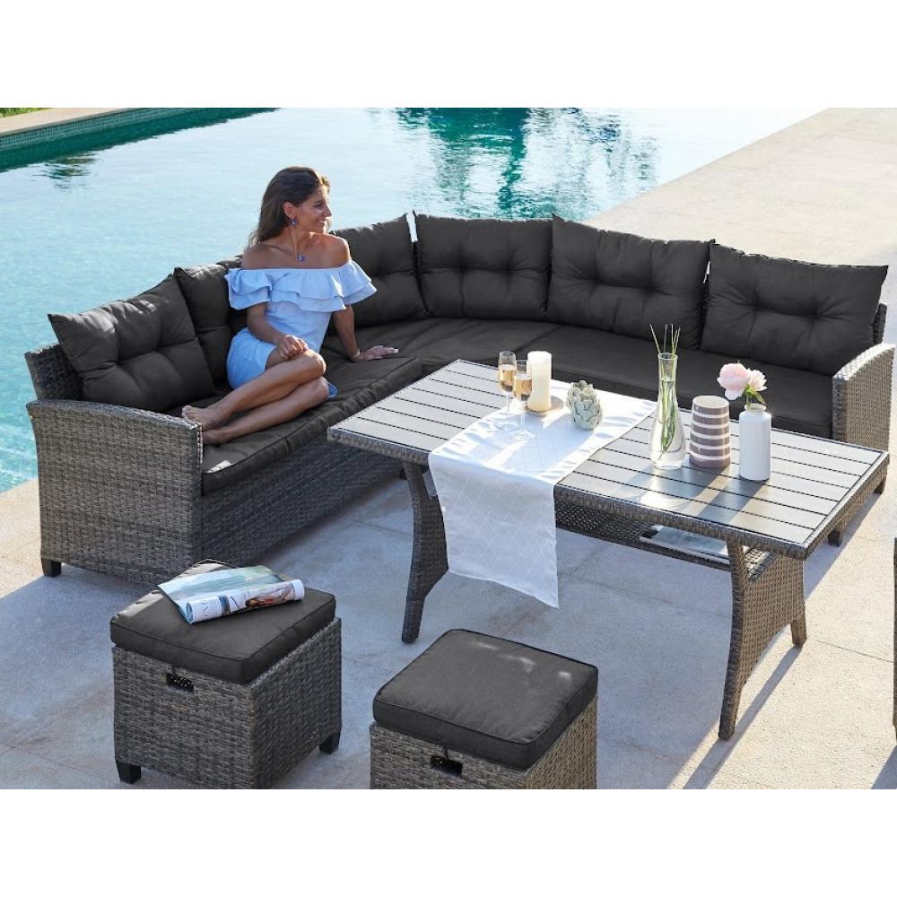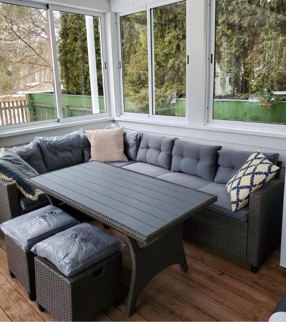Размер углового дивана: 234x179x65x74 Размер дивана1: 179х65х73см Размер дивана2: 169х65х73 Размер 1 пуфика: 40х40х39 см Размер стола: 144х74х66, столешница - декинг (без стекла) Каркас: сталь с гальваническим покрытием. Материал: искусственный ротанг. Цвет: Dark Grey. Размер коробок 2 шт. 163х67х51, 163х76х26 Вес: 73кг , Объем: 1м3 Цвет ротанга и подушки на доп. фото. Могут отличаться от оригинала при разном освещении.