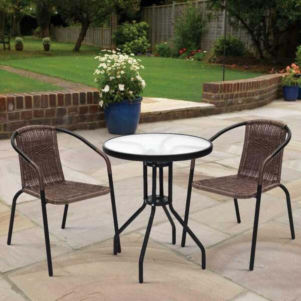 Стол: D60xH70 см. Стекло: закаленное- 5 мм. Труба: сталь с полимерным покрытием. Столешница по периметру БЕЗ искусственного ротанга. Стул: W51xD64xH72 см., без ротанга на подлокотнике Каркас: труба сталь. Материал: искусственный ротанг. Цвет: Light Brown. Объем и вес комплекта: 0,32м3, 13,8кг