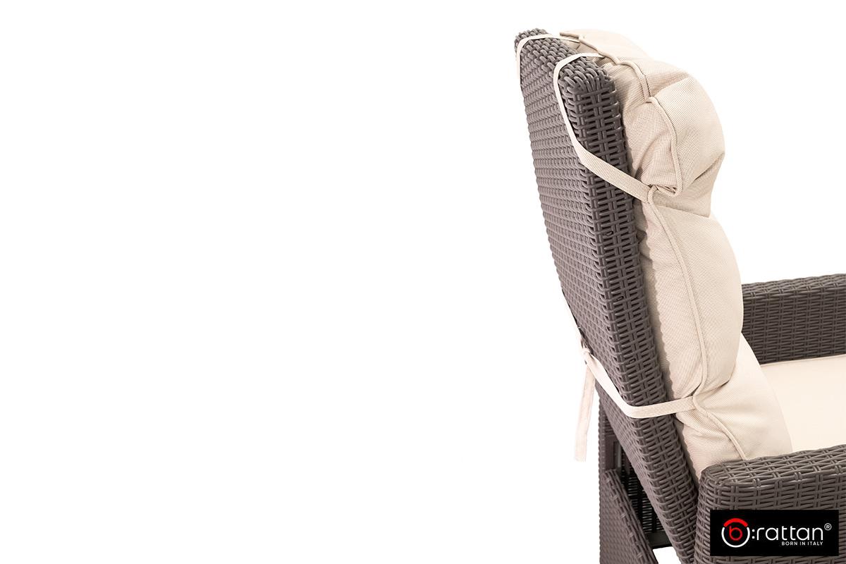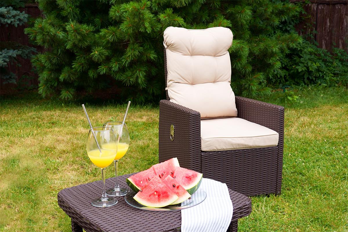 Регулируемый наклон спинки позволяет трансформировать кресло в шезлонг. Благодаря этому один комплект мебели можно использовать для принципиально разного отдыха на улице.