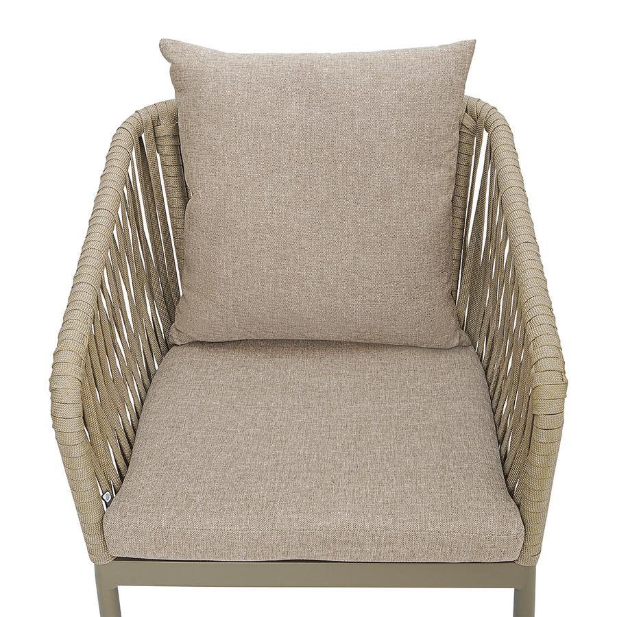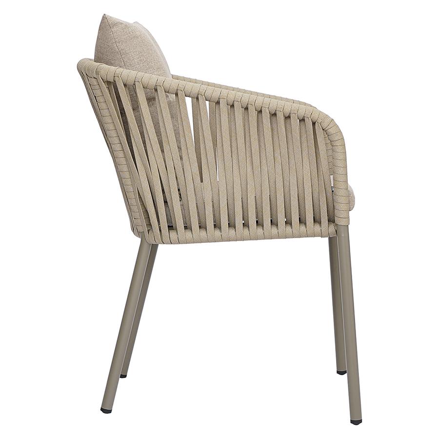 Стул Monyx – идеальное сочетание стиля, качества и комфорта. Интересный дизайн с декоративным плетением делает этот предмет мебели заметным акцентом в любом пространстве, а практичные материалы обеспечивают долговечную эксплуатацию. Особенности и преимущества: - Покрытие голландской фирмы AkzoNobel, лидера в производстве покрытий для металлических изделий, обеспечивает мебели высокую износостойкость и возможность использования в уличных условиях. - Стул имеет прочный каркас из алюминиевой трубы диаметром 25 мм и толщиной 1,5 мм. - Круговая полная сварка по всей поверхности соприкосновения шва гарантирует конструкции надежность и долговечность. - Чехлы на подушки выполнены из гипоаллергенной, водонепроницаемой ткани плотностью 330 г/м2 с защитным покрытием от ультрафиолета. - Внутреннее наполнение подушки – быстросохнущая пена толщиной 5 см. - Оплетка из прочного полиэстера толщиной 16 мм устойчива к воздействию влаги, пятнам, плесени и УФ-излучению. - Высокая спинка, плавно переходящая в подлокотники, обеспечивает удобство при сидении и делает дизайн интересным. - Декоративное плетение смягчает строгие формы каркаса и придает модели необычный вид. - Специальные пластиковые накладки на ножках защищают напольное покрытие от царапин. - Дизайн разработан с возможностью штабелирования для экономии пространства. - Стул выдерживает нагрузку до 120 кг. - Гарантия на мебель – 12 месяцев. Материал: алюминий, полиэстер, пенополиуретан. Высота сиденья: 44 см. Ширина сиденья: 45 см. Глубина сиденья: 47 см. Высота спинки: 38 см. Ширина спинки: 38 см. Высота подлокотников: 25 см. Максимальная нагрузка: 120 кг. Цвет: серо-бежевый. Пыль и загрязнения можно удалять с поверхностей при помощи мягкого влажного материала.