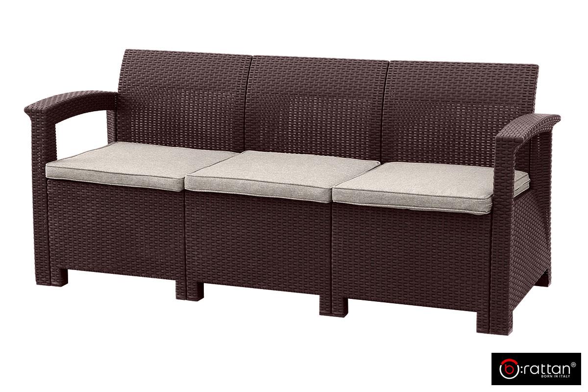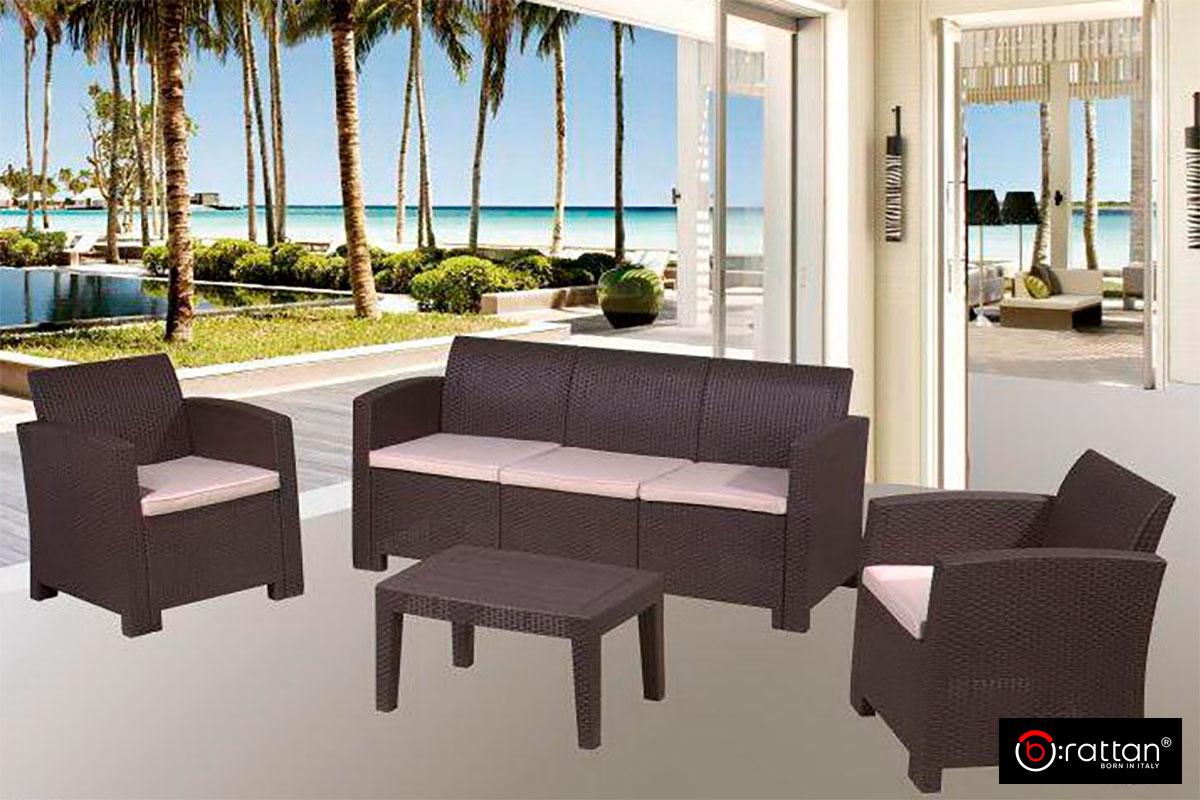 Итальянская мебель для сада, террас, загородного дома и уличных кафе Rattan Comfort 5 от итальянского производителя B:Rattan рассчитан на 5 персон и включает 4 предмета большой 3-х местный диван, 2 кресла и кофейный столик. Пластиковый комплект порадует любителей плетеной мебели своей фактурой в стиле ротанг и прочностью: максимальная нагрузка на диван и кресло — до 200 кг, на столик — до 100 кг.
