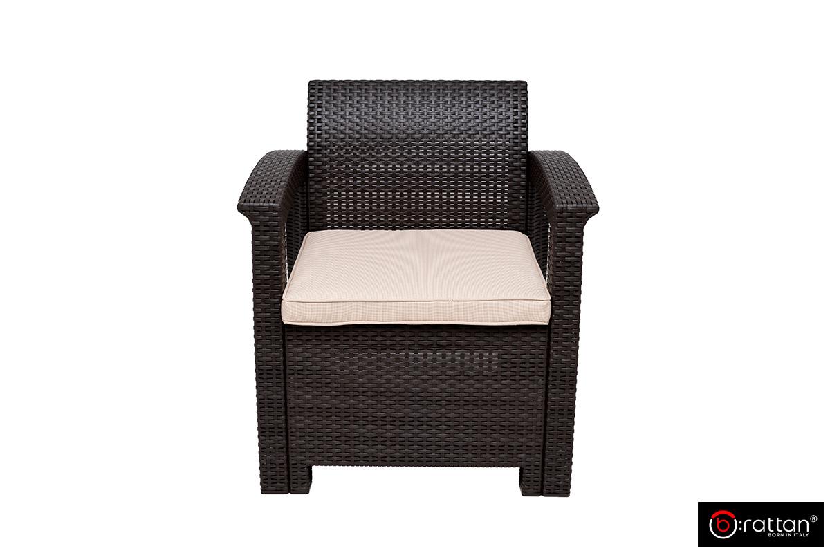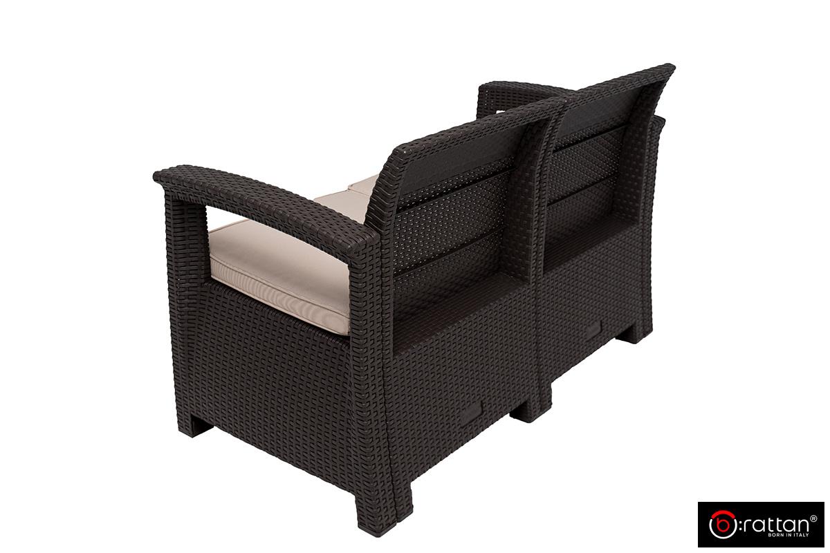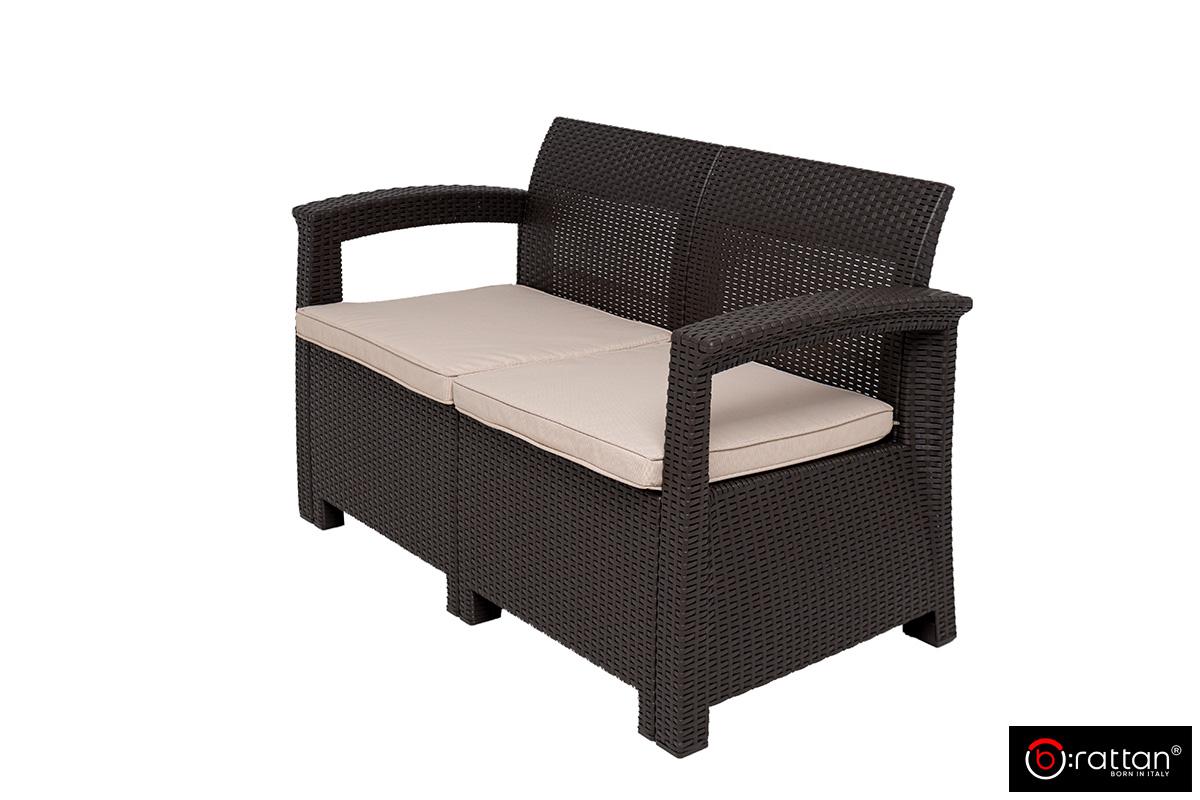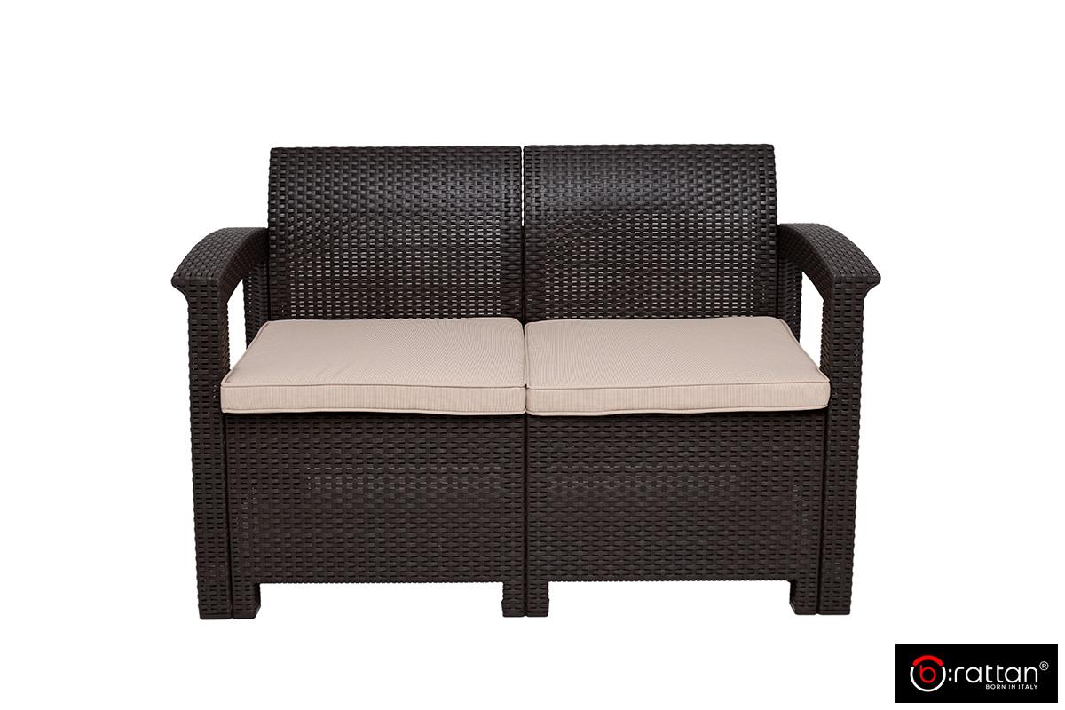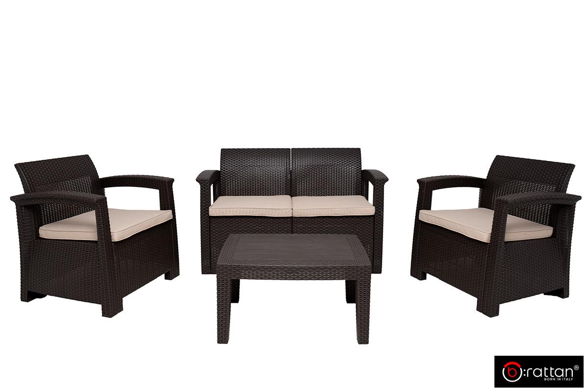 Итальянская мебель для сада, террас, загородного дома и уличных кафе Раттан Комфорт 4 / Rattan Comfort 4 от итальянского производителя B:Rattan рассчитан на 4 персон и включает 4 предмета большой 2-х местный диван, 2 кресла и кофейный столик. Пластиковый комплект порадует любителей плетеной мебели своей фактурой в стиле ротанг и прочностью: максимальная нагрузка на диван и кресло — до 200 кг, на столик — до 100 кг.
