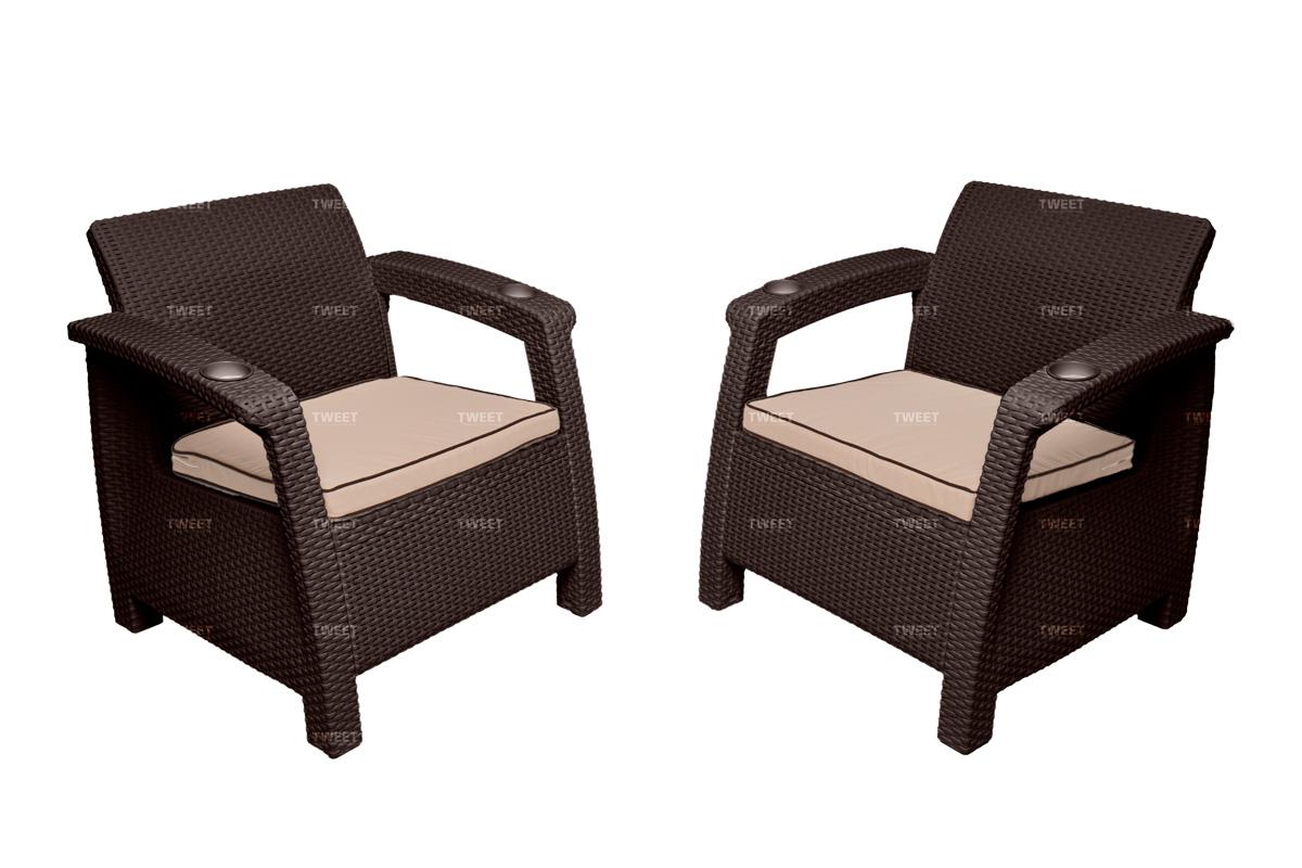 Кресла и столик выполнены в стильном дизайне с имитацией плетения под искусственный ротанг. В отличие от плетеной мебели, имитация ротанга не расплетается и не вытягивается, надолго сохраняя привлекательный внешний вид.