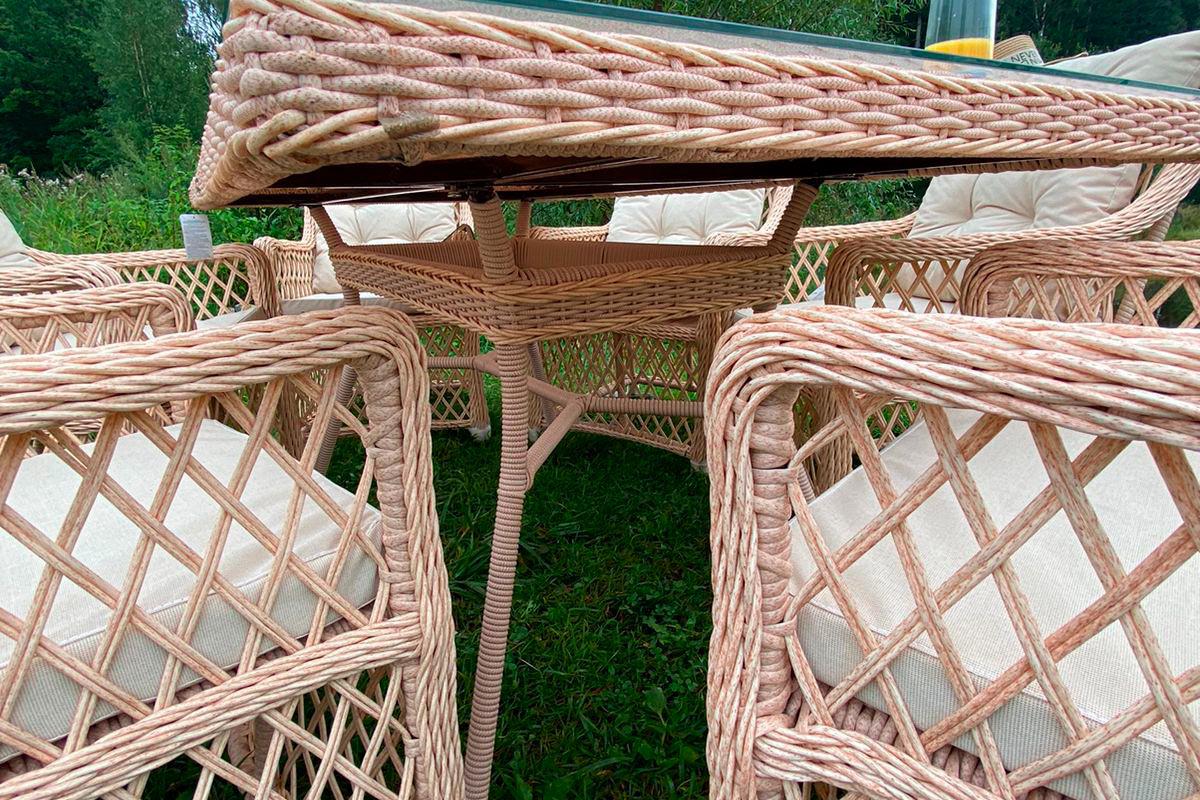 Легкое ажурное плетение в цвете персиковый пух, эргономичная форма спинки и подлокотников кресел и соломенный цвет мебели станут центром притяжения взгляда в любом интерьере или экстерьере. Благодаря компактным размерам гарнитур VILLA ROSA (Вилла Роса) прекрасно подойдет для небольших балконов и террас