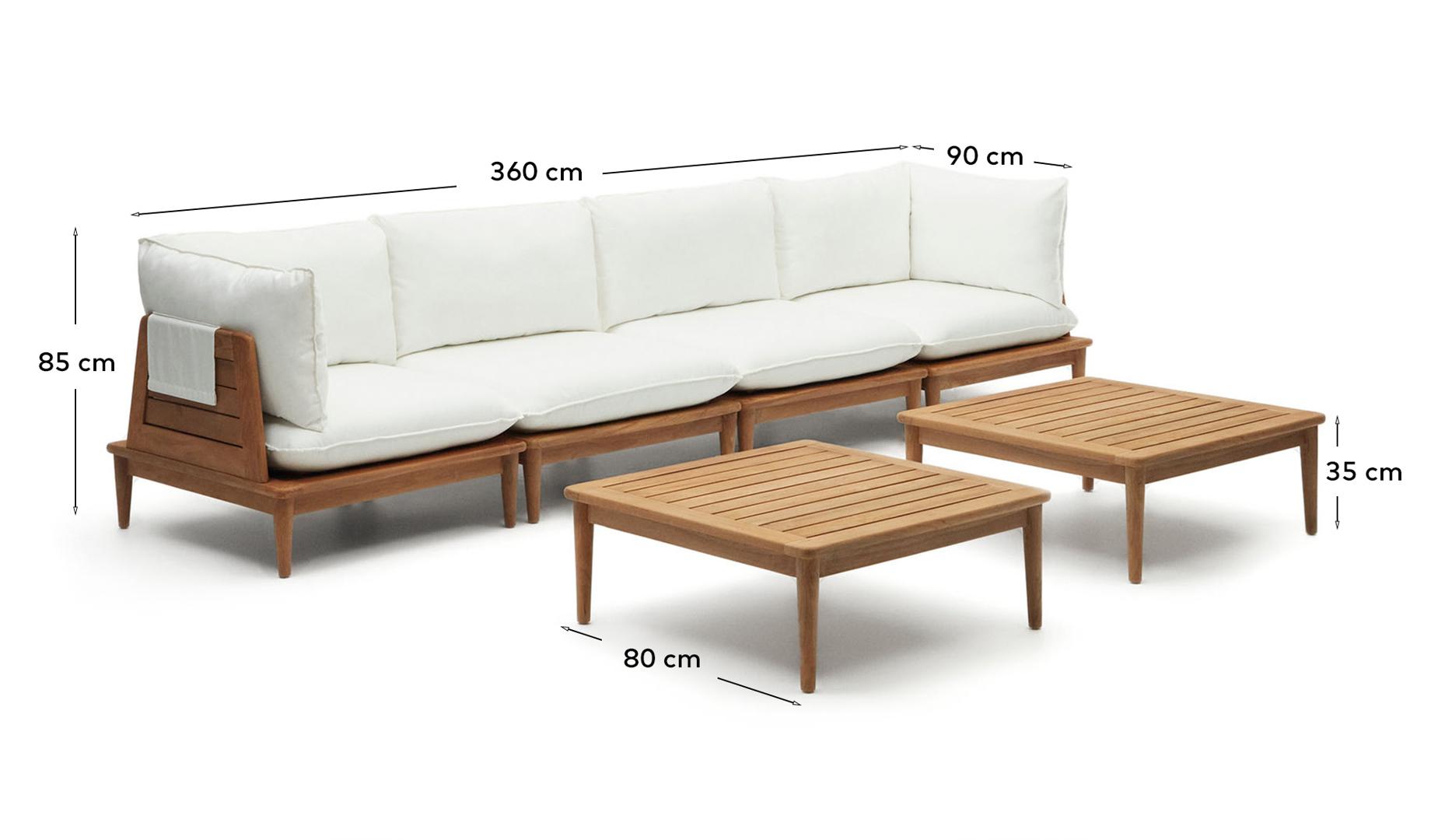 Набор из модульного дивана и столика Portitxol от фабрики La Forma (ex Julia Grup) – создайте открытую гостиную своей мечты! Набор мебели Portitxol идеально подойдет для оформления открытого пространства, который сразу адаптируется под любые ваши потребности. Прочные модули из тикового дерева дополнены мягкими подушками с чехлами из влагостойкой ткани. Поэтому вас не будут беспокоить погодные условия и пятна после веселой вечеринки. Выбирайте свое количество модулей и планируйте расстановку! Модули изготовлены из массива тикового дерева, которое покрыто полиуретаном для защиты от солнца и влаги. Для устойчивости на ножках установлены пластиковые наконечники. Подушки, которыми дополнены модули, заполнены пенополистиролом. Он не портится от воздействия внешней среды, не впитывает запахи, не меняет форму. Чехлы съемные. Их можно стирать в машинке при температуре 30 градусов. Производитель предлагает три вида модулей – для размещения 3,4 и 5 человек. В связи с этим, у модулей разные размеры: ширина – 180/270/360 см, высота – 65 см, глубина – 180/270/90 см. Вес комплектов – 82,1/125.1 кг. В зависимости от выбранного набора, в комплект входит один или два журнальных стола. Стол также изготовлен из массива тика, рассчитан на нагрузку до 60 кг. Его размер: ширина – 80 см, высота – 35 см, глубина – 80 см. Вес – 12.4 кг. Для чистки мебели не использовать агрессивную химию и абразивные вещества. Сборка не требуется.