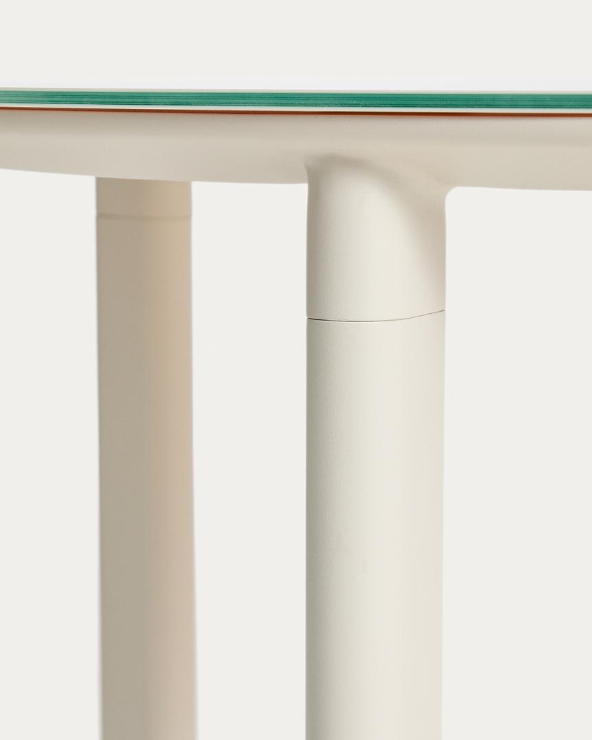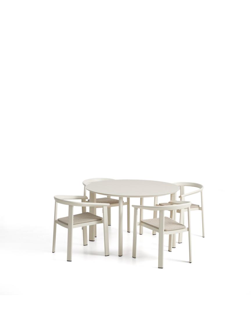 Комплект Erice включает в себя стол с алюминиевым основанием и столешницей из закаленного стекла, окрашенной в цвет каркаса для создания однородной отделки, а также стулья с сиденьями, обитыми веревочным шнуром ручной работы. Закаленное стекло устойчиво к ультрафиолетовому излучению, что помогает сохранить его цвет и внешний вид с течением времени. И стол, и стулья изготовлены из алюминия — легкого и прочного материала для использования на открытом воздухе, обладающего высокой устойчивостью к ржавчине, коррозии и воздействию солнечных лучей.