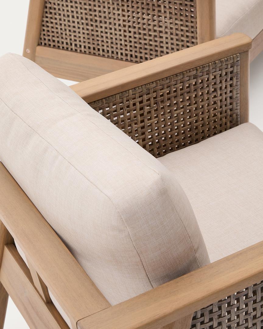 Alabe отличается универсальным и прочным дизайном, идеально подходящим для создания уютной атмосферы как в помещении, так и на улице. Его конструкция и синтетические шнуры из ротанга на сиденье устойчивы к ультрафиолетовым лучам. Древесина акации, из которой он изготовлен, выглядит тепло и естественно, а также имеет сертификат FSC 100%, который гарантирует ответственное лесопользование. Мы рекомендуем ежегодно наносить на него средство для защиты древесины Sterina, чтобы сохранить его внешний вид и продлить срок службы. Подушки, разработанные для обеспечения максимального комфорта, имеют пенопластовые и водоотталкивающие чехлы, что делает их идеальными для повседневного использования. Они также снимаются для легкой чистки, позволяя содержать весь комплект в безупречном состоянии. Под сиденьями расположены белые лямки, придающие сиденьям изысканность и дополнительную поддержку.