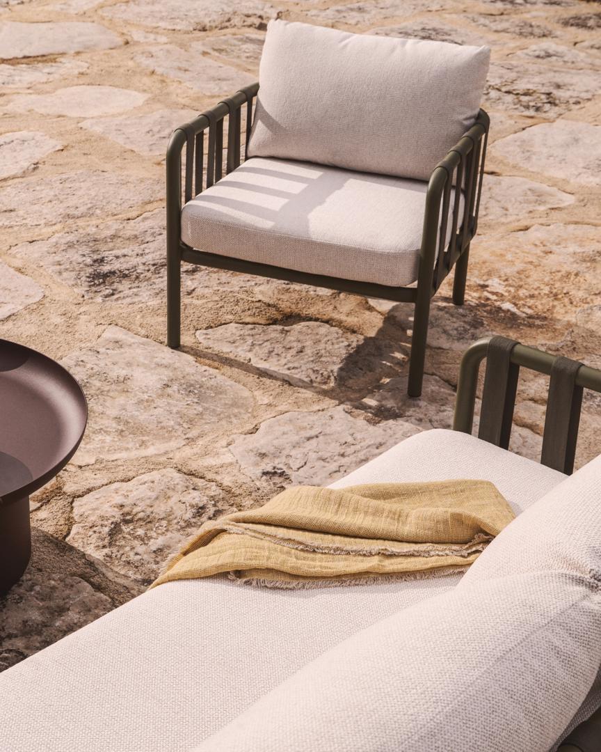 Комплект Omala создан для комфортного отдыха на природе. Его алюминиевая конструкция сочетает в себе легкость и прочность, сохраняя свой внешний вид со временем и под воздействием погодных условий. Спинка, изготовленная из атмосферостойкой ткани, адаптируется к телу и обеспечивает удобную осанку. Чехлы на подушки снимаются для удобства ухода; мы рекомендуем убирать их на хранение в дождливую погоду, чтобы сохранить их в хорошем состоянии. Omala сочетает в себе прочные материалы и внимание к деталям.