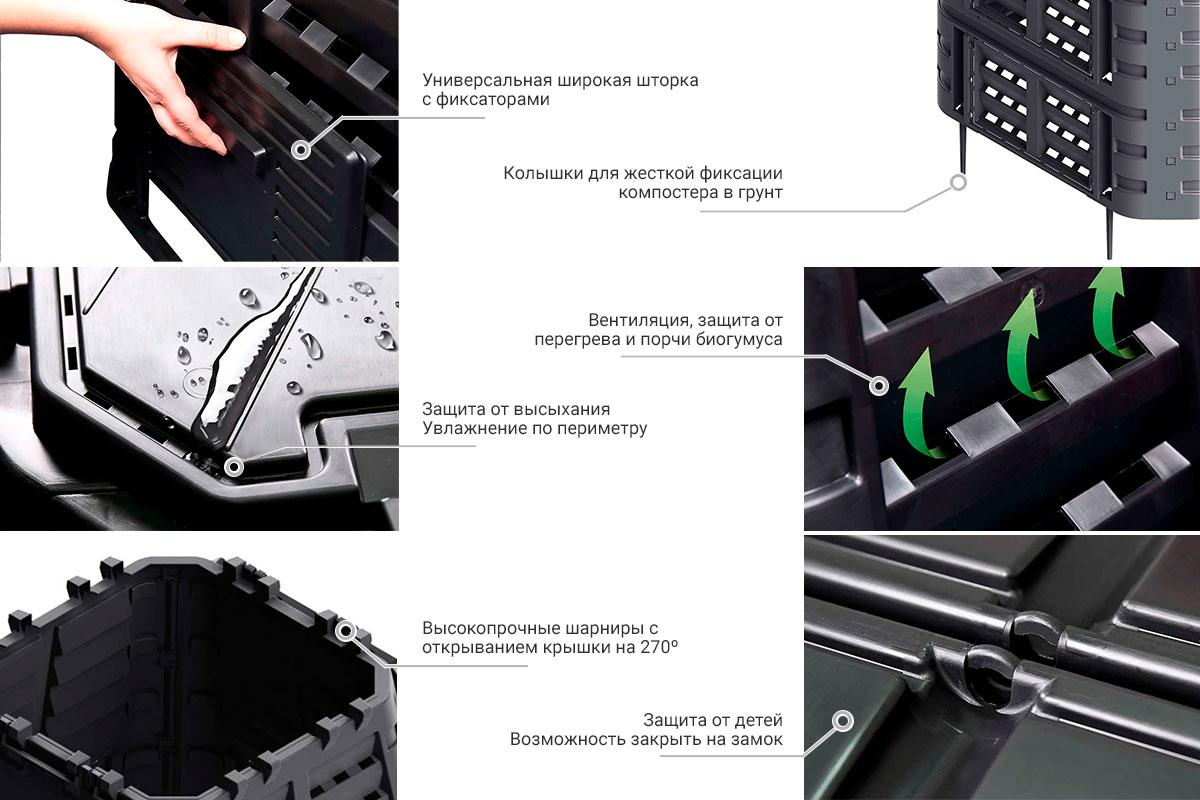 Высокопрочные шарниры с открыванием крышки на 270º.Колышки для жесткой фиксации компостера в грунт.