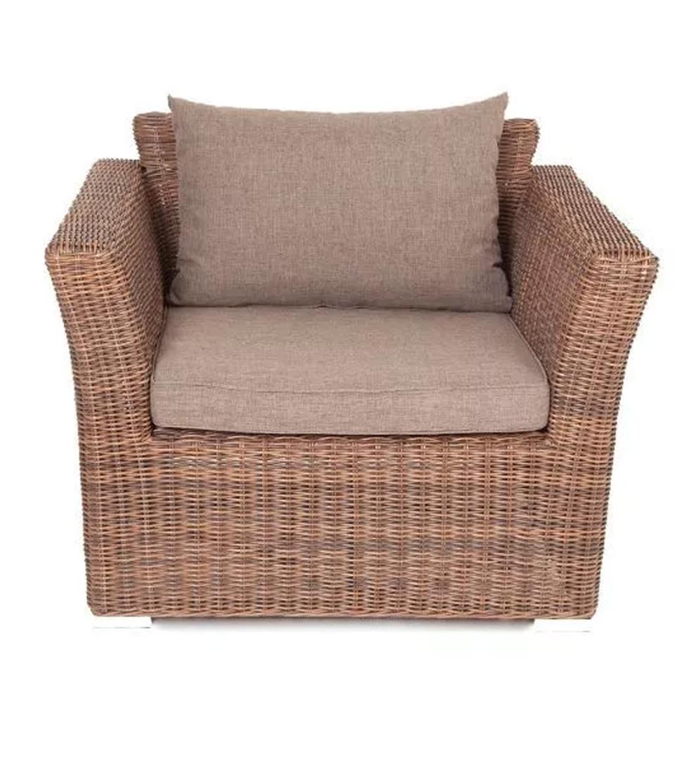 Плетеное кресло «Капучино» дает возможность комфортно провести время в зоне отдыха. Размер модели – 1040×865×815 мм. Каркас мебели изготовлен из алюминия. Его характеризует высокая прочность и износостойкость. Каркас задекорирован с помощью ручного плетения, при котором применяется круглый искусственный ротанг коричневого оттенка. Уличное кресло укомплектовано удобными подушками. На них надеты съёмные чехлы серого цвета. Тканевые изделия пошиты из качественного полиэстера. Его плотность с