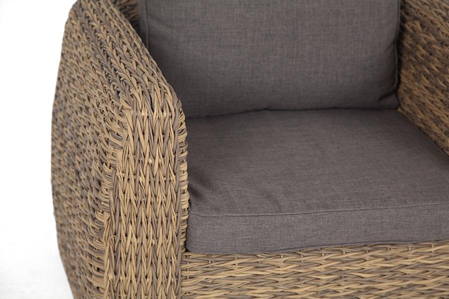 Кресло из искусственного ротанга «Кальяри» оснащено каркасом из прочного алюминия, ручное круглое плетение является основным декоративным элементом мебели. Оно выполнено из искусственного ротанга вида «гиацинт» соломенного цвета. В комплектацию входят мягкие подушки для комфортного расположения. Чехлы съёмные серого цвета из высококлассного полиэстера с плотностью 300гр/м2. Габариты модели составляют 980×880×680 мм, толщина подушки: 80 мм, вес: 18 кг. Параметры кресла без подушки: Глубина сиде
