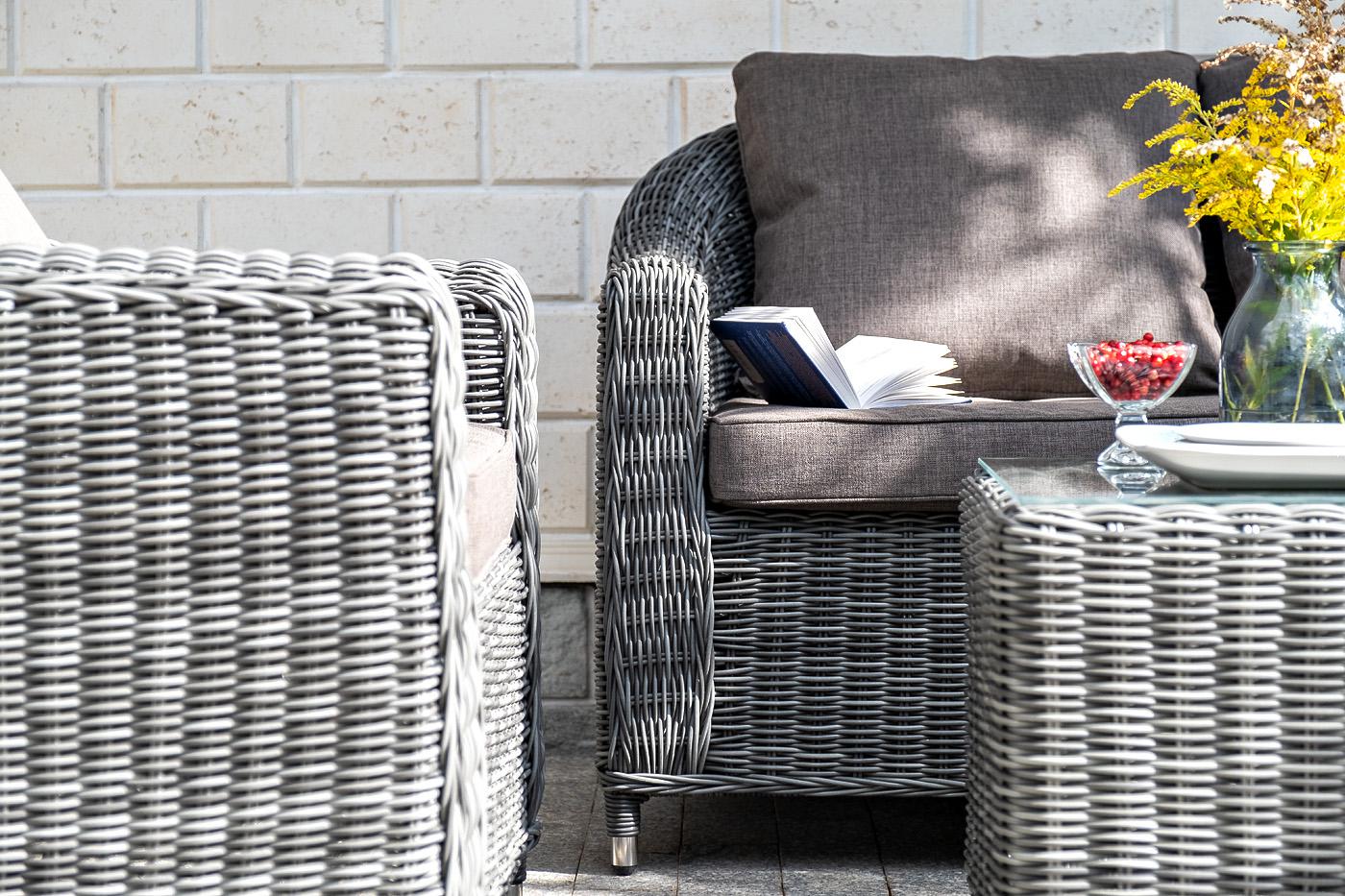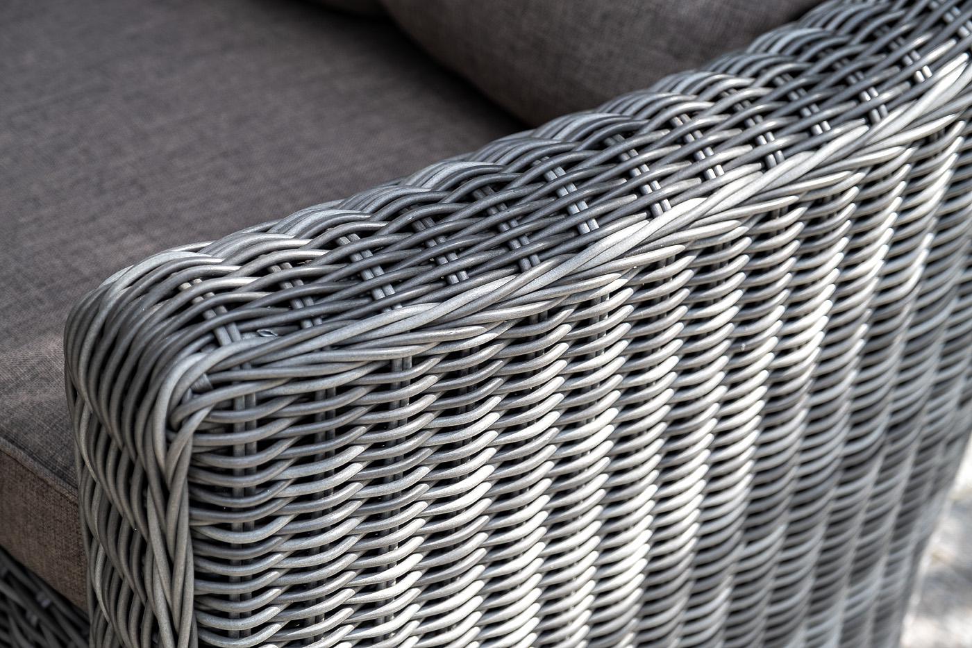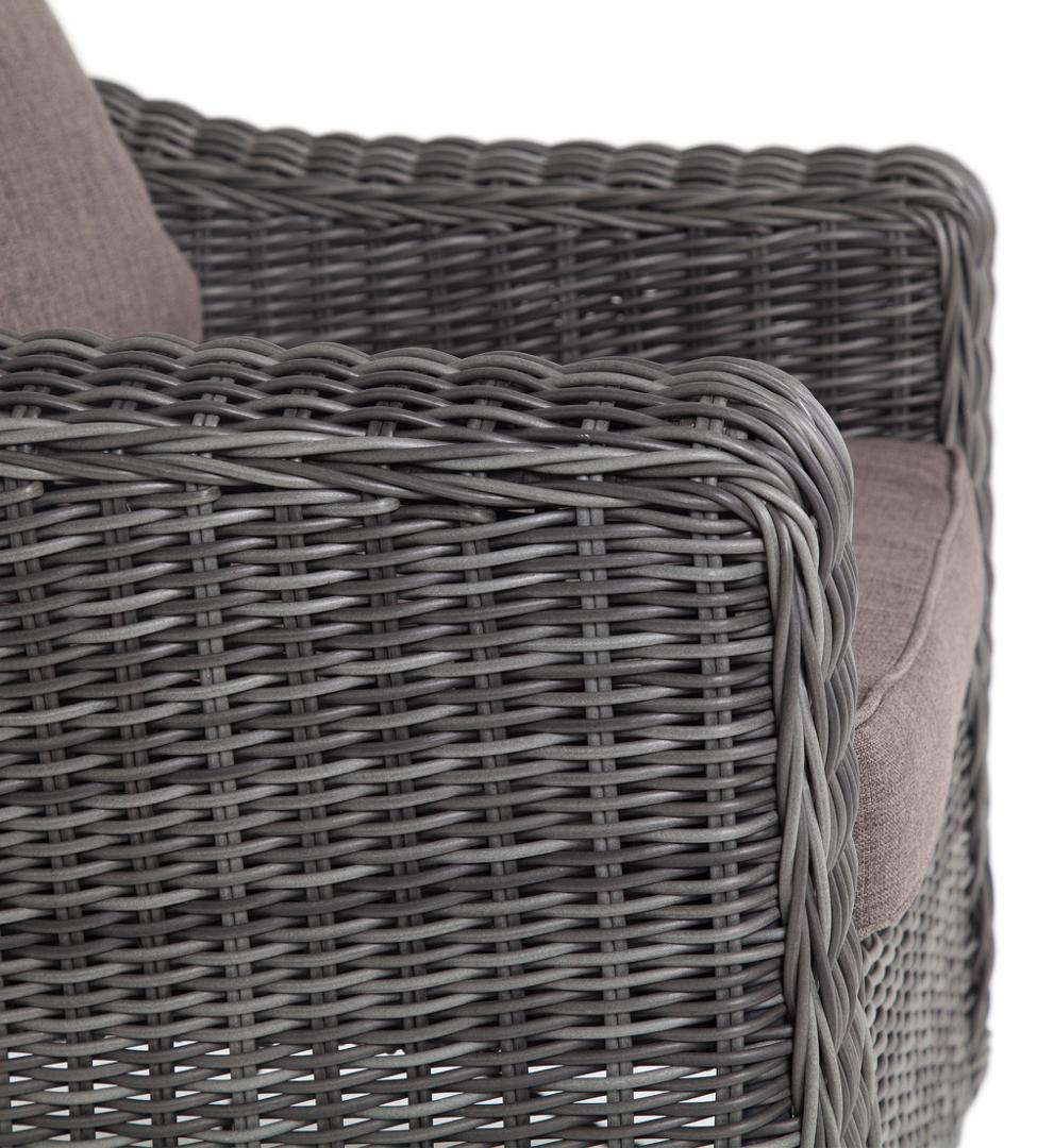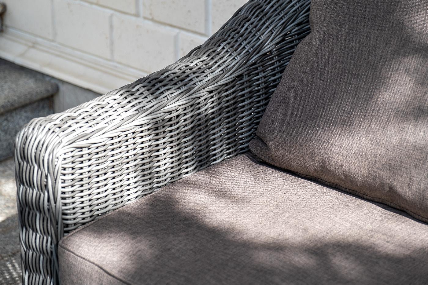 Кресло «Кон Панна» входит в лаунж-зону, состоящую из двухместного дивана, двух кресел и журнального столика. Но также может использоваться в качестве отдельного предмета. Размер модели – 800×800×800 мм. В качестве основы служит алюминиевый каркас, который оплетен круглым искусственным ротангом графитового оттенка. У кресла есть мягкие подушки, выполненые в сером цвете. Они сделаны из прочного полиэстера с плотностью 300гр/м2. Ткань имеет влагоотталкивающую пропитку, которая защищает ее от