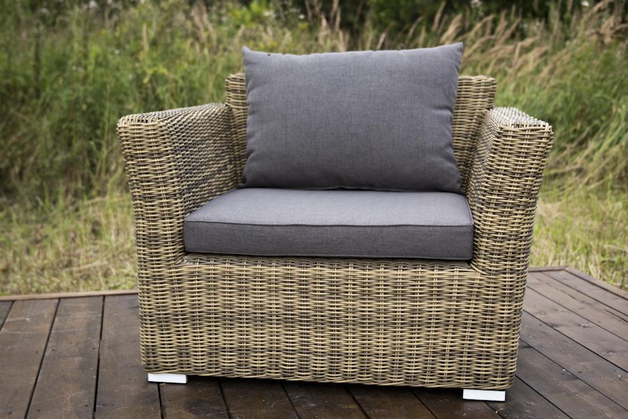 Кресло «Капучино» является практичным дополнением зоны отдыха, обустроенной мебелью из этой же серии. Размер модели – 1040×865×815 мм. Ее отличает алюминиевый каркас высокой прочности. В качестве декоративной составляющей выступает ручное плетение на основе круглого искусственного ротанга. Оно выполнено в соломенном оттенке. Две подушки серого цвета представлены в комплекте с садовым креслом. Изделия пошиты из полиэстера плотностью 300гр/м2. В обязательном порядке материал обрабатывается влагоотталкивающей пропиткой для усиления своих защитных свойств. Параметры кресла без подушек: Глубина сидения – 630 мм; Высота сидения – 370 мм; Высота спинки – 470 мм.