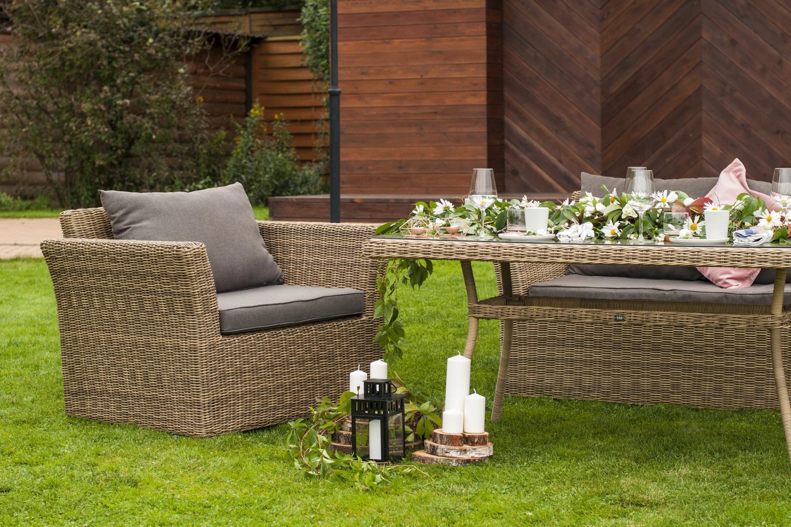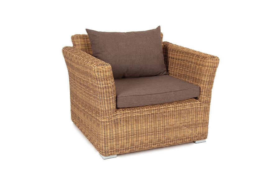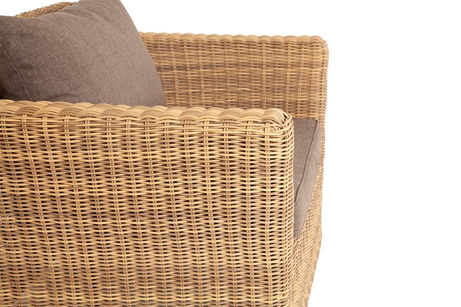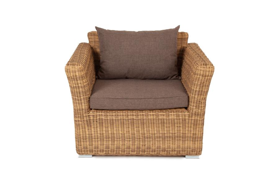 Кресло «Капучино» является практичным дополнением зоны отдыха, обустроенной мебелью из этой же серии. Размер модели – 1040×865×815 мм. Ее отличает алюминиевый каркас высокой прочности. В качестве декоративной составляющей выступает ручное плетение на основе круглого искусственного ротанга. Оно выполнено в соломенном оттенке. Две подушки серого цвета представлены в комплекте с садовым креслом. Изделия пошиты из полиэстера плотностью 300гр/м2. В обязательном порядке материал обрабатывается вл