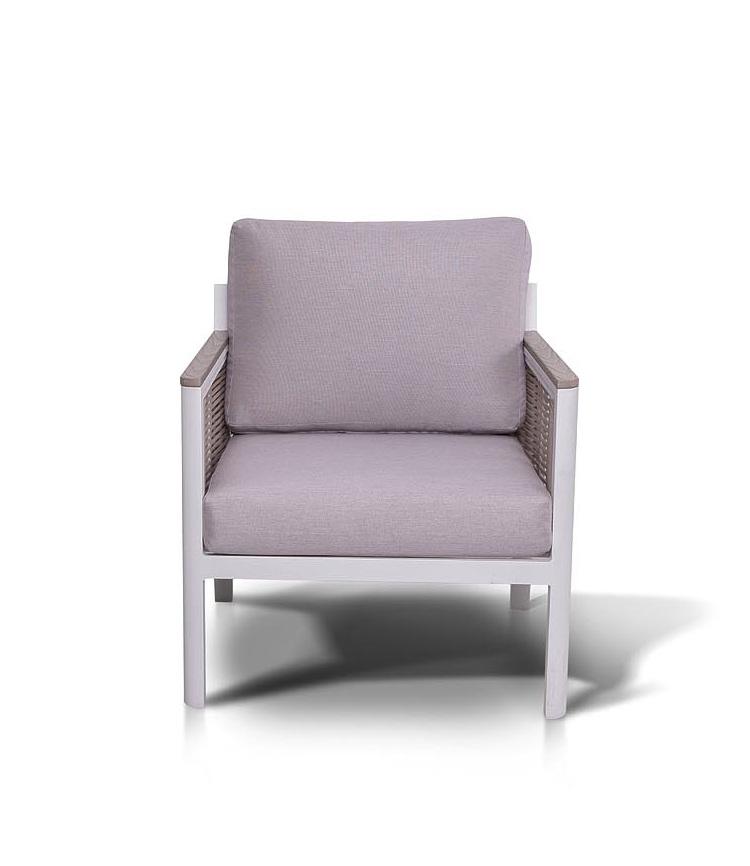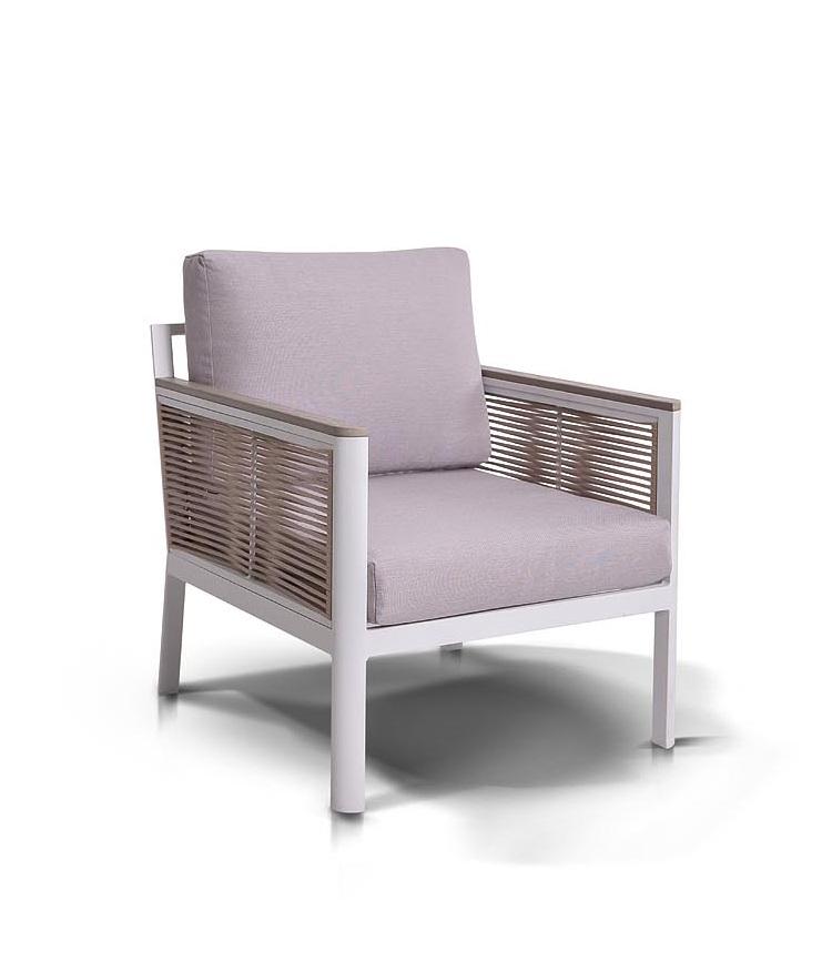 Кресло «Сан Ремо» можно использовать на открытой веранде, дачном участке или у бассейна. Данное кресло входит в комплект аналогичной лаунж-зоны. Размер модели – 680×780×700 мм. Ее каркас выполнен из высококачественного алюминия и окрашен порошковой краской в белый цвет. Боковые стороны подлокотников вручную оплетены эластичными синтетическими лентами серо-коричневого оттенка, состоящие из высокопрочных полиэфирных волокон. Садовое кресло идет в комплекте с двумя подушками со съёмными чехла