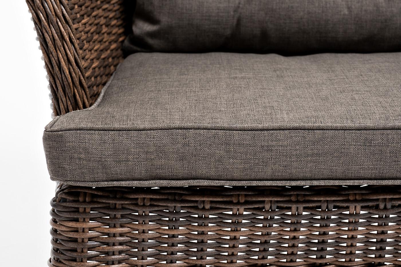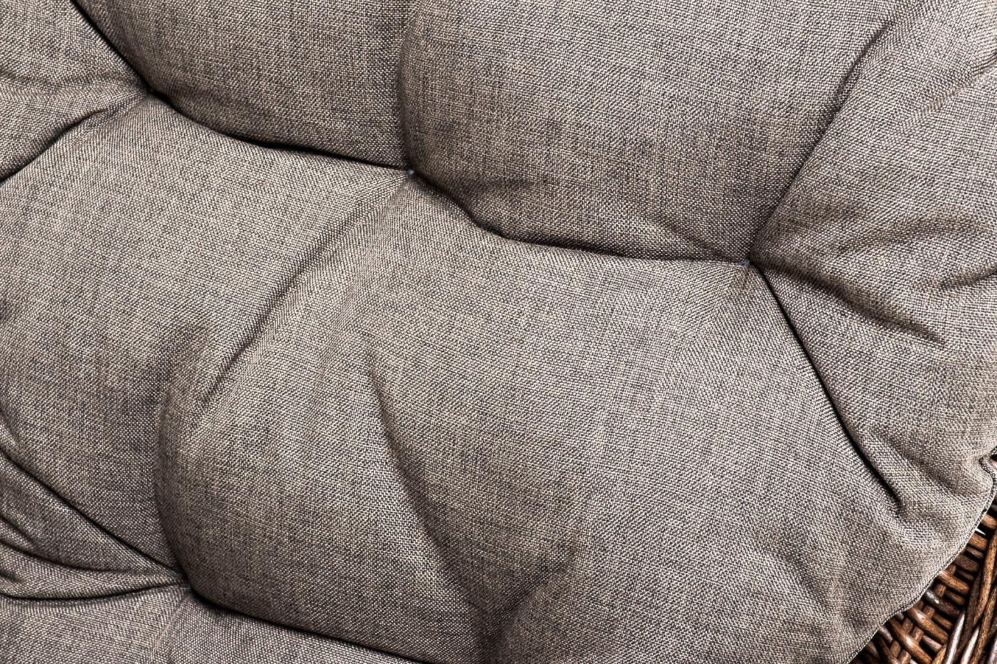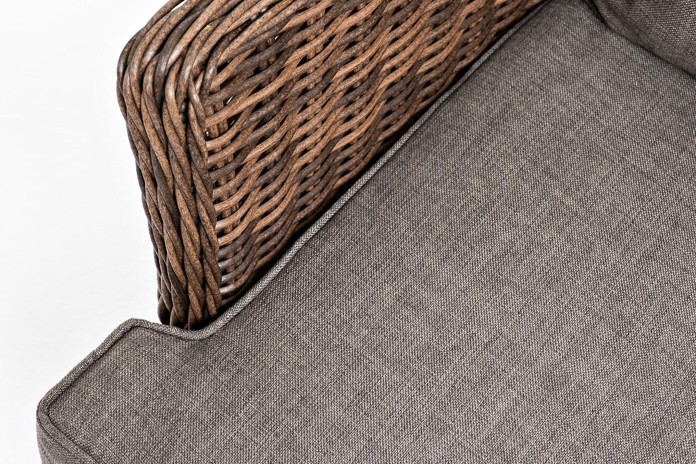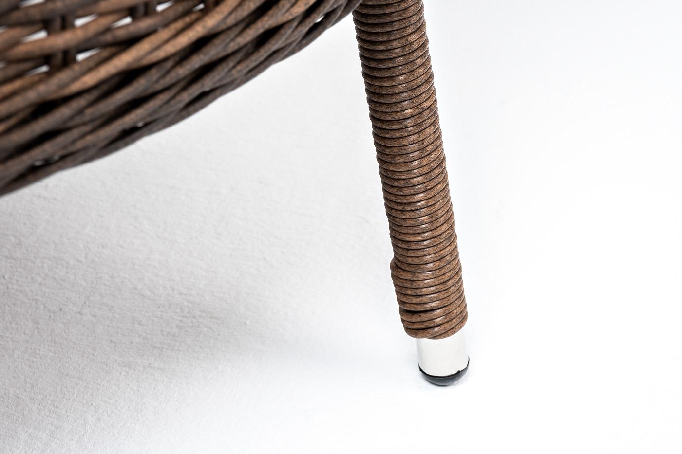 Кресло «Алиса» имеет нестандартную форму и хорошо сочетается с круглыми столиками. Размер модели – 710×820×1105 мм. Каркас выполнен из высококачественного алюминия, который оплетен круглым искусственным ротангом коричневого цвета. В садовое кресло укомплектовывается мягкими подушками. Они пошиты из износостойкого полиэстера серого оттенка с плотностью 300гр/м2. Защитные свойства синтетического материала усиливаются благодаря влагоотталкивающей пропитке. Параметры кресла без подушек: Глубина