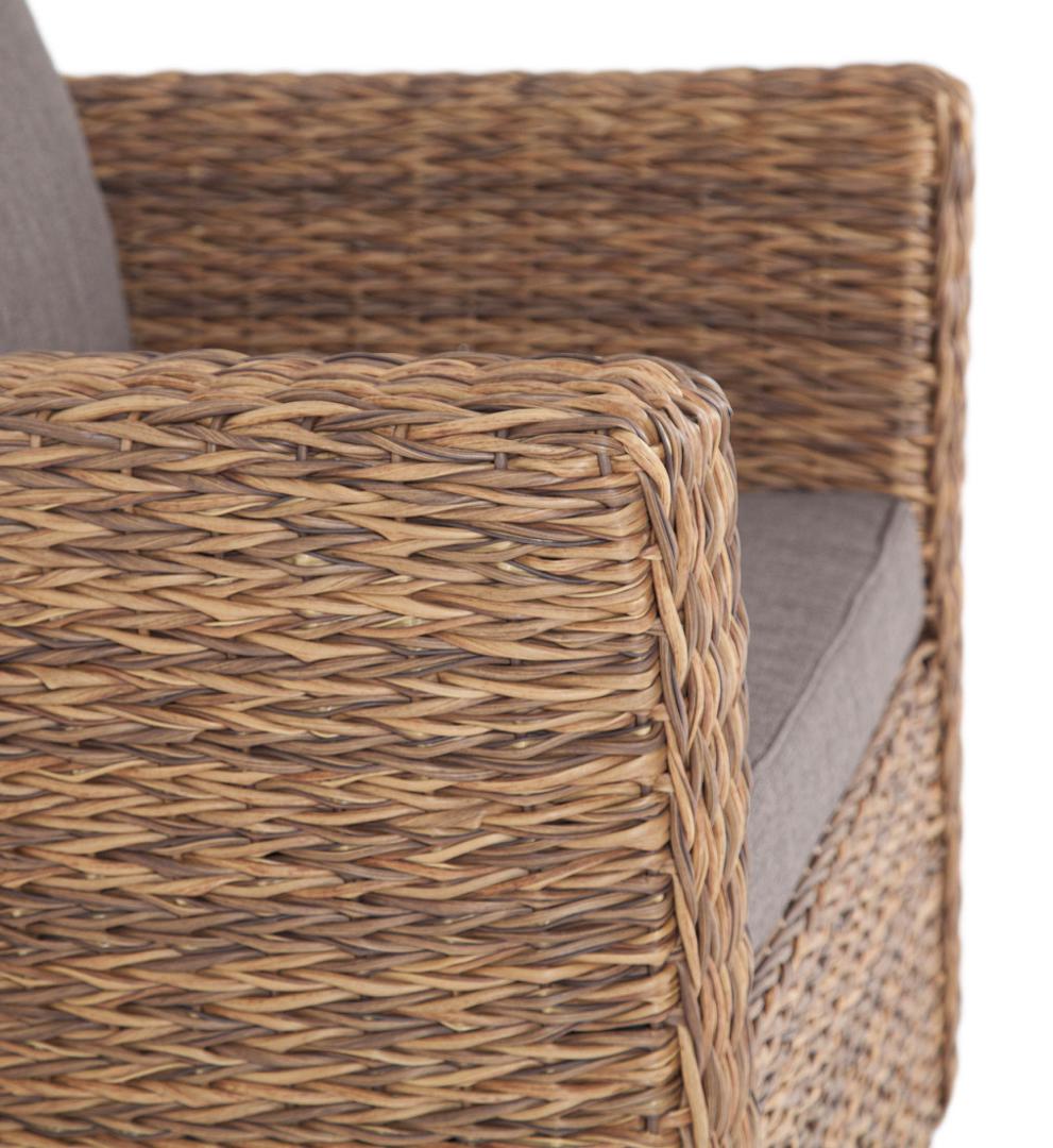 Кресло «Капучино» является практичным дополнением зоны отдыха, обустроенной мебелью из этой же серии. Размер модели – 1040×865×815 мм. Каркас изготовлен из прочного алюминия, оплетенного вручную искусственным ротангом вида «гиацинт» соломенного оттенка. Две подушки серого цвета представлены в комплекте с садовым креслом. Изделия пошиты из полиэстера плотностью 300гр/м2. В обязательном порядке материал обрабатывается влагоотталкивающей пропиткой для усиления своих защитных свойств. Парамет