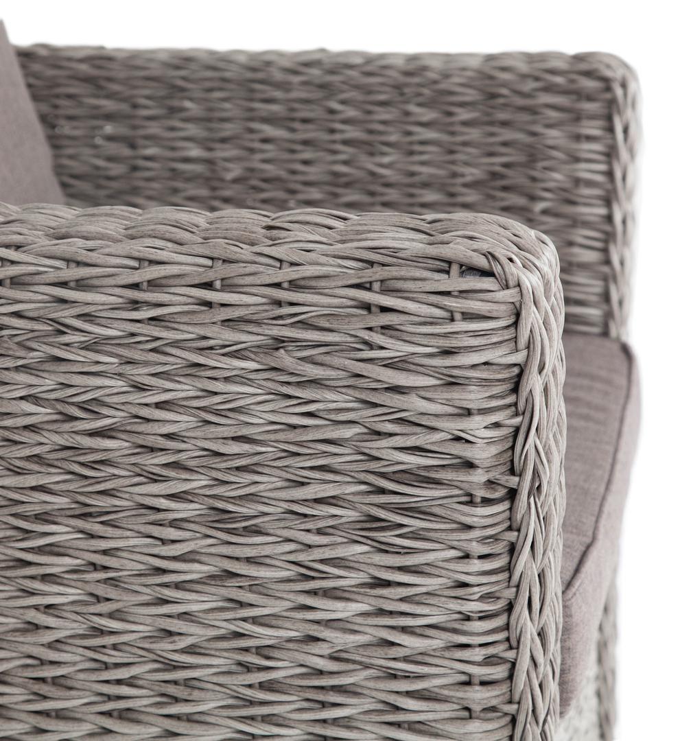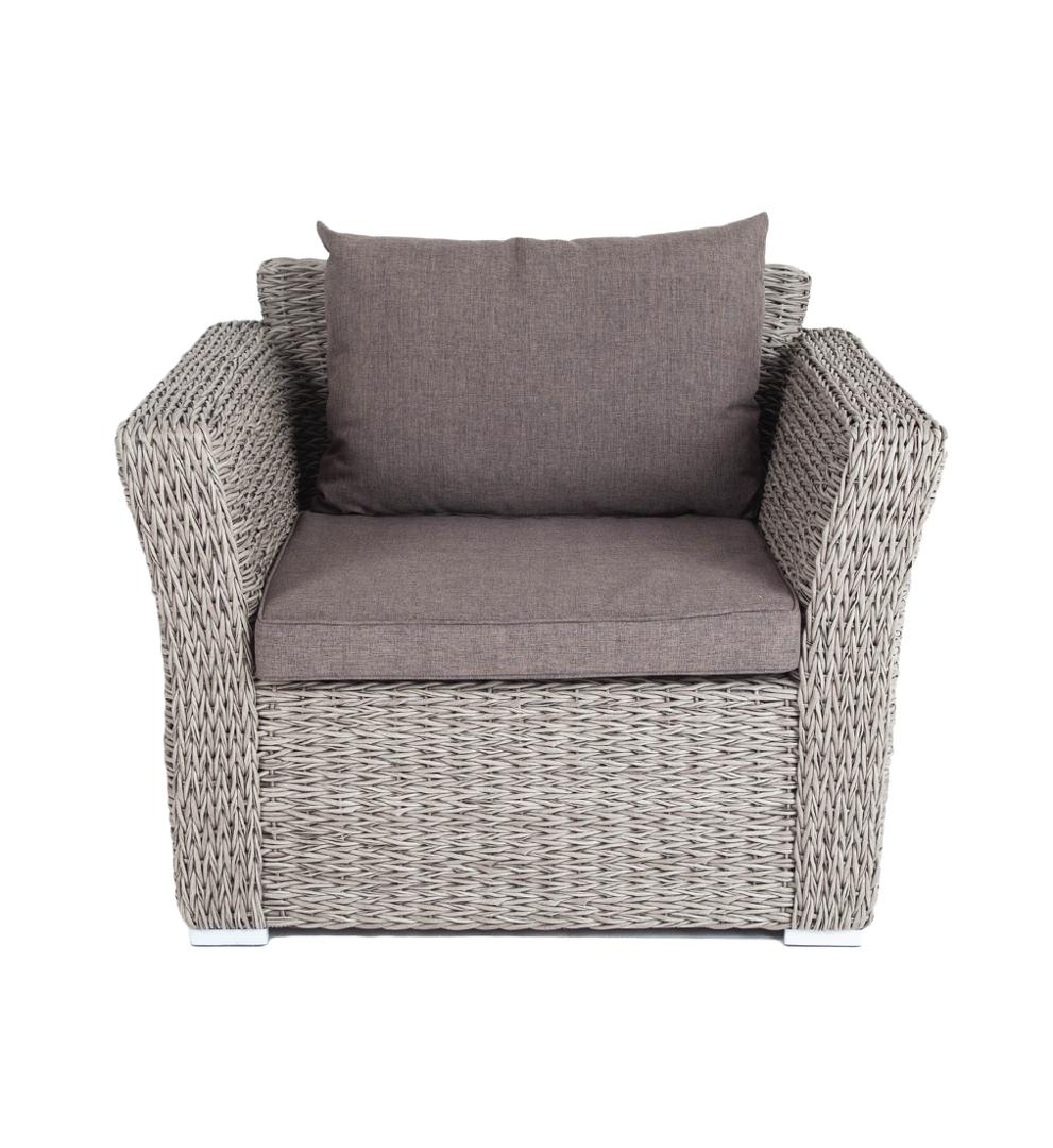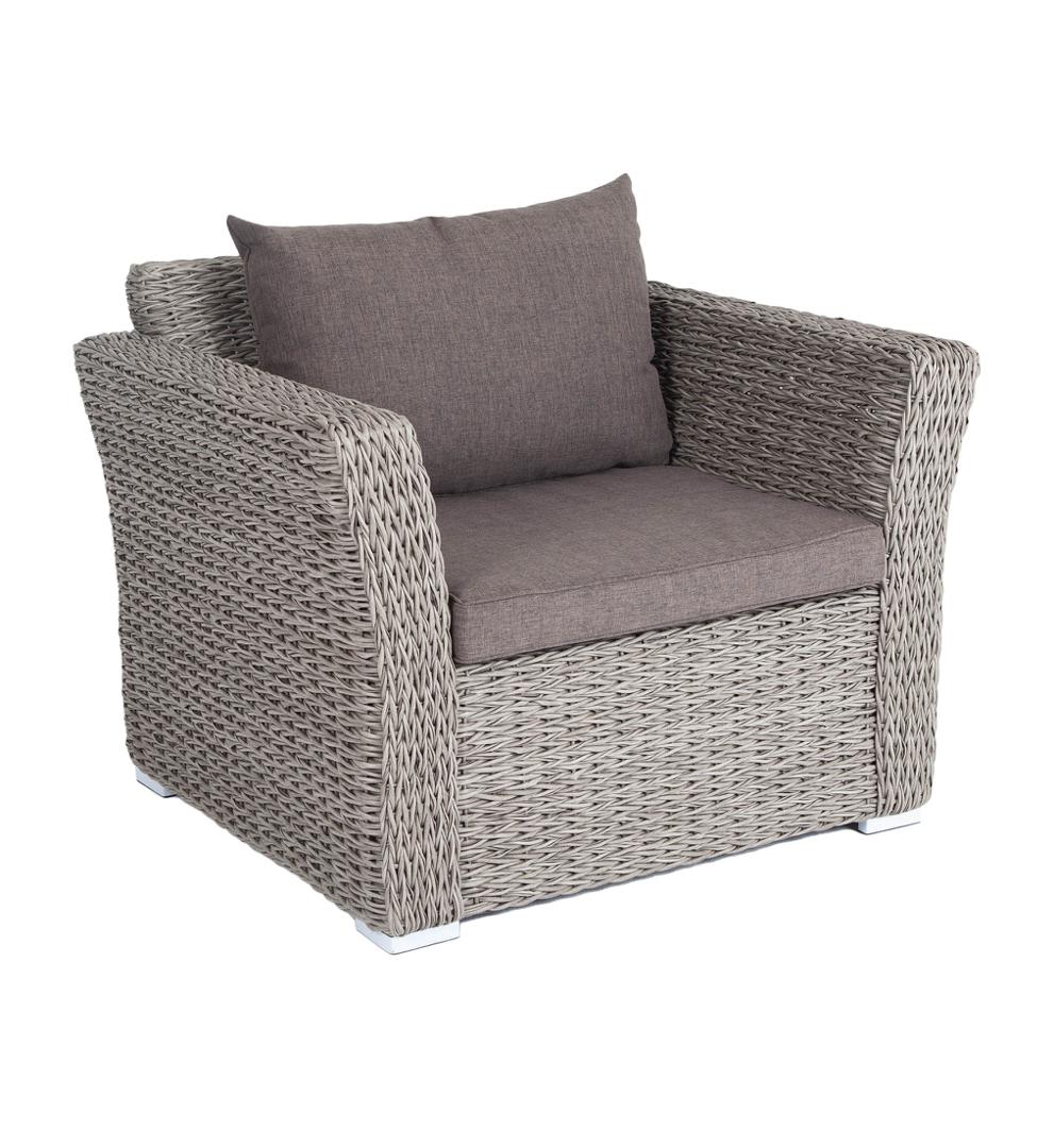 Кресло из искусственного ротанга «Капучино» серого цвета, прекрасно подходит для обустройства веранды, а относительно небольшой вес, который составляет 21,5 кг, увеличивает мобильность данной модели. Плетение используется вида «гиацинт». Габаритные размеры: 1040×865×815 мм. Модель оснащена удобными подушками с влагоотталкивающей пропиткой. Параметры кресла без подушек: Глубина сидения – 630 мм; Высота сидения – 370 мм; Высота спинки – 470 мм.