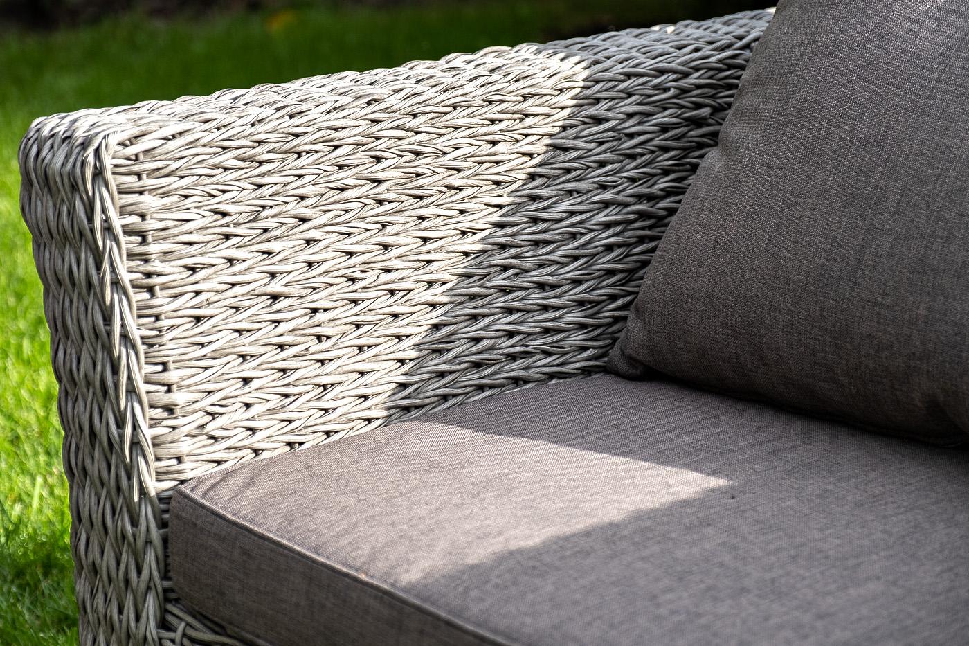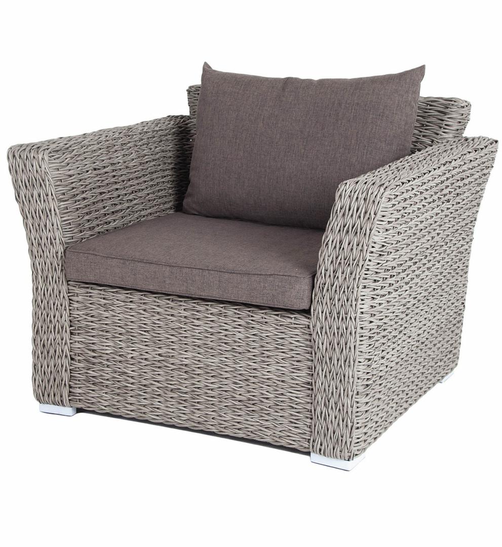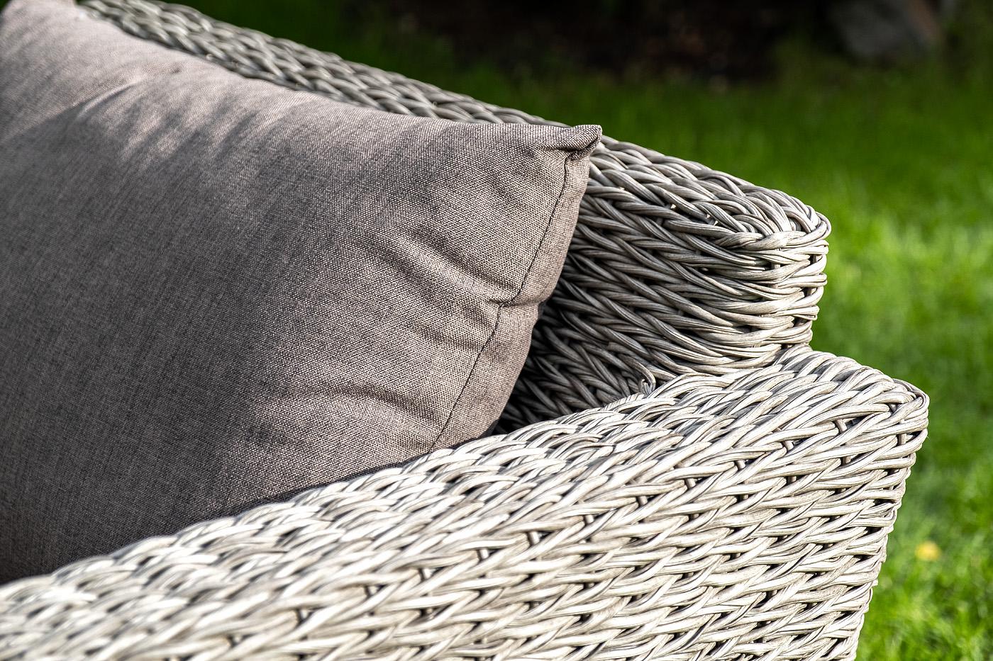 Кресло из искусственного ротанга «Капучино» серого цвета, прекрасно подходит для обустройства веранды, а относительно небольшой вес, который составляет 21,5 кг, увеличивает мобильность данной модели. Плетение используется вида «гиацинт». Габаритные размеры: 1040×865×815 мм. Модель оснащена удобными подушками с влагоотталкивающей пропиткой. Параметры кресла без подушек: Глубина сидения – 630 мм; Высота сидения – 370 мм; Высота спинки – 470 мм.