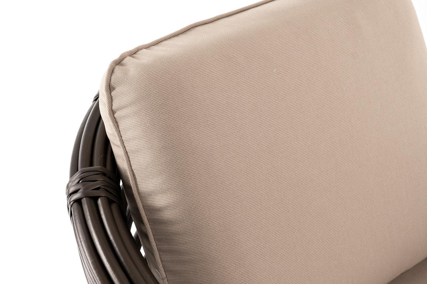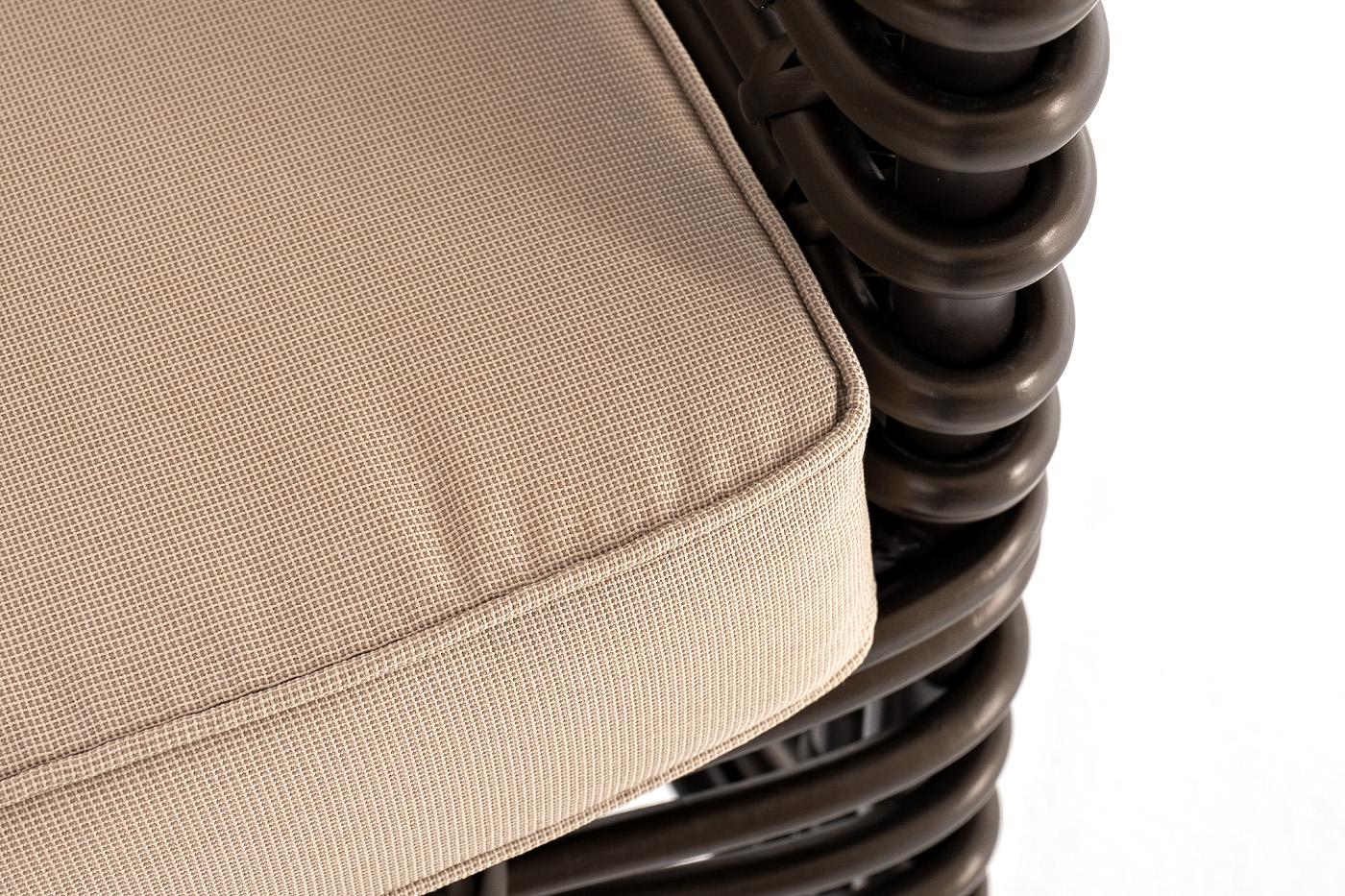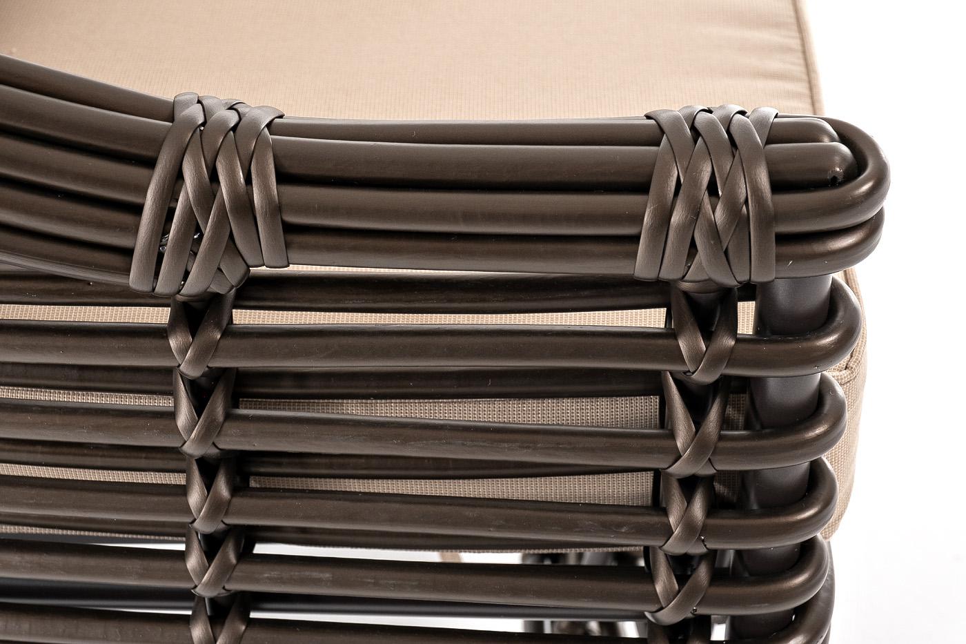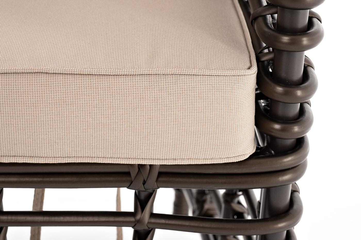 Кресло «Блисс» предназначено для комфортного времяпровождения в зоне отдыха. Каркас мебели сделан из прочного алюминия с высокими эксплуатационными качествами. Оплетен вручную с помощью круглого искусственного ротанга. Представлено в бронзовом оттенке. Садовое кресло укомплектовано удобными бежевыми подушками. Полиэстер используется при пошиве тканевых изделий, плотность которого - 300гр/м2. Материал имеет обязательную влагоотталкивающую пропитку для усиления его защитных свойств. Размер мод