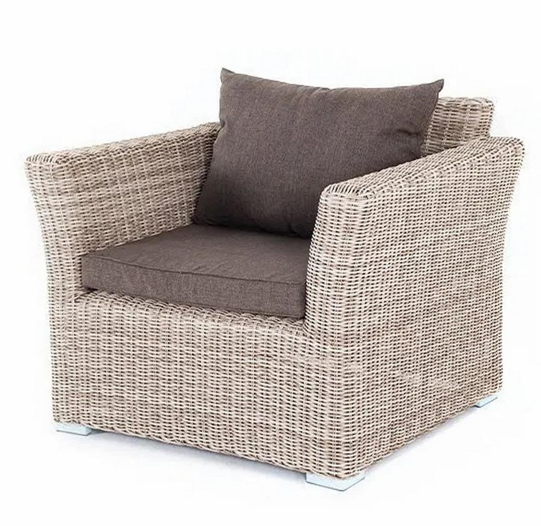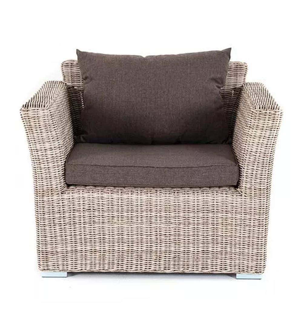 Кресло из круглого искусственного ротанга «Капучино» бежевого цвета, отлично вписывается в садовый антураж. В основе - прочный алюминиевый каркас, который отвечает за надежность конструкции. Размеры кресла - 1040×865×815 мм, в комплектацию входят две подушки, произведенные из полиэстера с влагоотталкивающей пропиткой. Параметры кресла без подушек: Глубина сидения – 630 мм; Высота сидения – 370 мм; Высота спинки – 470 мм.