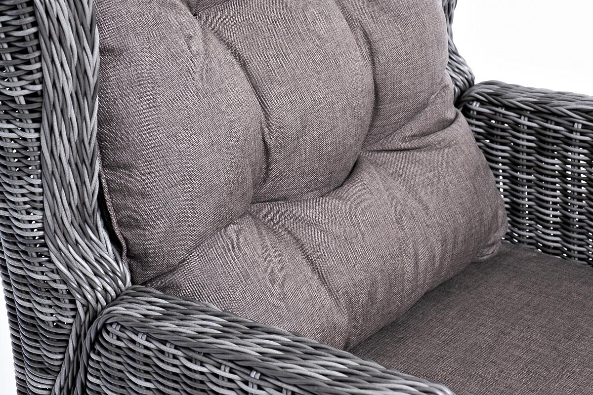 Многофункциональное раскладное кресло «Форио» дает возможность практично обустроить любую зону отдыха. В собранном виде его можно использовать в качестве обеденного стула, а с откидной спинкой – в качестве удобного лежака. Размер модели – 730×830×1015 мм. В основе мебели находится алюминиевый каркас высокой прочности, оплетенный круглым искусственным ротангом. Представлена в графитовом оттенке. Садовое кресло дополнено практичными подушками для комфортного размещения. Они выполнены в серо