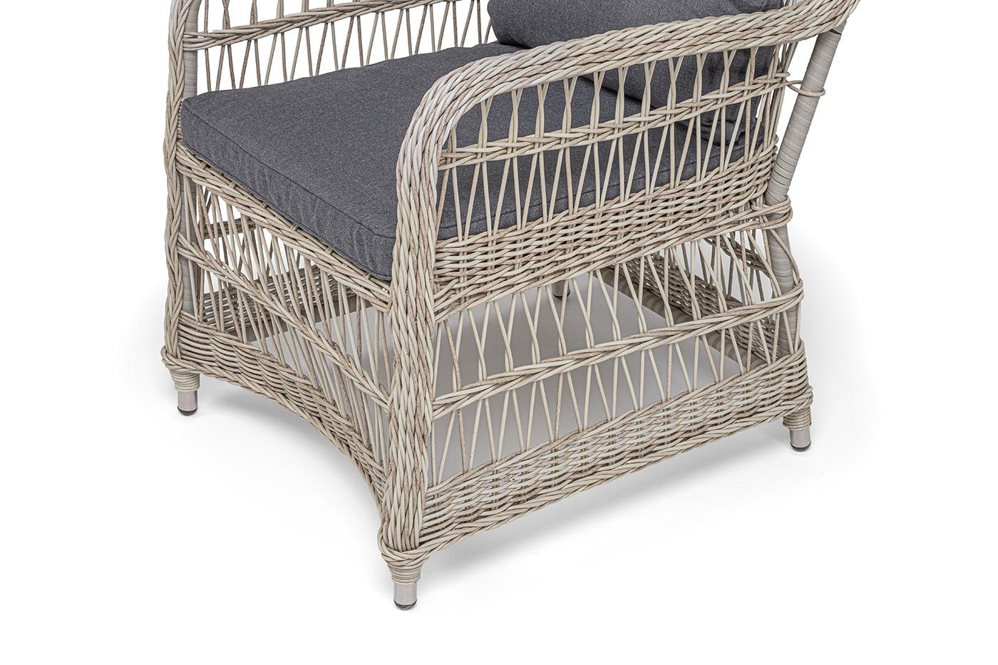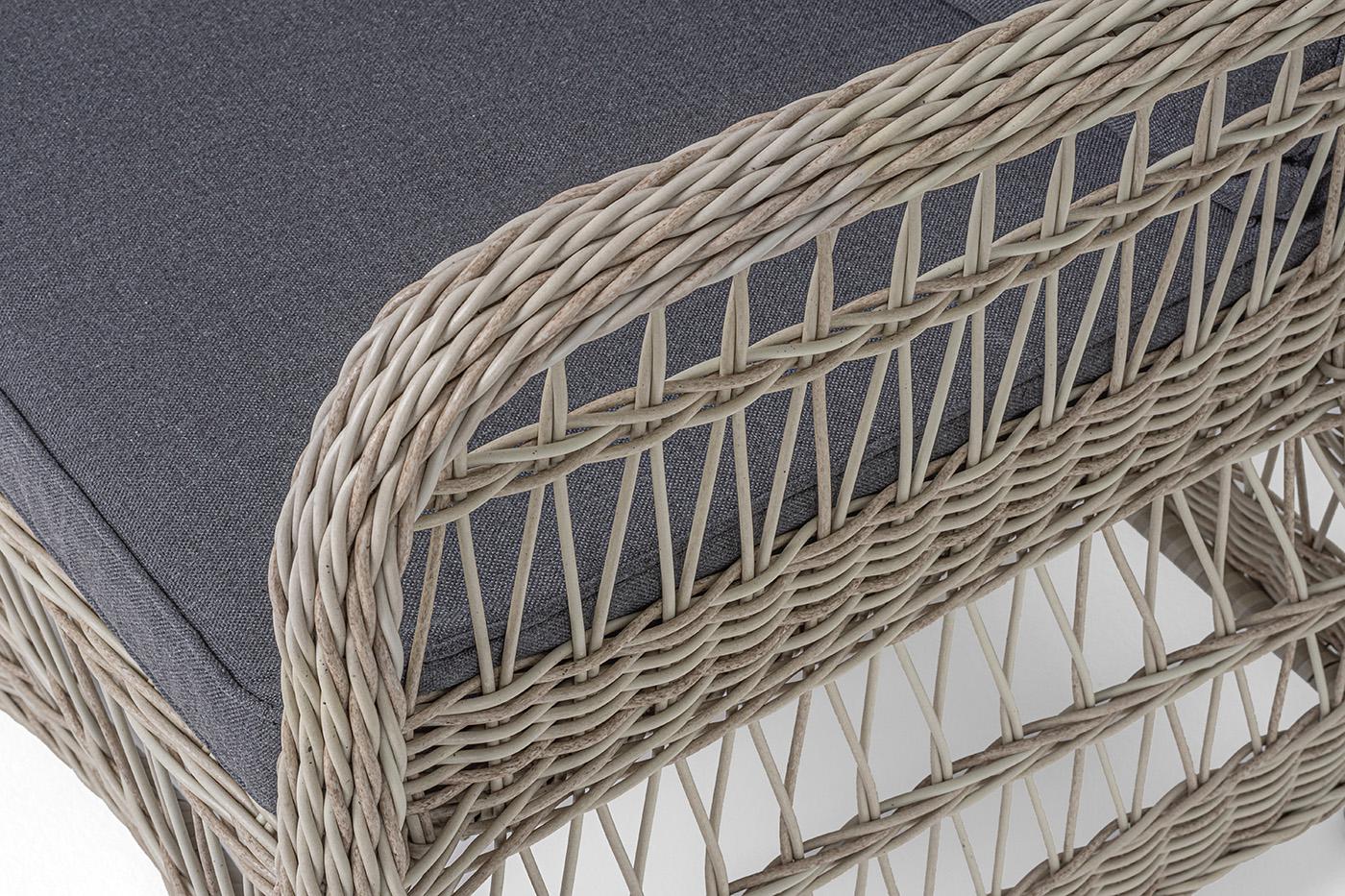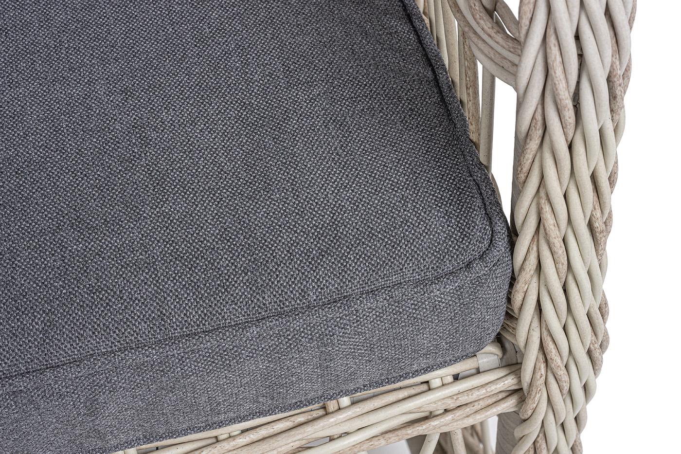 Кресло «Цесена» имеет практичные подлокотники для удобного размещения во время отдыха. Алюминиевый каркас находится в основе мебели. Он характеризуется устойчивостью и высокой прочностью. Задекорирован ручной круглой оплеткой, которая сделана из искусственного ротанга. Представлена в бежевом оттенке. Садовое кресло располагает двумя мягкими подушками, которые идут в комплекте. Они выполнены в сером цвете. Полиэстер высокого качества используется при пошиве тканевых изделий. Его плотность 300г