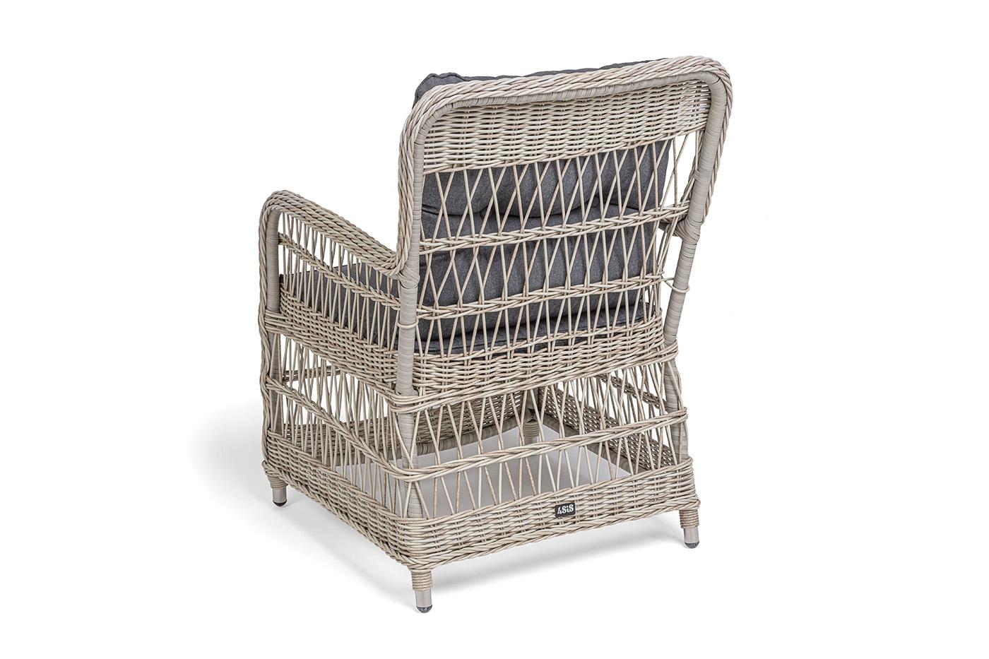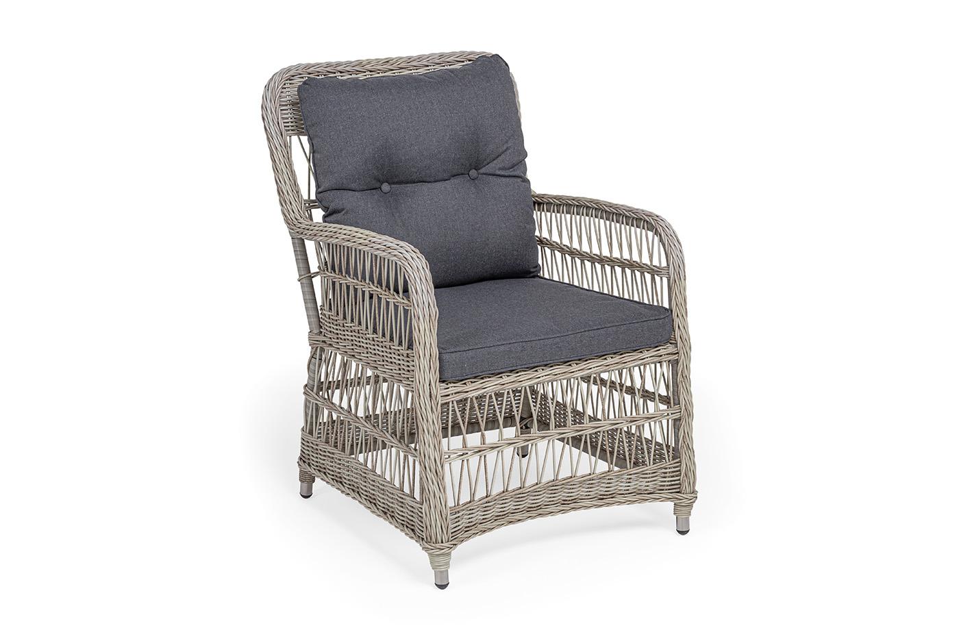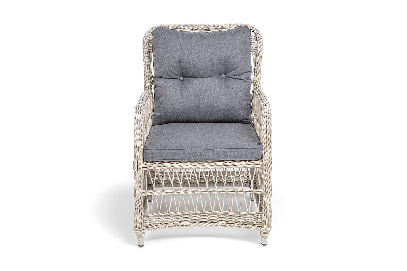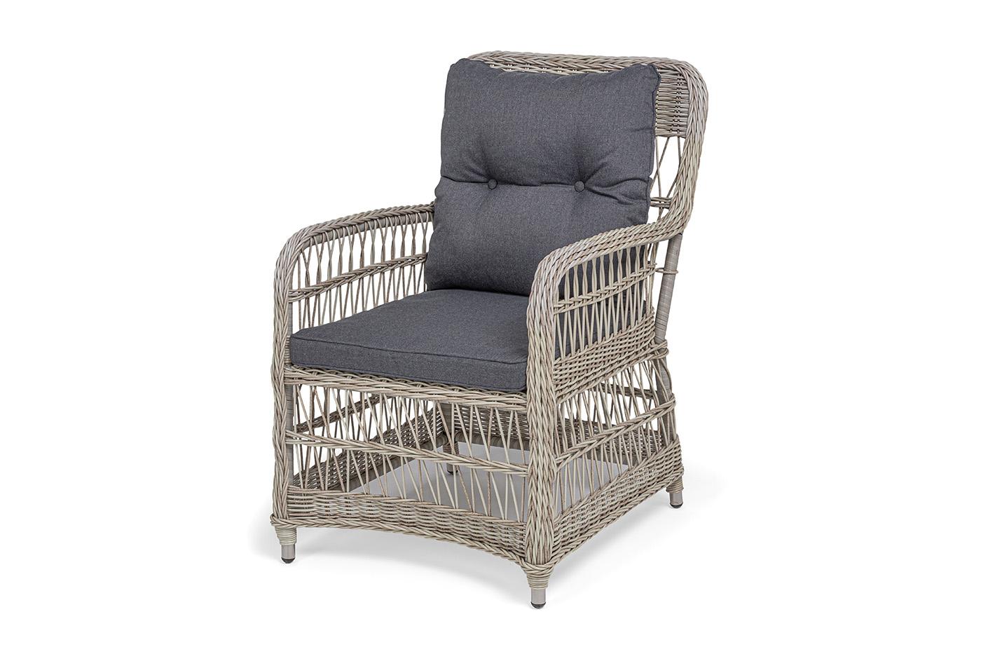 Кресло «Цесена» имеет практичные подлокотники для удобного размещения во время отдыха. Алюминиевый каркас находится в основе мебели. Он характеризуется устойчивостью и высокой прочностью. Задекорирован ручной круглой оплеткой, которая сделана из искусственного ротанга. Представлена в бежевом оттенке. Садовое кресло располагает двумя мягкими подушками, которые идут в комплекте. Они выполнены в сером цвете. Полиэстер высокого качества используется при пошиве тканевых изделий. Его плотность 300г