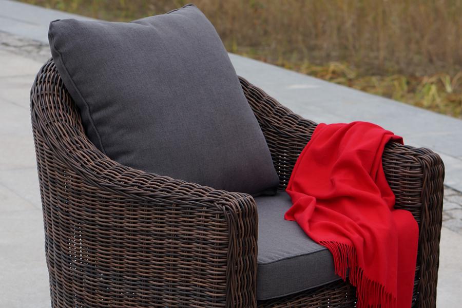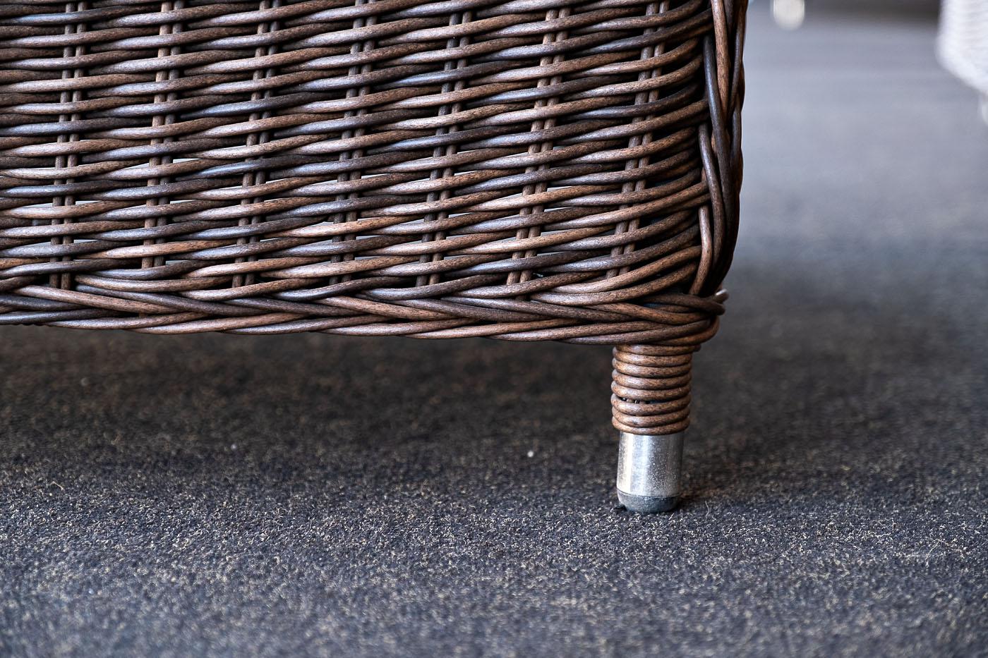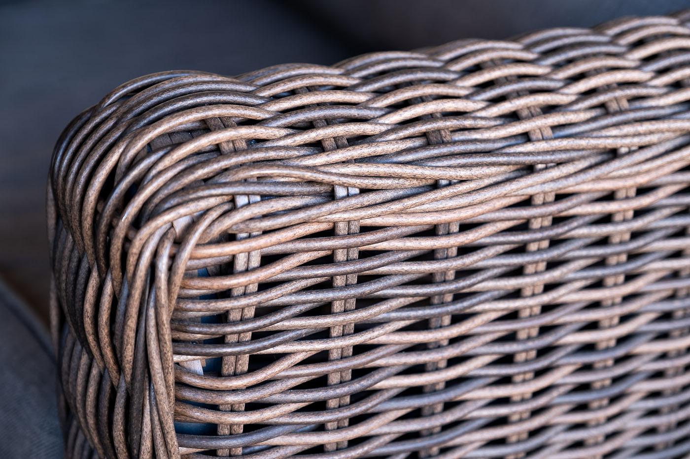 Кресло «Кон Панна» входит в лаунж-зону, состоящую из двухместного дивана, двух кресел и журнального столика. Но также может использоваться в качестве отдельного предмета. Размер модели – 800×800×800 мм. В качестве основы служит алюминиевый каркас, который оплетен круглым искусственным ротангом коричневого оттенка. У кресла есть мягкие подушки, выполненые в сером цвете. Они сделаны из прочного полиэстера с плотностью 300гр/м2. Ткань имеет влагоотталкивающую пропитку, которая защищает ее от