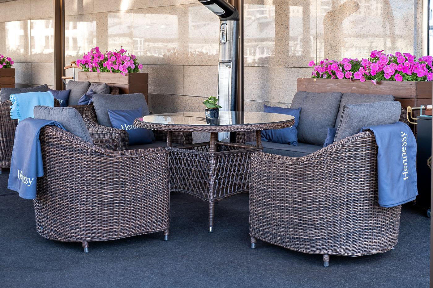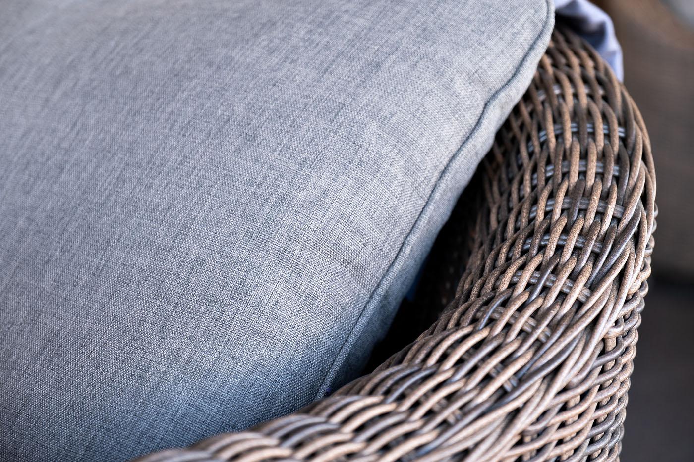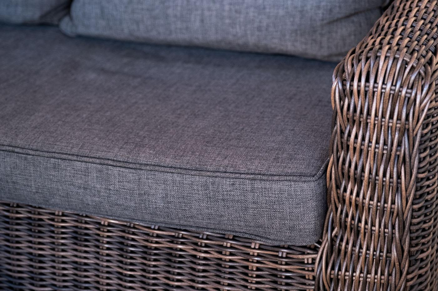 Кресло «Кон Панна» входит в лаунж-зону, состоящую из двухместного дивана, двух кресел и журнального столика. Но также может использоваться в качестве отдельного предмета. Размер модели – 800×800×800 мм. В качестве основы служит алюминиевый каркас, который оплетен круглым искусственным ротангом коричневого оттенка. У кресла есть мягкие подушки, выполненые в сером цвете. Они сделаны из прочного полиэстера с плотностью 300гр/м2. Ткань имеет влагоотталкивающую пропитку, которая защищает ее от