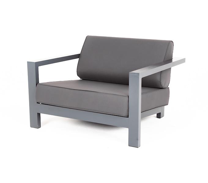 Стильное кресло «Гранада» для создания зоны отдыха. Каркас выполнен из высокопрочного легкого алюминия темно-серого (RAL7024) цвета. На сидениях и спинке предусмотрены подушки темно-серого оттенка. Приятное дополнение − подушки со съёмными чехлами. Изделие рассчитано на активное использование как под открытым небом, так и в помещении, в том числе в зоне повышенной влажности. Кресло устойчиво к механическим повреждениям, деформациям, изгибам. Габариты алюминиевого кресла: 1000×900×550 мм