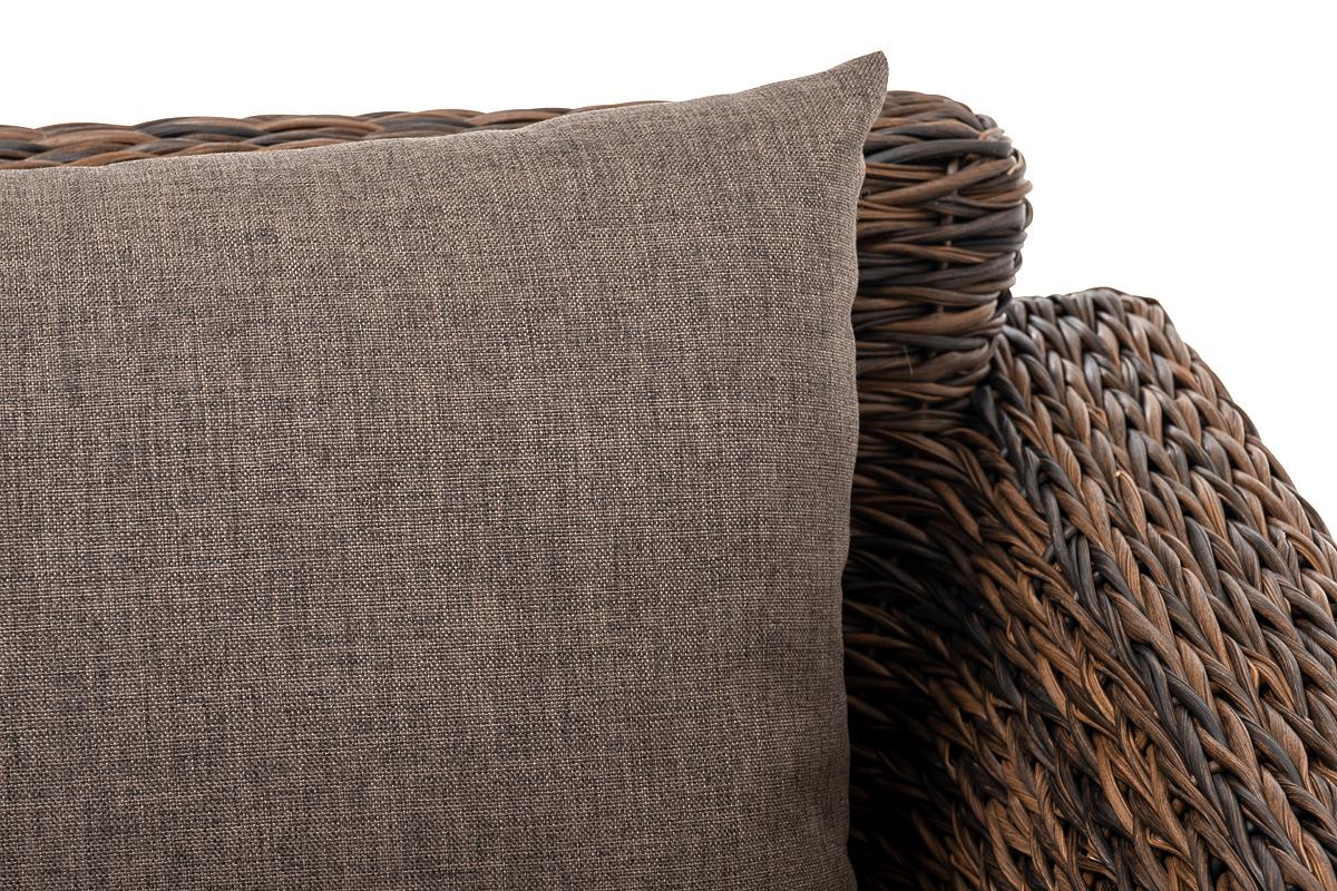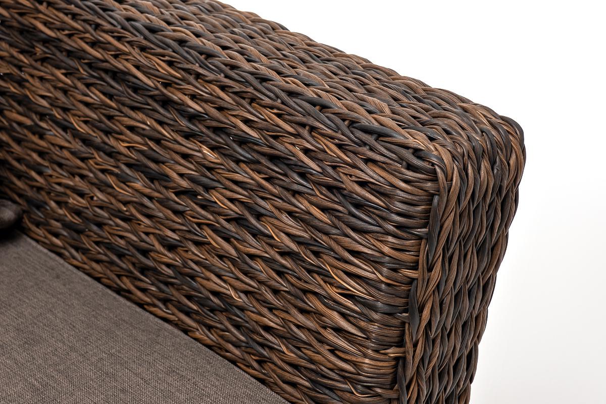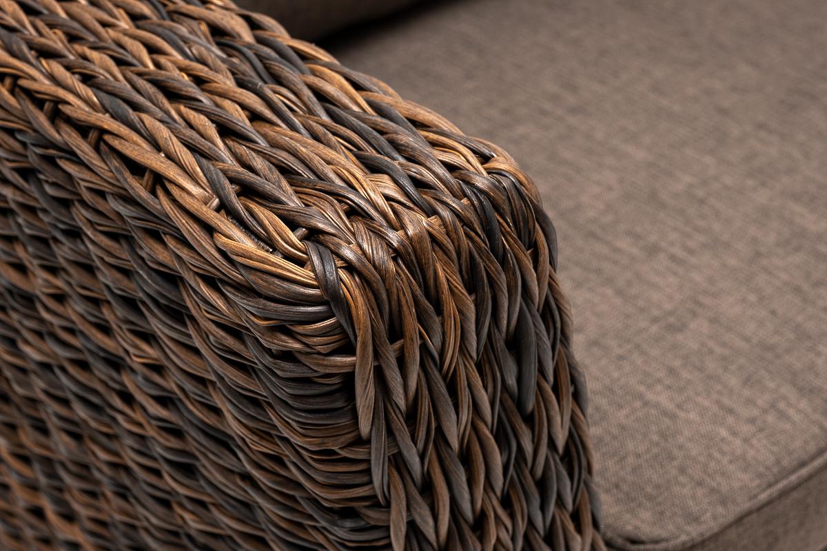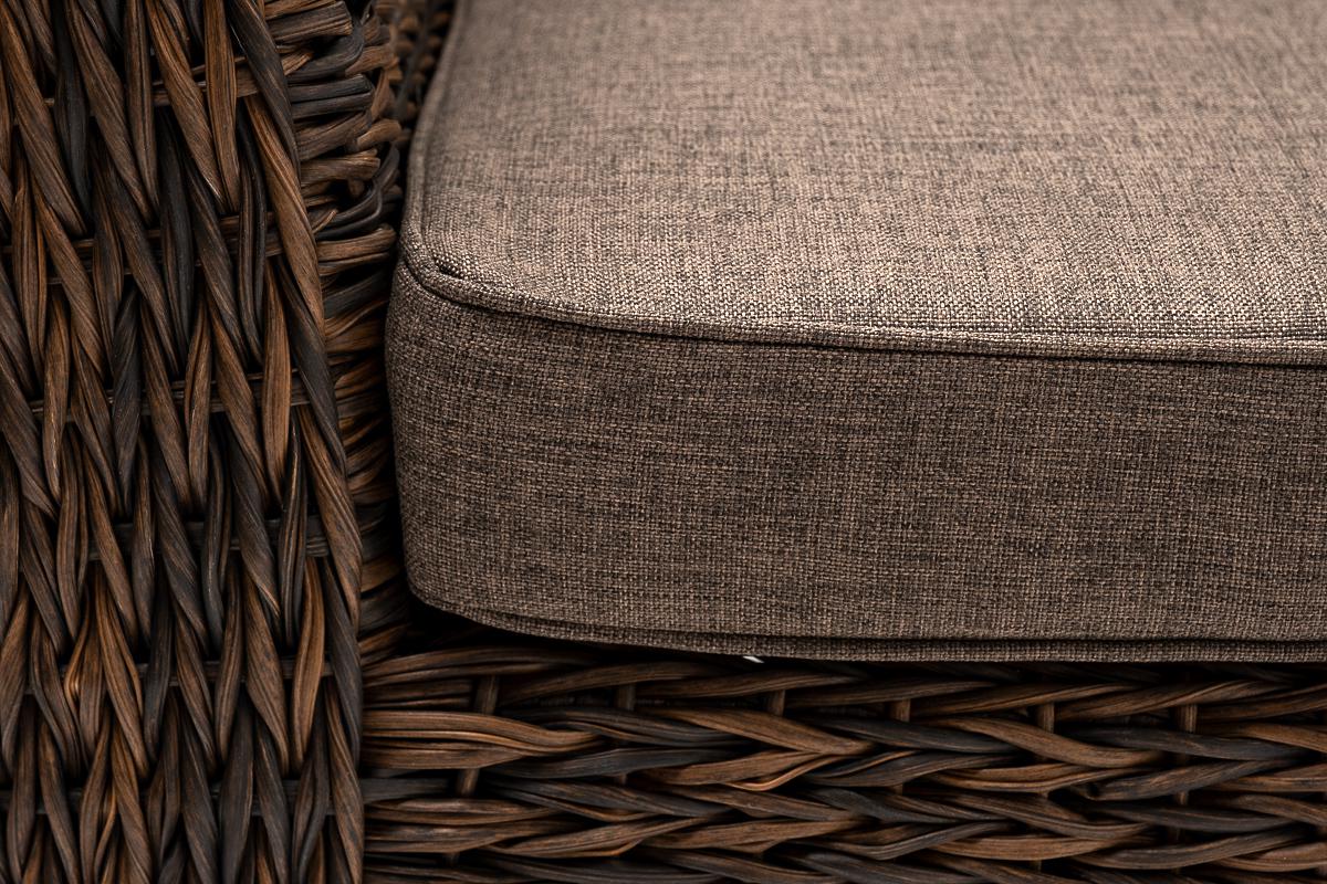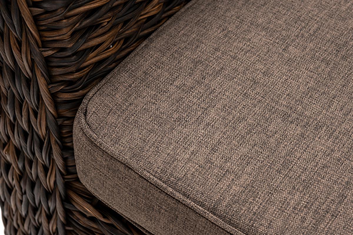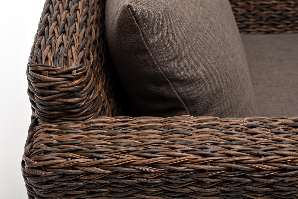 Кресло из искусственного ротанга «Капучино» коричневого цвета, прекрасно подходит для обустройства веранды, а относительно небольшой вес, который составляет 21,5 кг, увеличивает мобильность данной модели. Плетение используется вида «гиацинт». Габаритные размеры: 1040×865×815 мм. Модель оснащена удобными подушками с влагоотталкивающей пропиткой. Параметры кресла без подушек: Глубина сидения – 630 мм; Высота сидения – 370 мм; Высота спинки – 470 мм.