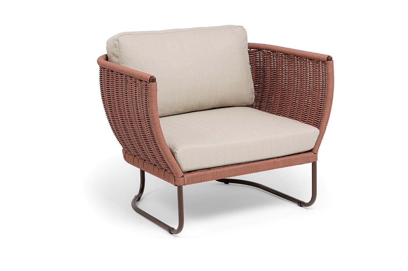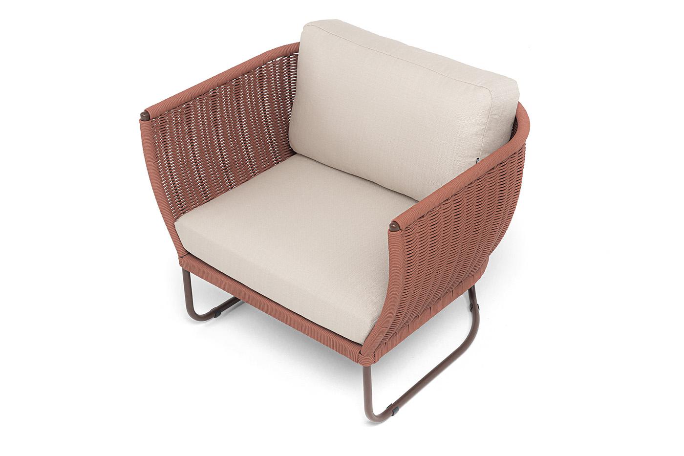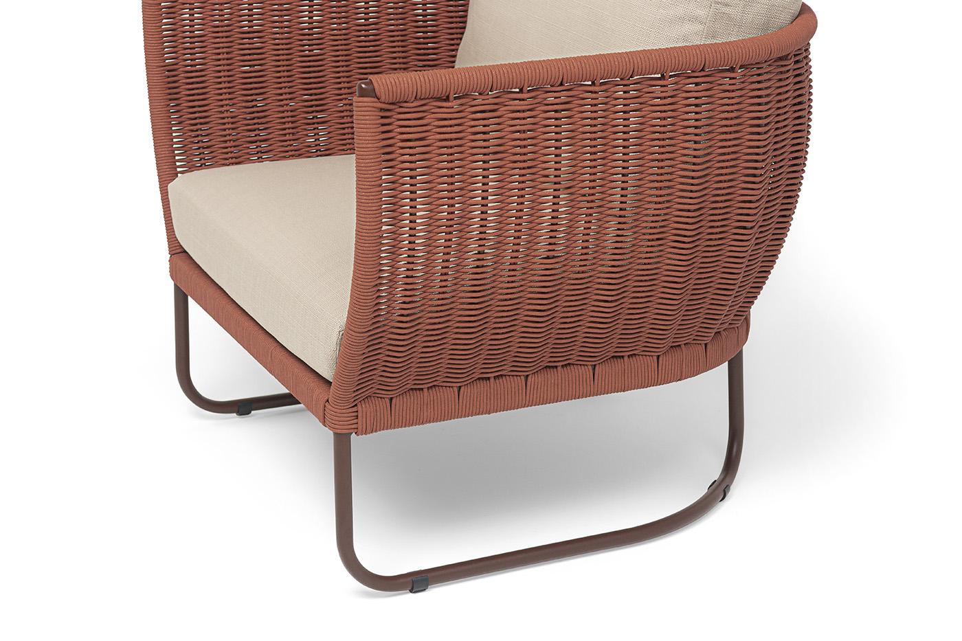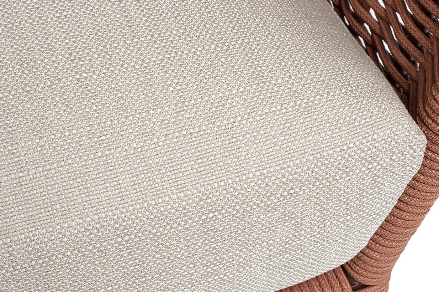Кресло 4SIS "Фиджи" кресло плетеное из роупа, каркас алюминий коричневый (RAL8016) муар, роуп красный (8372) круглый tex, ткань Mossle бежевая арт. FID-A-002 RAL8016 Mua T-red8372(beige160)
