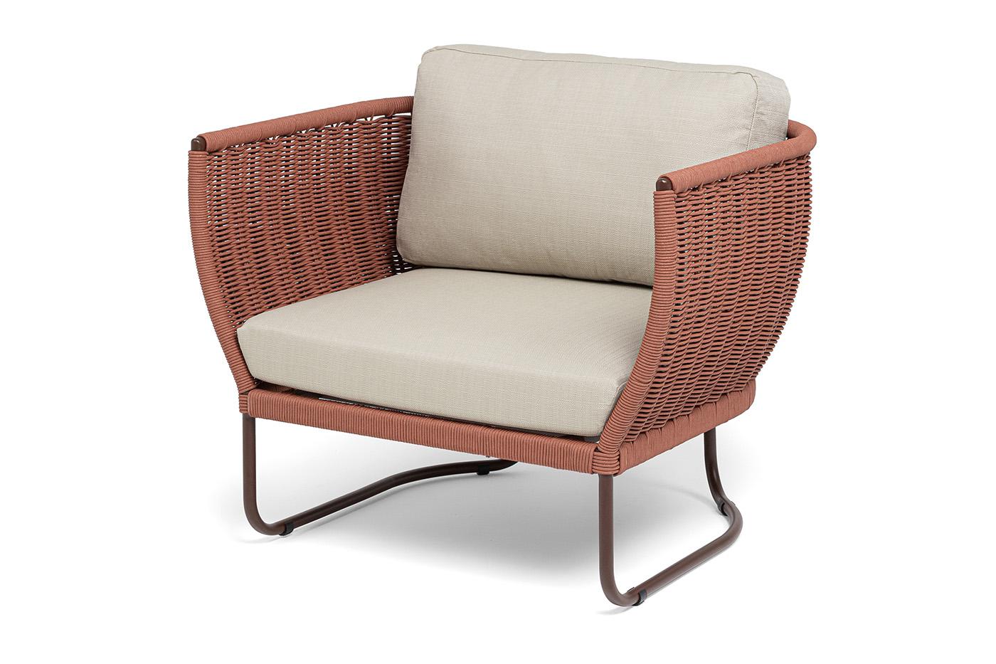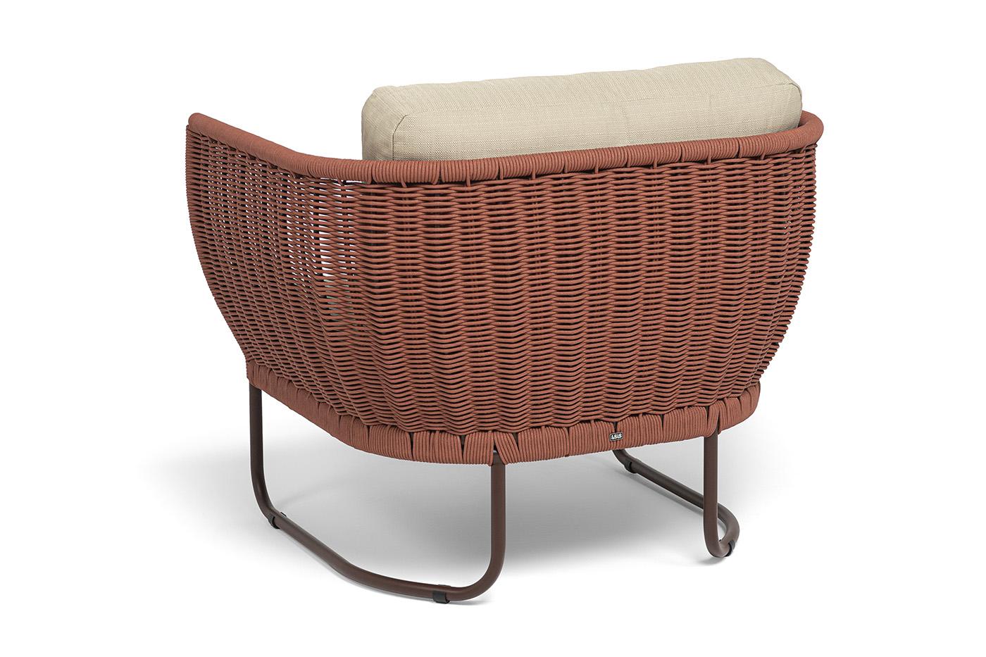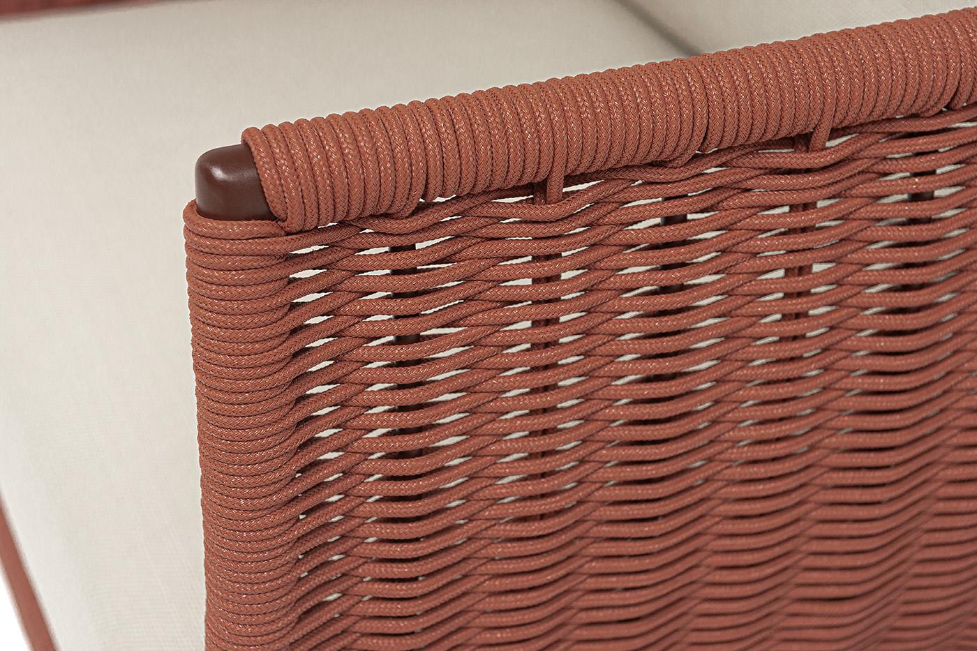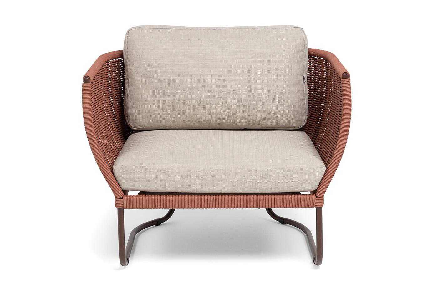Кресло 4SIS "Фиджи" кресло плетеное из роупа, каркас алюминий коричневый (RAL8016) муар, роуп красный (8372) круглый tex, ткань Mossle бежевая арт. FID-A-002 RAL8016 Mua T-red8372(beige160)