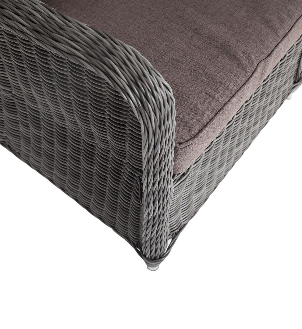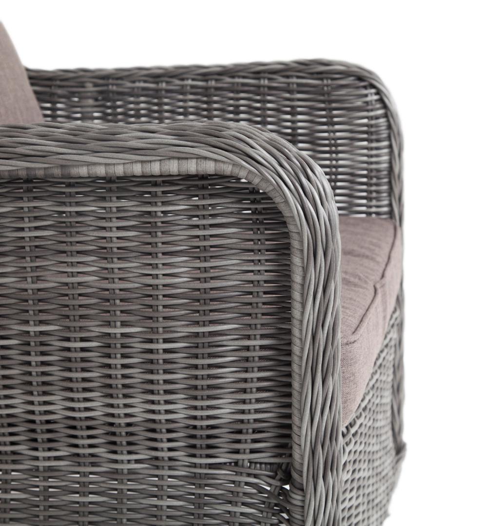 Кресло из искусственного ротанга «Гляссе» станет прекрасным дополнением к месту отдыха. Кресло оснащено каркасом из прочного алюминия, а его оплетка выполнена из круглого ротанга ручного плетения графитового цвета. В комплектацию входят мягкие подушки из влагоотталкивающего полиэстера, плотностью 300гр/м2. Габариты модели составляют 730×880×990 мм. Параметры кресла без подушек: Глубина сидения – 610 мм; Высота сидения – 340 мм; Высота спинки – 690 мм.