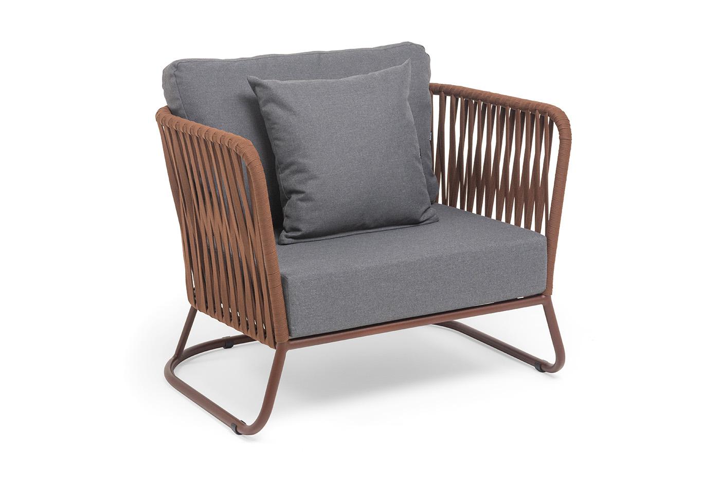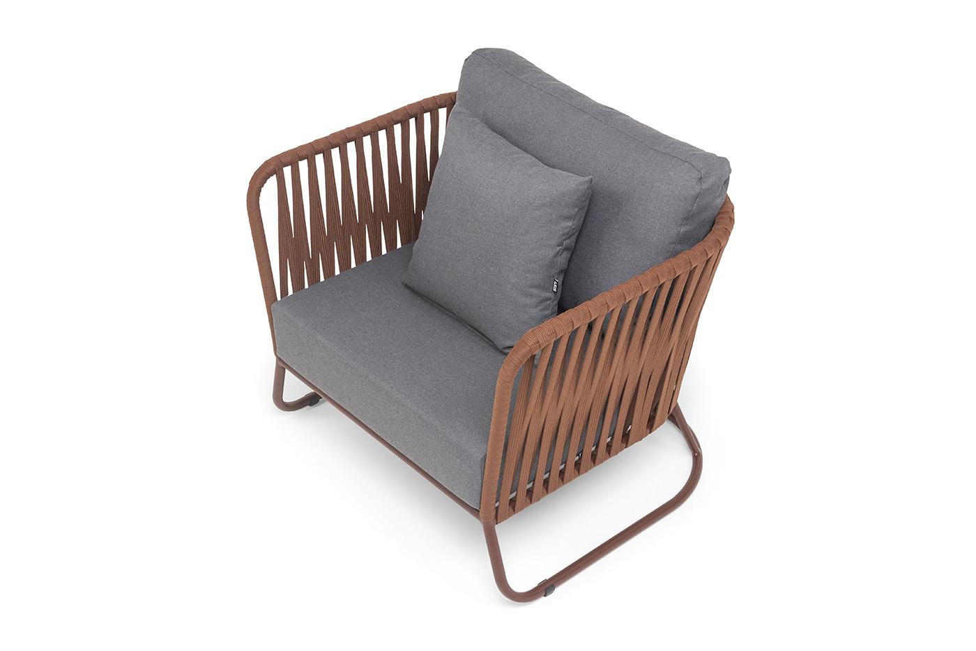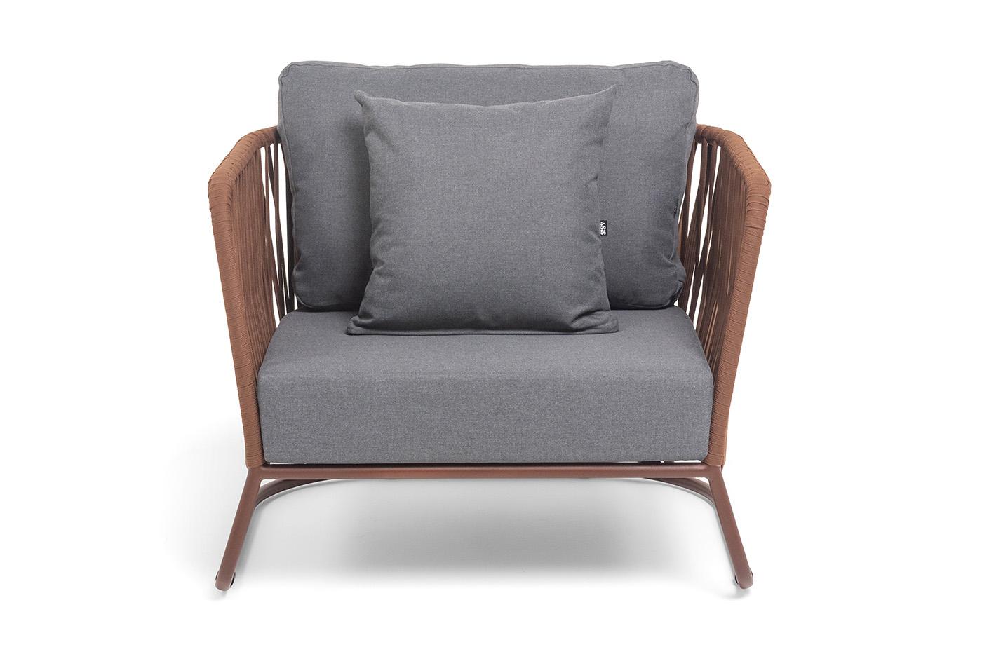 Кресло 4SIS "Багамы" кресло плетеное из роупа, каркас алюминий коричневый (RAL8016) муар, роуп BZ23-ED31, ткань темно-серая 027 арт. BAG-A-001 RAL8016 Mua BZ23-ED31 (D-gray027)