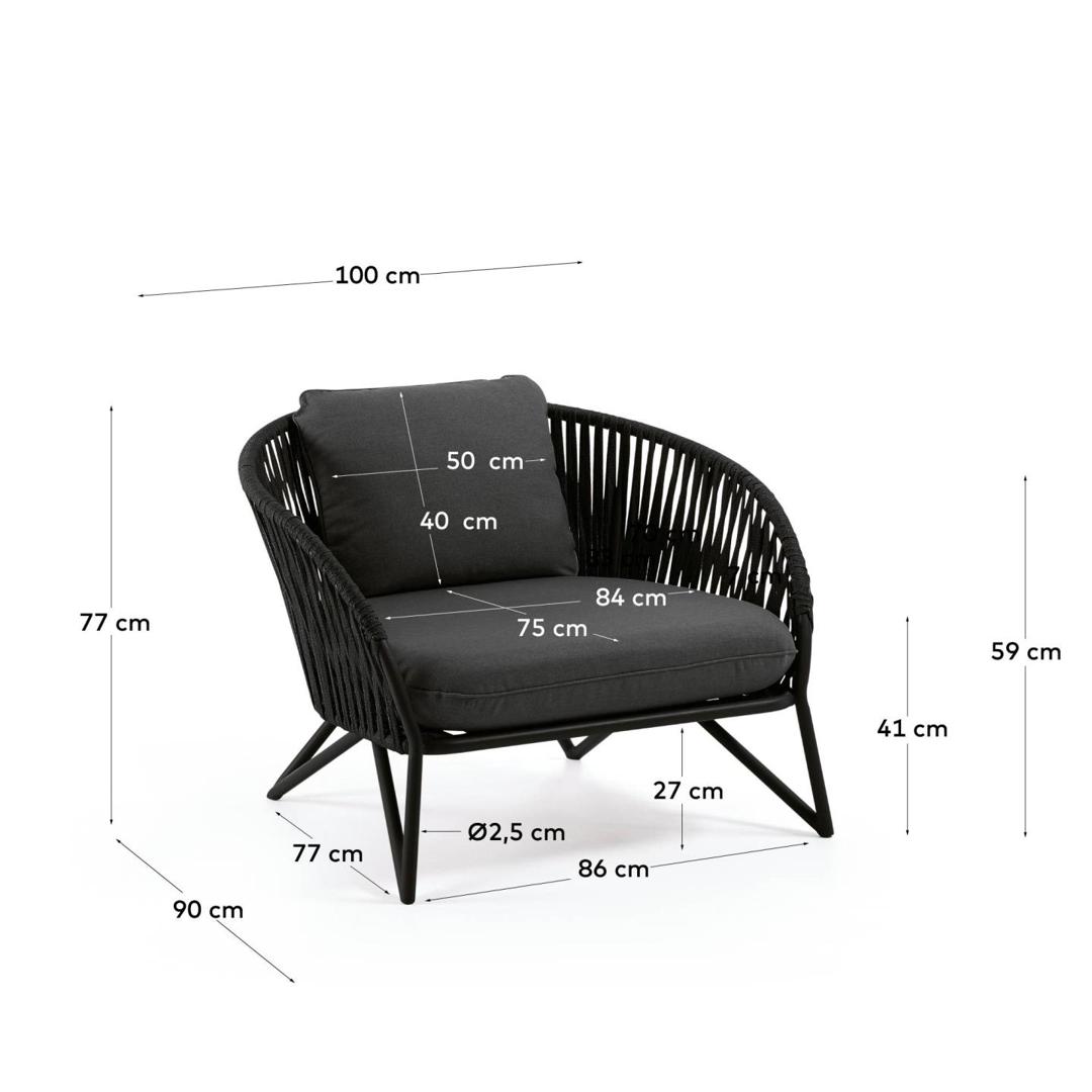 Веревочное кресло Branzie черное от фабрики La Forma (ex Julia Grup) – органичный вид из современных материалов для вашей террасы. Веревочное кресло Branzie вдохновит вас проводить на свежем воздухе времени больше. Широкая эргономичная структура сплетена против изгибов металлической конструкции из прочного шнура, что придает дизайну органичный вид, а вам подари комфорт. Воспользуйтесь отдыхом на улице по полной! Каркас кресла сделан из оцинкованной стали. Он имеет трубчатую структуру, с диаметром ножек 2, 5 см и высотой 27 см. Металл окрашен матовой черной эмалью методом распыления, благодаря чему поверхность идеально ровная, надежно защищена от появления коррозии. Сиденье оплетено шнуром черного цвета (100% полиэстер). Он прочный, стойкий к негативным внешним воздействиям (влага, ультрафиолет, растяжение). Дополнительно кресло укомплектовано двумя подушками серого цвета с синтетическим наполнителем. Их чехлы съемные, сшиты из прочного полиэстера. Высота нижней подушки – 12 см. Общая максимальная нагрузка – 130 кг. Размеры: ширина – 100 см, высота – 77 см, глубина – 90 см. Вес изделия – 11,6 кг. Сборка не требуется. Коллекция Branzie – это также диван, сделанный в аналогичном дизайне.