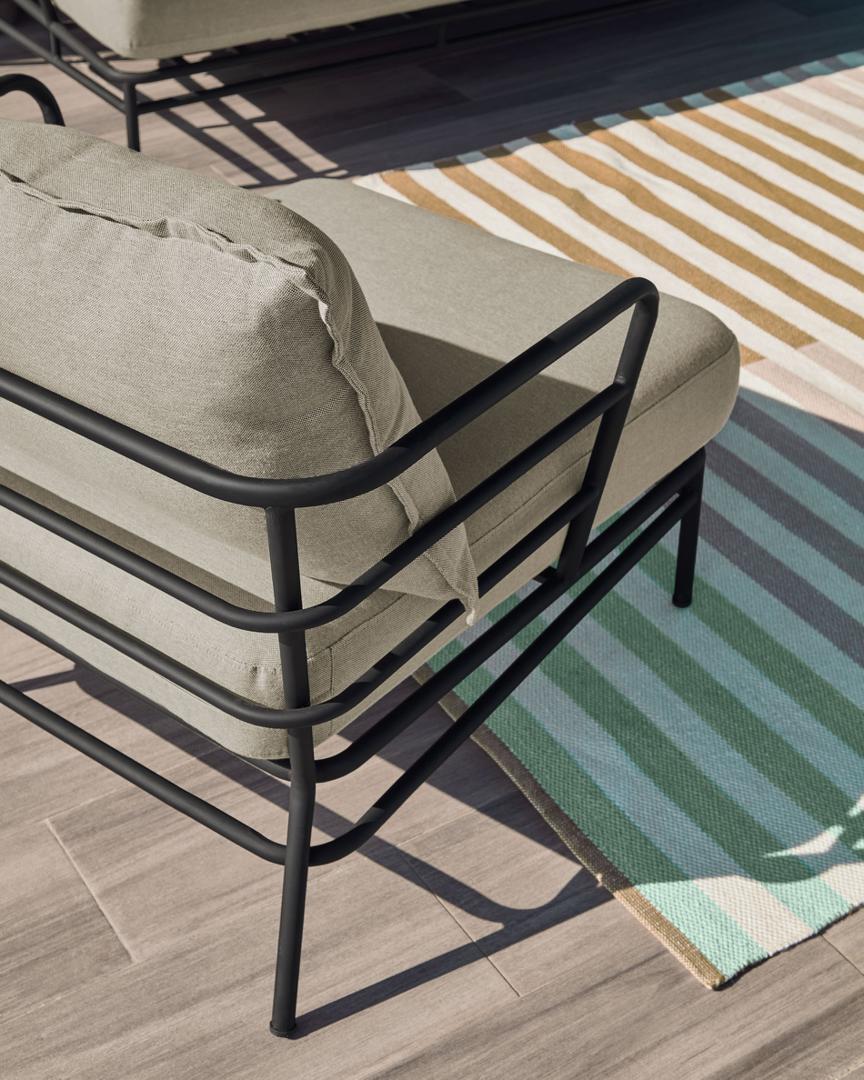 Кресло Mareluz из черной стали от фабрики La Forma (ex Julia Grup) – абсолютная практичность и долговечность. Кресло Mareluz – это ультрасовременный и минималистичный стиль, который наверняка оценят поклонники прогрессивных дизайнов. Здесь сталь задает тон всему изделию, показательно сковывая массивные подушки. Такая модель отлично подойдет для современных уличных или домашних интерьеров, станет отличным местом для отдыха. Кресло имеет сварную металлическую конструкцию, созданную из трубок диаметром 2,5 см. Металл окрашен в черный матовый цвет порошковой краской. Она защищает от коррозии, создает цветовую гармонию с подушками. На высоте 15 см от пола ножки дополнительно усилены поперечными перекладинами, которые помогают выдерживать весовую нагрузку (максимально допускается не более 130 кг). На каждой ножке установлен пластичный наконечник, который защищает напольное покрытие от повреждений. Подушки сшиты из полиэстера серого цвета, набиты синтетической пеной плотностью 70 кг/м3 (нижняя) и акриловыми волокнами (верхняя). Чехлы съемные, что облегчает уход за изделием, чистку. Размеры: ширина по ножкам – 59 см, высота – 60 см, глубина – 76 см, глубина сиденья – 70 см. Вес изделия – 12,5 кг. Поставка осуществляется в собранном виде. В коллекции Mareluz также представлен диван в аналогичном дизайне.