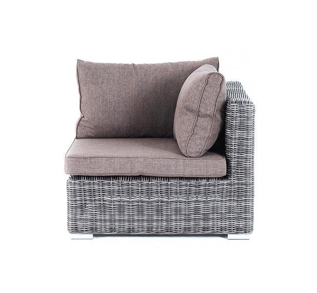 Угловой модуль из круглого искусственного ротанга «Лунго» является одним из звеньев для создания лаунж зоны по индивидуальным потребностям. Основа выполнена из алюминиевого каркаса, декорированного вручную оплеткой графитового цвета. Комплектацией предусмотрены подушки, выполенные из полиэстера с влагоотводящей пропиткой. Габариты изделия: 860×860×650 мм.